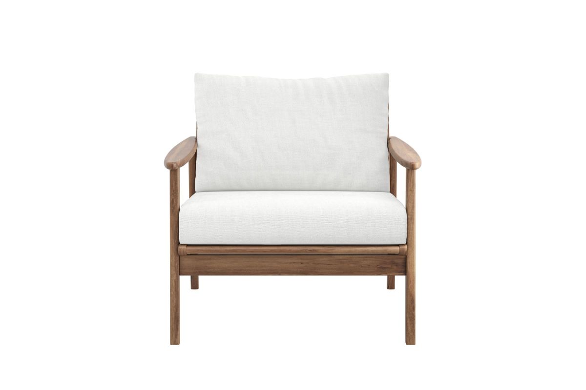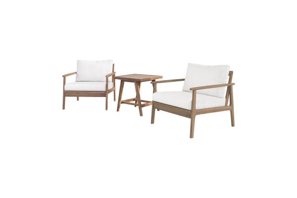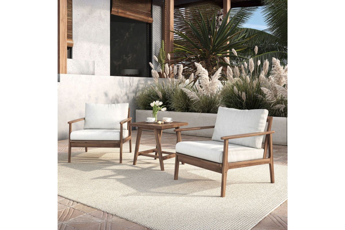 The Ashton 3-Piece Patio Set in natural, featuring two elegant club chairs and a matching end table, offers the perfect blend of durability, comfort, and modern design for any outdoor space. Expertly crafted from FSC-Certified Acacia solid wood, this set provides exceptional strength and natural resistance to the elements, ensuring long-lasting beauty and performance. Its expertly applied light, clear multistep finish enhances the wood’s rich texture and color while adding a protective layer for enhanced durability in any outdoor setting. The club chairs are designed for ultimate comfort with plush, high-density 12cm foam seat and back cushions, upholstered in premium Sundura™ fabric—a solution-dyed 100% polyester that resists fading, mildew, and moisture, maintaining vibrant color and a fresh look season after season. Designed with clean, straight lines, slatted backs, and a low-profile frame, this set delivers sleek, minimalist style with functional elegance. The slatted tabletop adds a timeless touch while promoting water drainage for added practicality. Each piece is truly unique, showcasing natural wood grain variations with distinct patterns and organic details that offer timeless beauty and authentic charm—ensuring no two pieces are exactly alike. Assembly required.