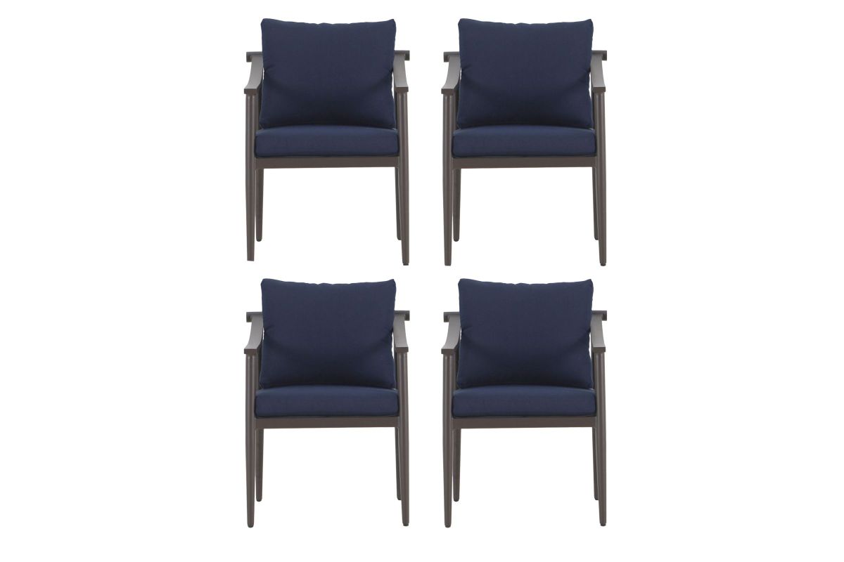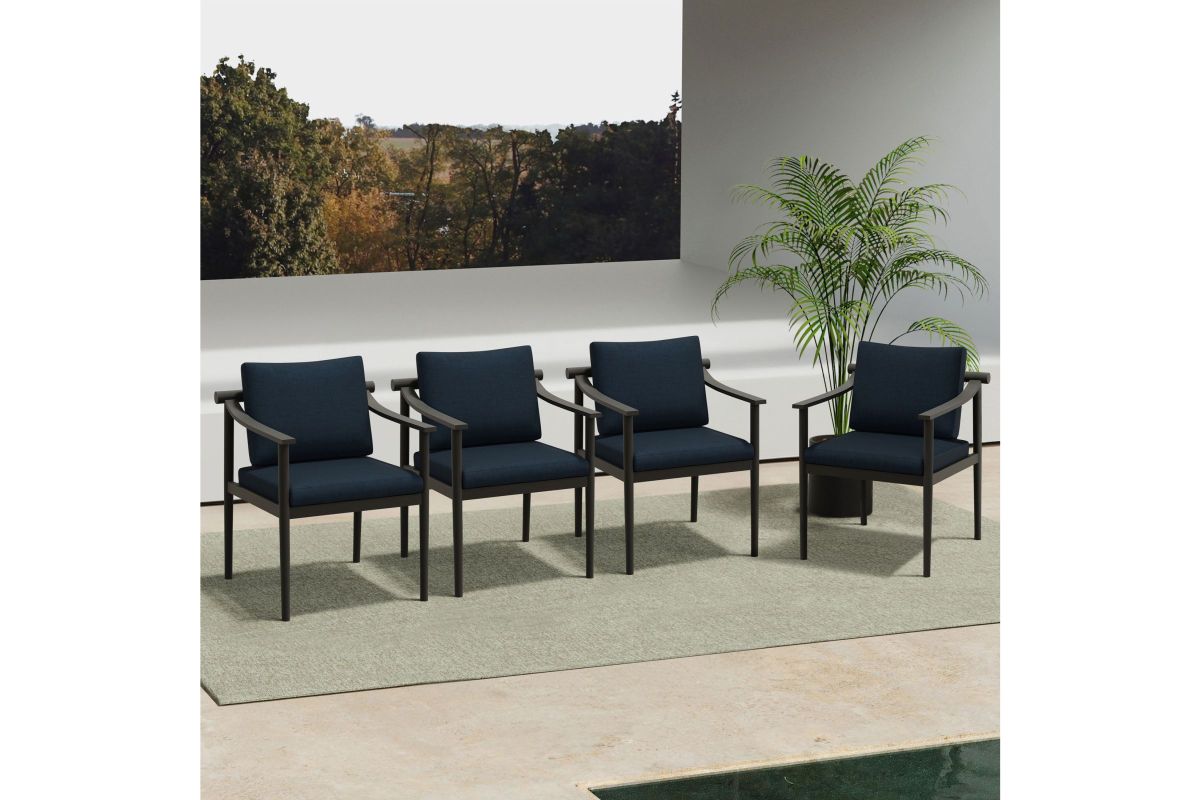 The Moana Patio Dining Side Chairs with Blue Cushions (Set of 4) offer the perfect combination of durability, comfort, and modern elegance for any outdoor dining space. Built with sturdy aluminum frames and a durable baked-on powder coat finish, these chairs provide exceptional strength, scratch resistance, and long-lasting performance. Wrapped in high-density PE wicker, an eco-friendly synthetic resin, they capture the classic look of wicker while being low-maintenance, colorfast, and resistant to water, mildew, and fading. Designed for all-weather durability, the chairs feature plush 6cm high-density foam seat and back cushions upholstered in premium Blue Sundura™ fabric—a solution-dyed 100% polyester that resists fading, mildew, and moisture, keeping the cushions vibrant and fresh season after season. The chairs' modern minimalist design showcases sleek dark frames and clean lines, offering a sophisticated yet understated look that seamlessly complements contemporary outdoor spaces. Whether for casual gatherings or formal dining, these chairs provide lasting comfort and timeless style. No assembly required.