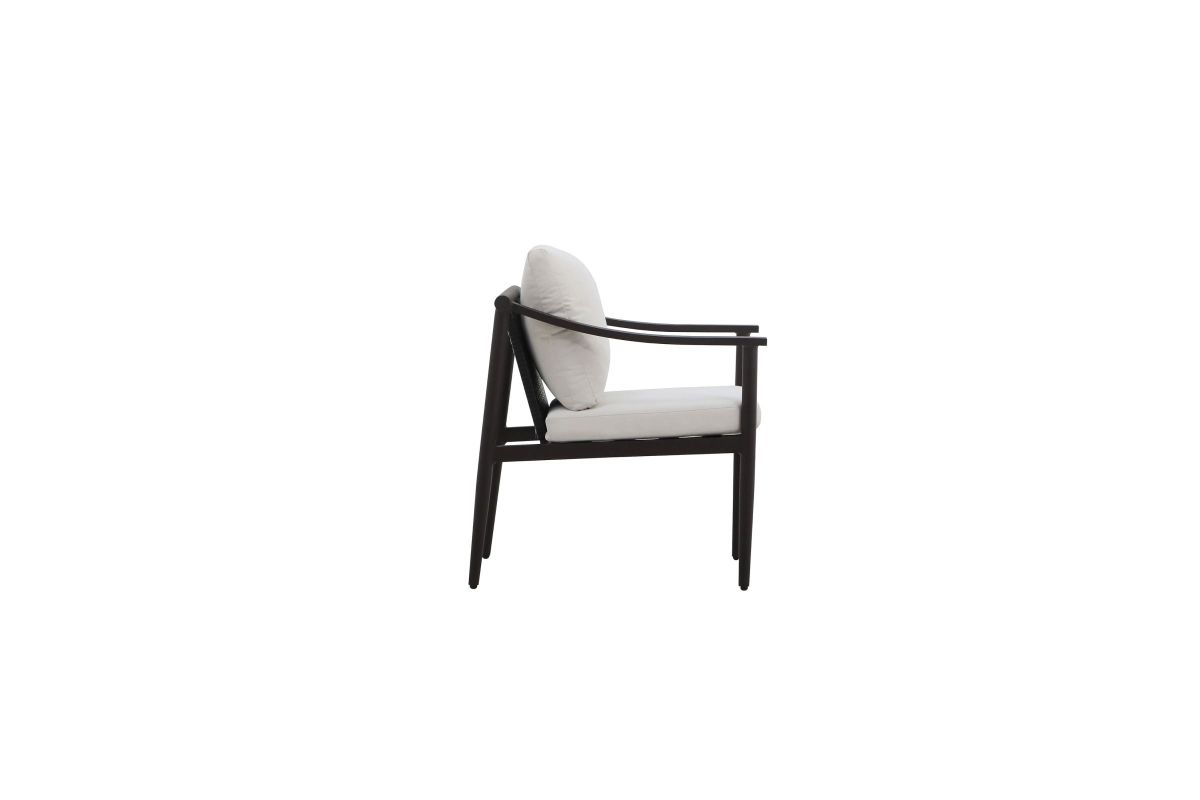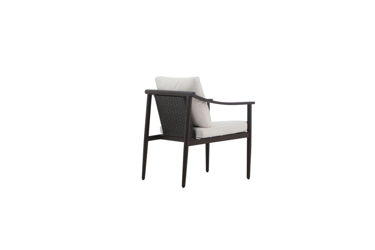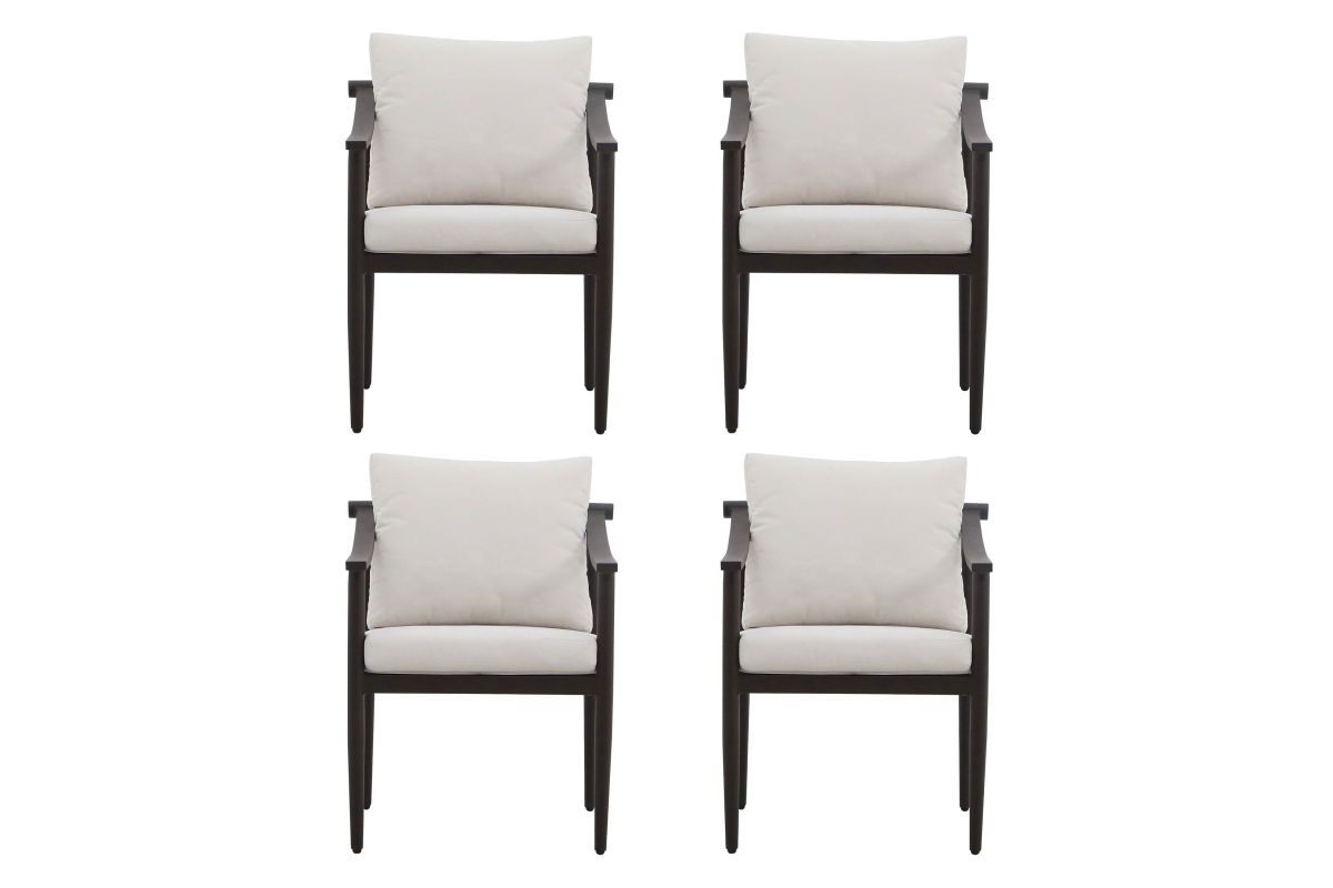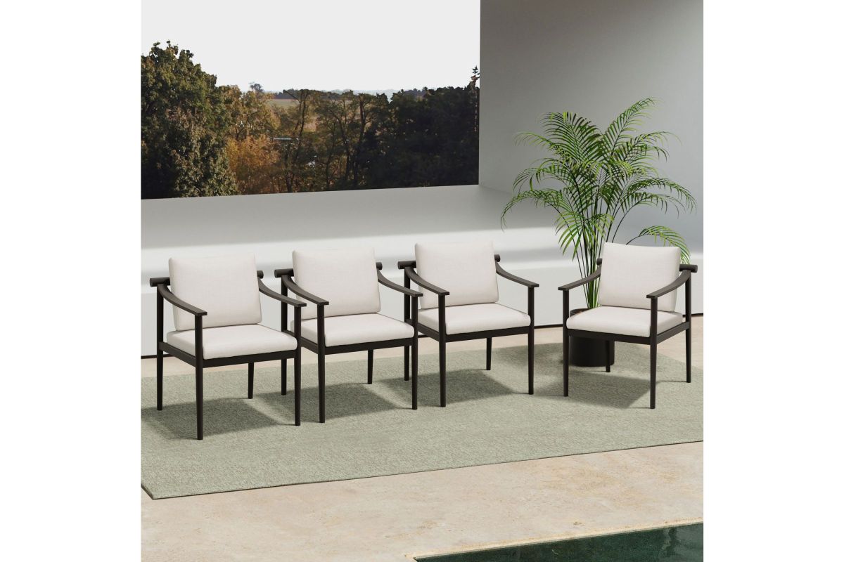 The Moana Patio Dining Side Chairs with Ivory Cushions (Set of 4) offer the perfect combination of durability, comfort, and modern elegance for any outdoor dining space. Built with sturdy aluminum frames and a durable baked-on powder coat finish, these chairs provide exceptional strength, scratch resistance, and long-lasting performance. Wrapped in eco-friendly PE wicker, an eco-friendly synthetic resin, they capture the classic look of wicker while being low-maintenance, colorfast, and resistant to water, mildew, and fading. Designed for all-weather durability, the chairs feature plush 3" high-density foam seat and back cushions upholstered in premium Ivory Sundura™ fabric—a solution-dyed 100% polyester that resists fading, mildew, and moisture, keeping the cushions vibrant and fresh season after season. The chairs' modern minimalist design showcases sleek dark frames and clean lines, offering a sophisticated yet understated look that seamlessly complements contemporary outdoor spaces. Whether for casual gatherings or formal dining, these chairs provide lasting comfort and timeless style. No assembly required.