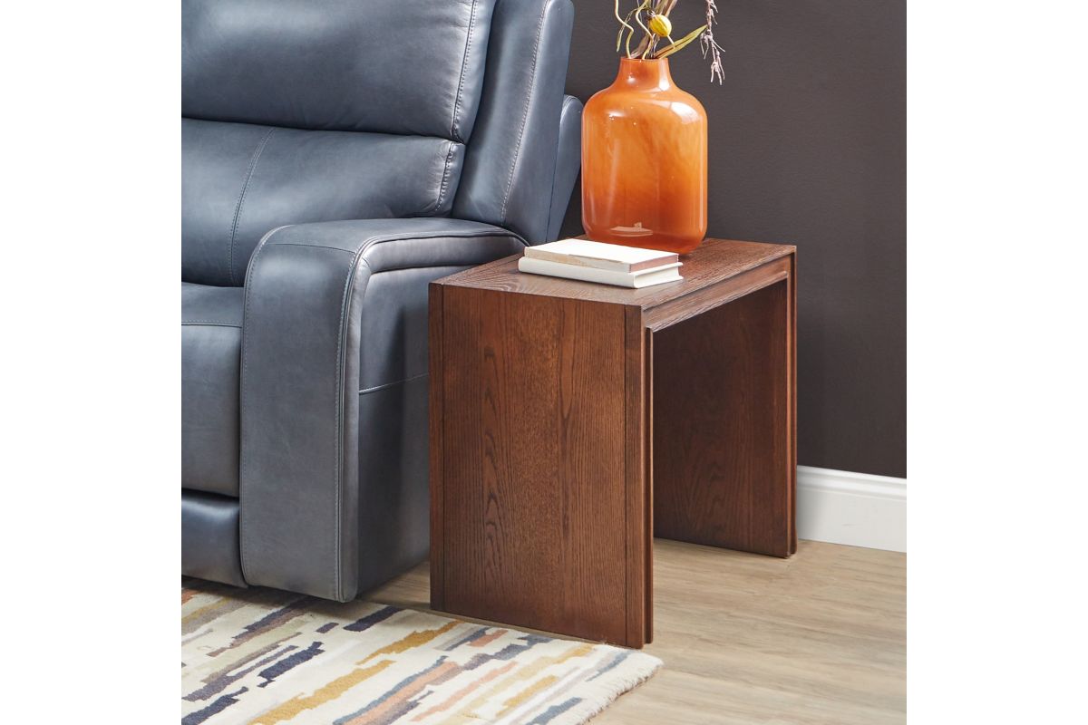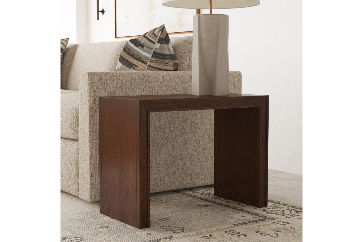 Add effortless style and architectural appeal to your living room with the Waterfall accent table. Featuring a timeless silhouette defined by clean lines and simple geometric shapes, this table is distinguished by its striking waterfall-edge design. Tier this table over the coordinating Waterfall rectangular coffee table for added visual interest and function, or use it alone on its side as a C-table that conveniently nestles against a sofa to keep necessities nearby. The Waterfall accent table is well-crafted from solid rubberwood and oak veneers and features a rich walnut brown finish for lasting beauty.