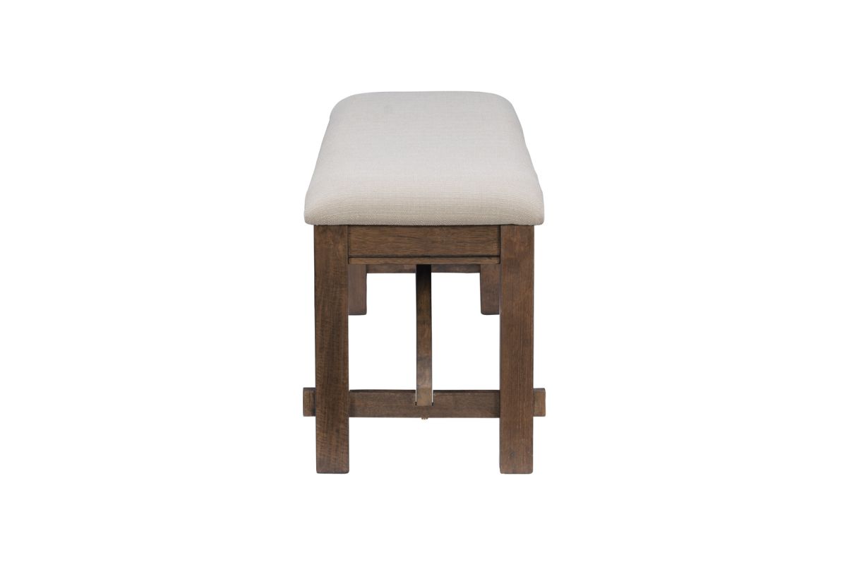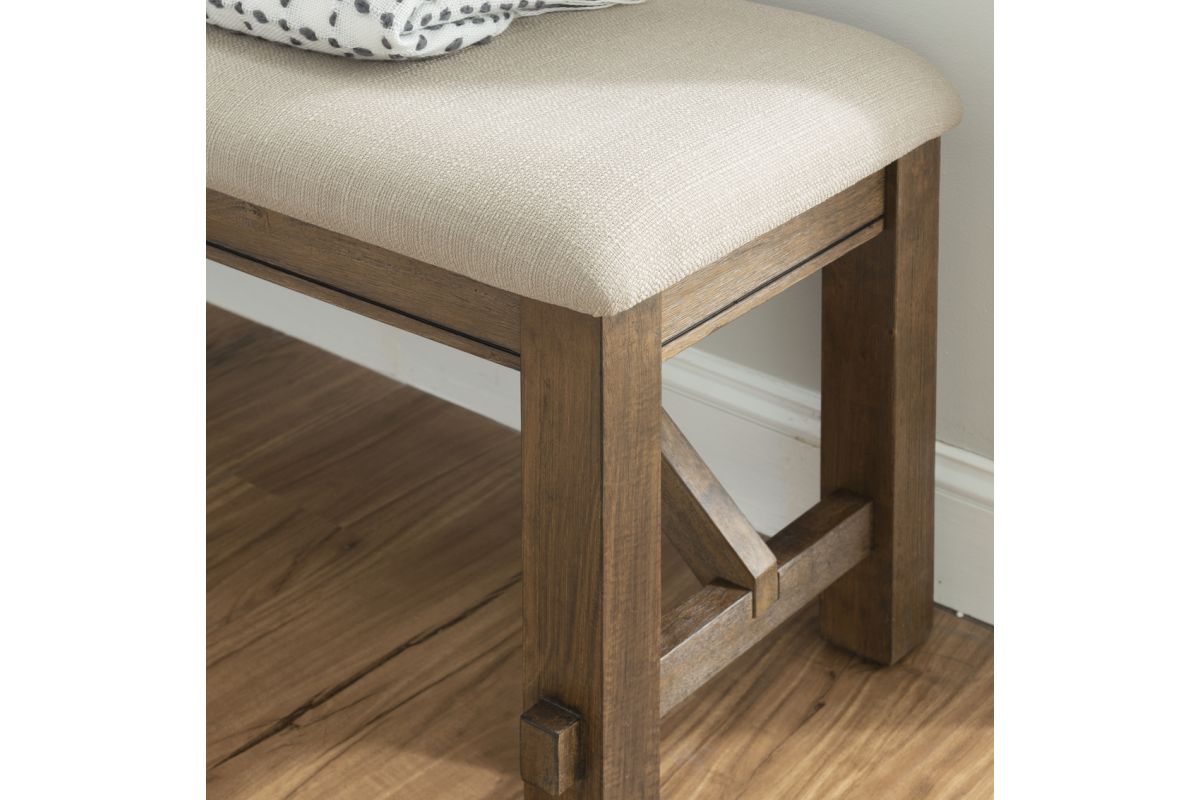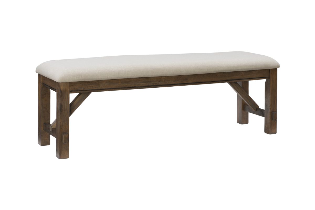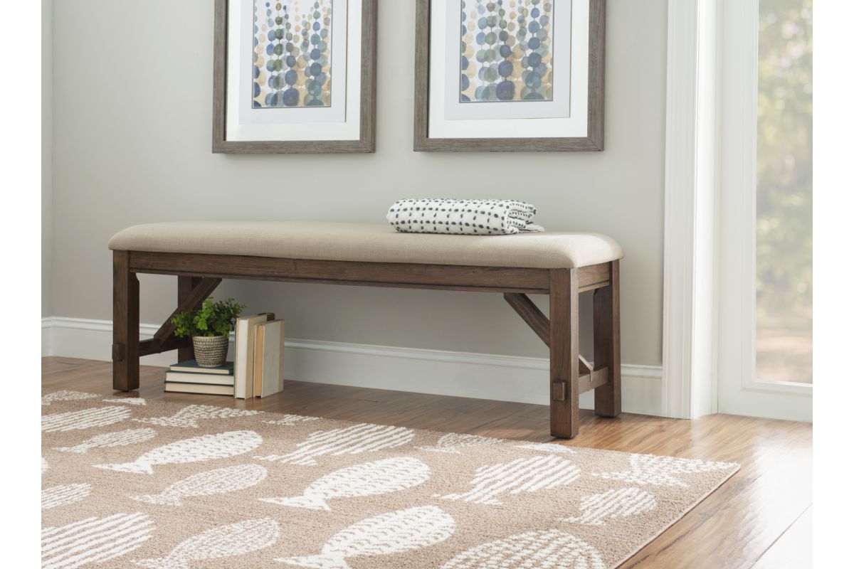 Outfit any room with this perfect bench. It features traditional straight lines and a simplistic style. A solid tan fabric in a basketweave construction covers a plush, comfortable seat. It has a durable rubberwood, mdf and ash veneer construction in a rustic umber finish, which delivers an updated farmhouse vibe. Some assembly required.