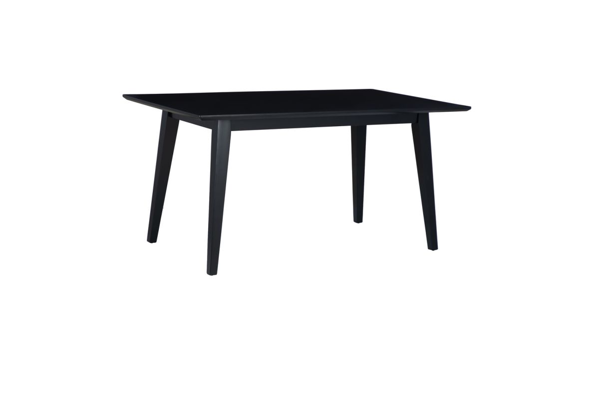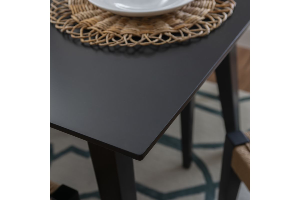 Transform your dining space with this exquisite midcentury dining table, designed to be the focal point of family gatherings. Its tapered legs and reversed beveled edge of the tabletop provide a sleek, functional appearance. Accommodating up to six individuals with ample legroom, the sturdy frame and rubberwood veneer are finished in a chic matte black stain, embracing a modern aesthetic. Elevate your dining experience further with the optional matching set, featuring a dining bench and four chairs, each graced with beautiful handwoven paper rope seating. Assembly required.