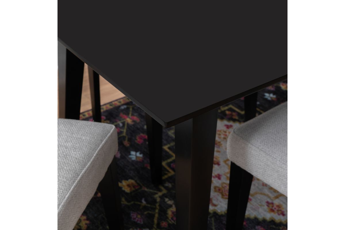Bring balance and sophistication to your dining space with this 5-Piece Dining Set, a clean blend of modern elegance and everyday comfort. The rectangular dining table features a sleek black finish with a subtle sheen and a spacious top crafted with durable rubberwood. Four matching side chairs cradle you in comfort with foam-padded seats, webbing support, and soft light grey polyester upholstery that pops beautifully against the black frame. Whether you're gathering with friends or enjoying a quiet meal at home, this set anchors your space with understated elegance and everyday ease. Assembly required.