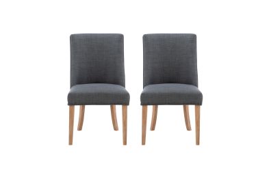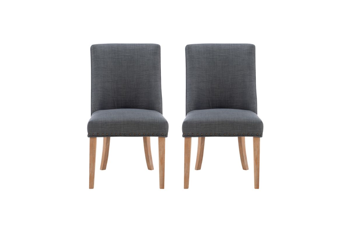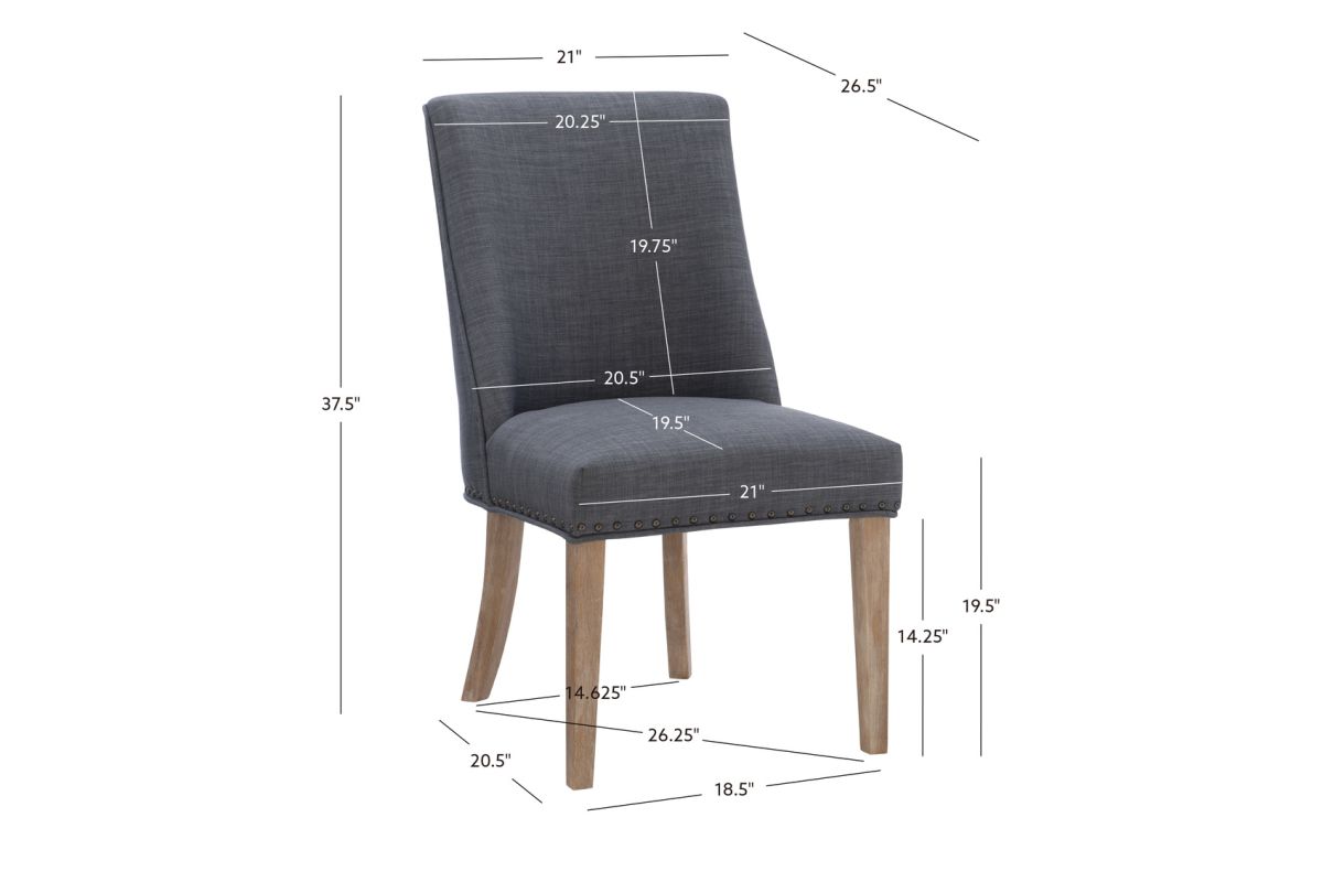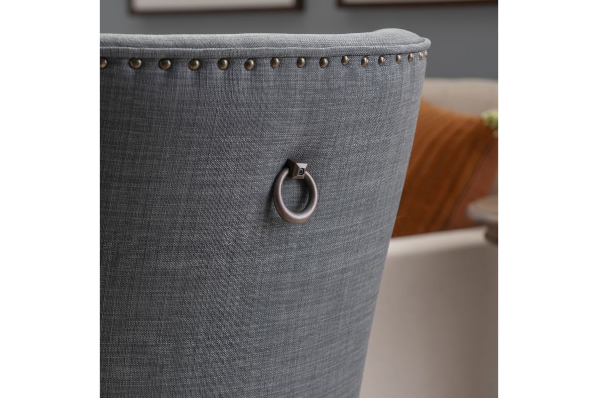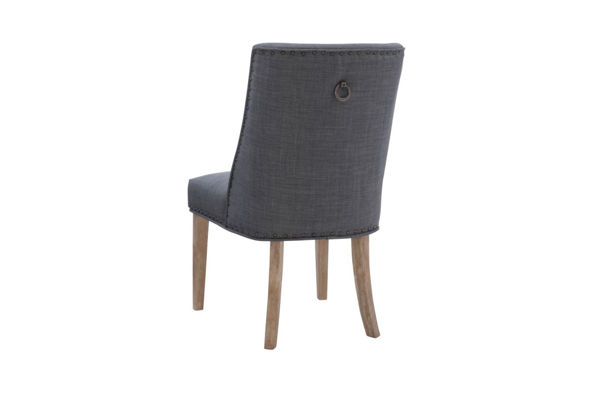 Add elegance to your meals with this sophisticated dining chair. Upholstered in dark grey linen like polyester, it features lovely antiqued bronze nail head trim. The padded seat offers perfect comfort while being easy to clean. An arc shaped backrest adds to the comfort and pleasing design and solid wood legs, finished in a rustic natural, provide stability for hours on end. For a flawless finishing touch, you'll find a decorative chair back ring pull. Assembly required.