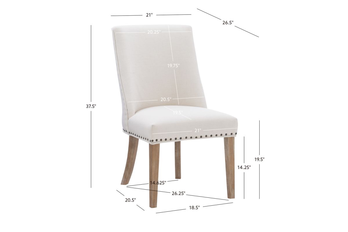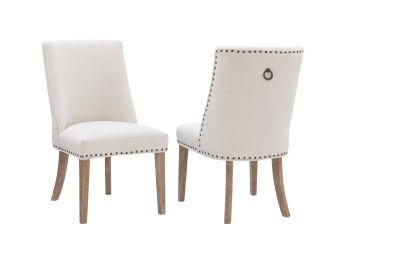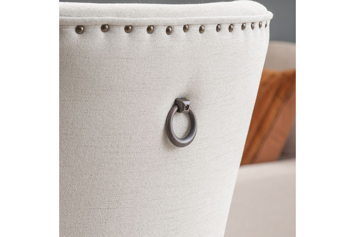 Add elegance to your meals with this sophisticated dining chair. Upholstered in a natural colored linen like polyester, it features lovely antiqued bronze nail head trim. The padded seat offers perfect comfort while being easy to clean. An arc shaped backrest adds to the comfort and pleasing design and solid wood legs, finished in rustic natural, provide stability for hours on end. For a flawless finishing touch, you'll find a decorative chair back ring pull. Assembly required.