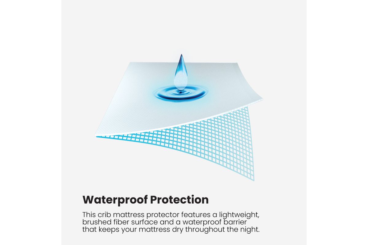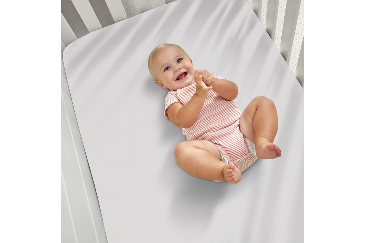 Peace of mind for you, peaceful sleep for your little one. Keep them sleeping comfy, dry, and clean with the breathable and waterproof properties of the iProtect® Crib Mattress Protector. Keep sleep uninterrupted with the silent security of a noiseless waterproof barrier, offering superior protection against common allergens, accidents, spills, and stains, without all the rustle and fuss. With its elastic Powerband® construction, you can rest assured knowing your baby’s bedding stays in place with a snug and secure fit.