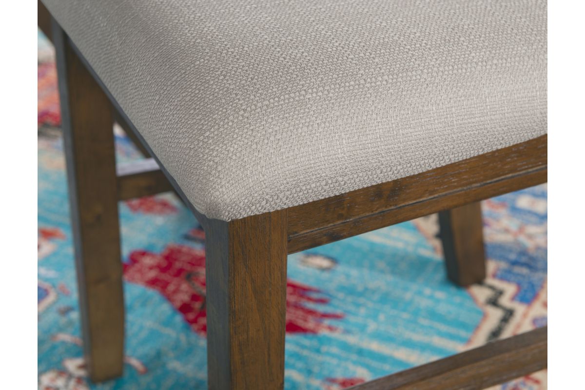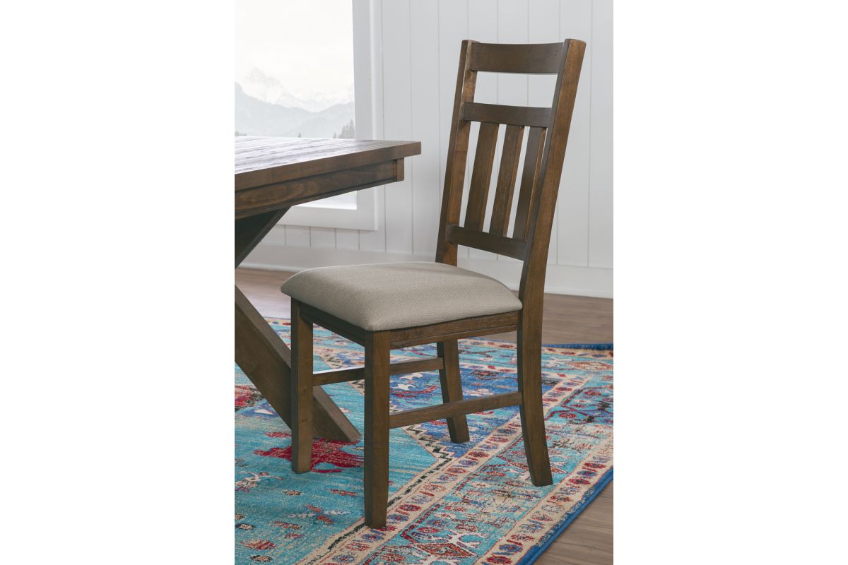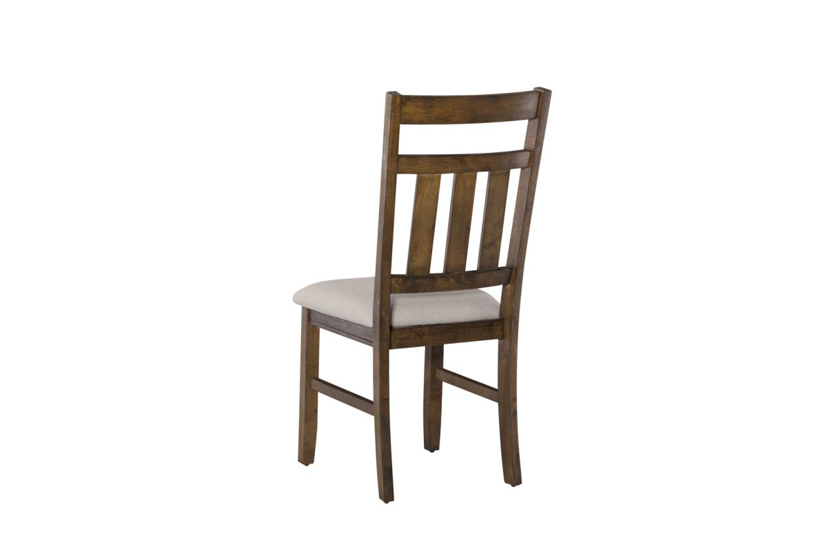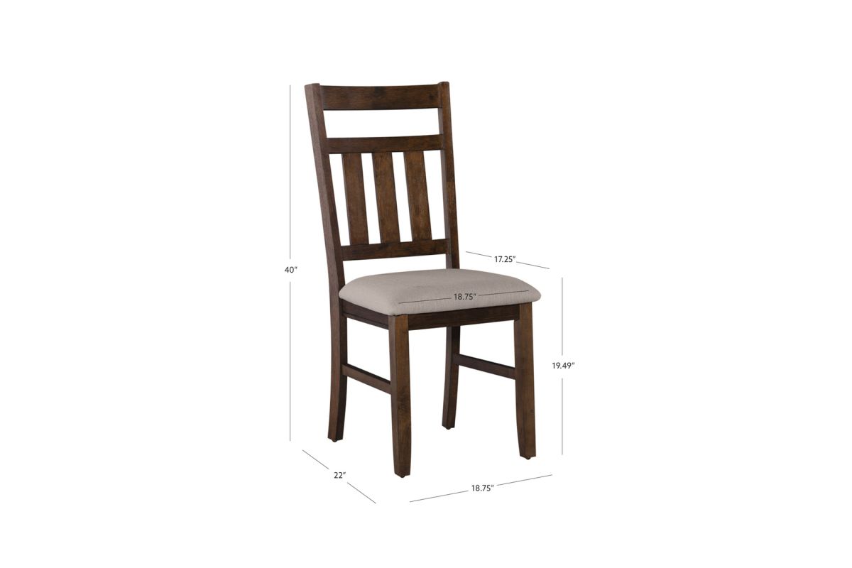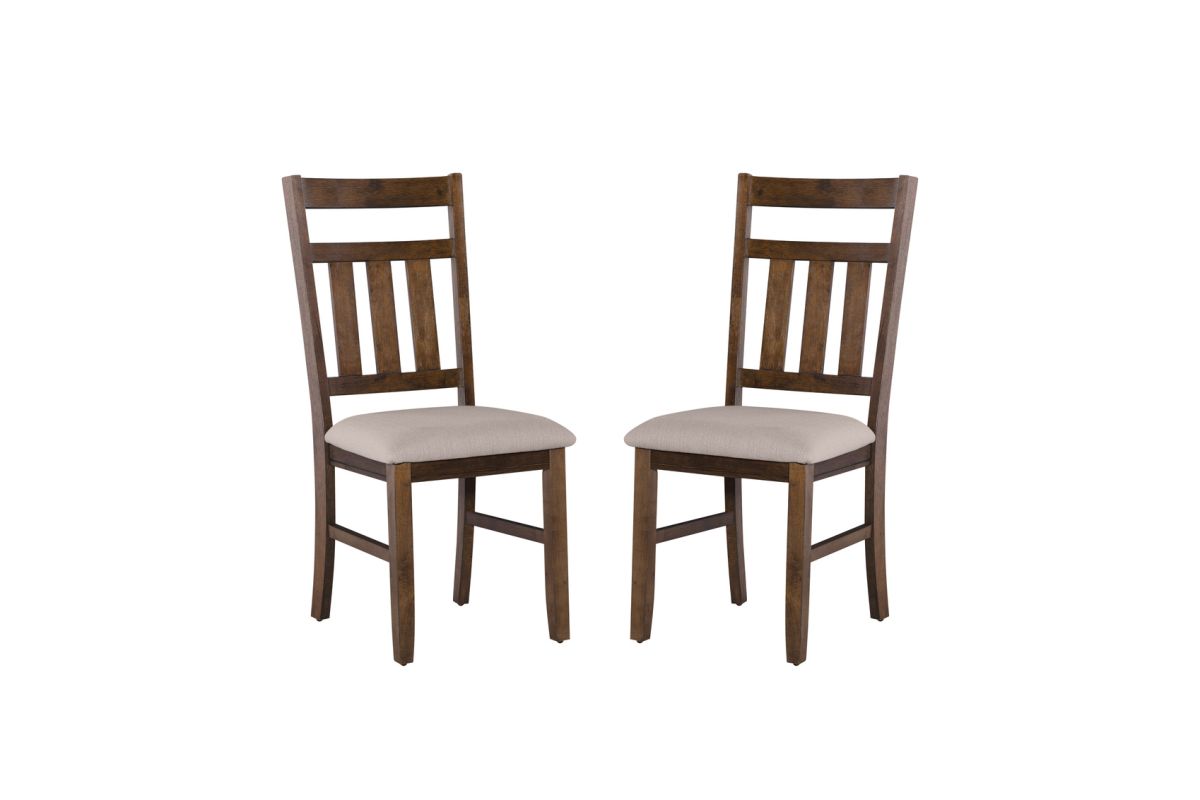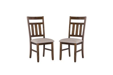 Outfit any room with this perfect 2-piece chair set. It features traditional straight lines and a simplistic slat back style. A solid tan fabric in a basketweave construction covers a plush, comfortable seat. It has a durable rubberwood, mdf and ash veneer construction in a rustic umber finish, which delivers an updated farmhouse vibe. Some assembly required. Priced separately. Two chairs in a carton. Assembly required.