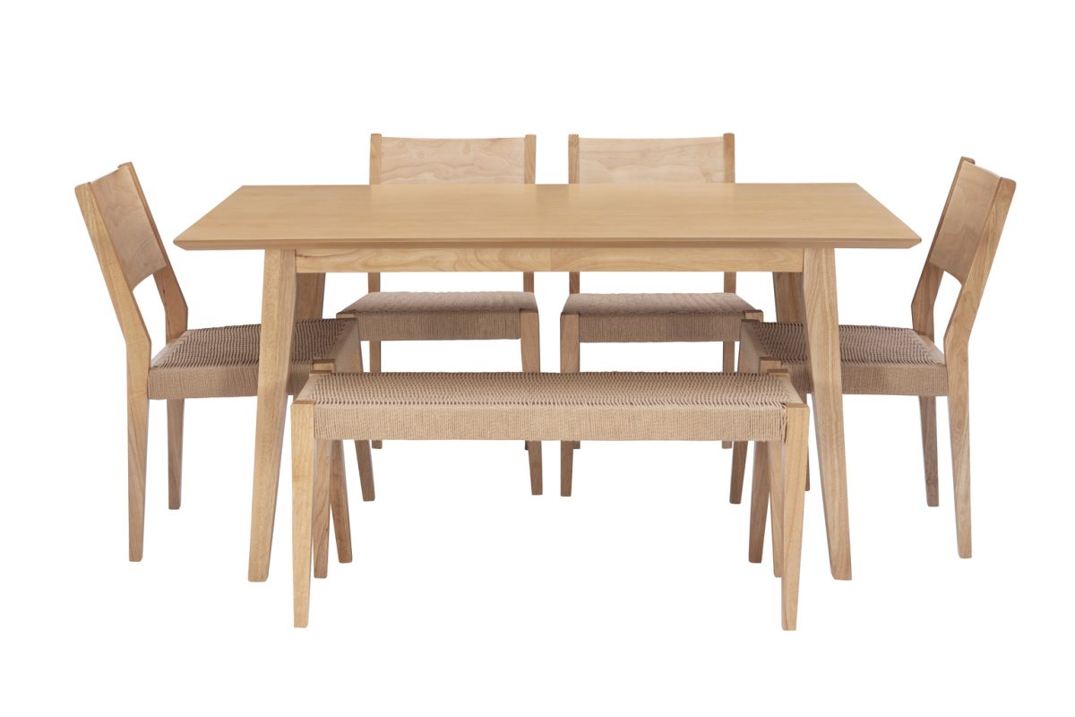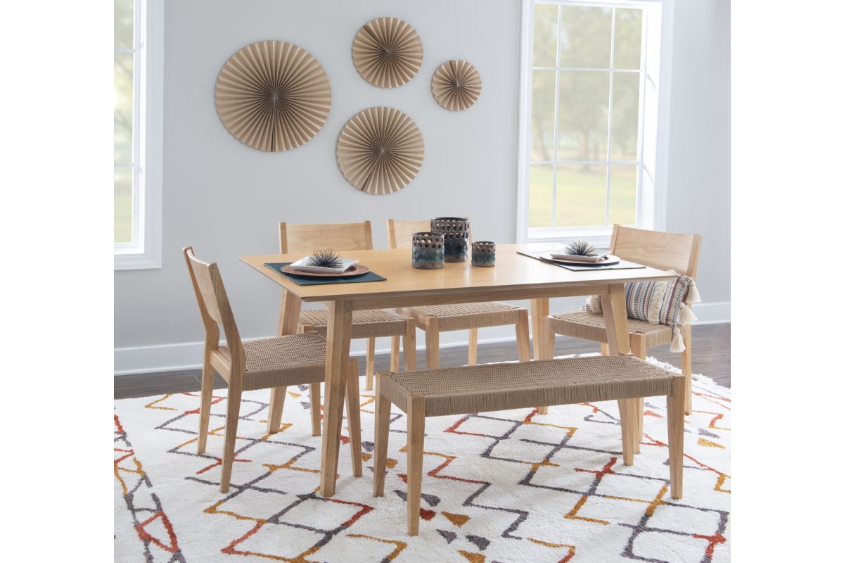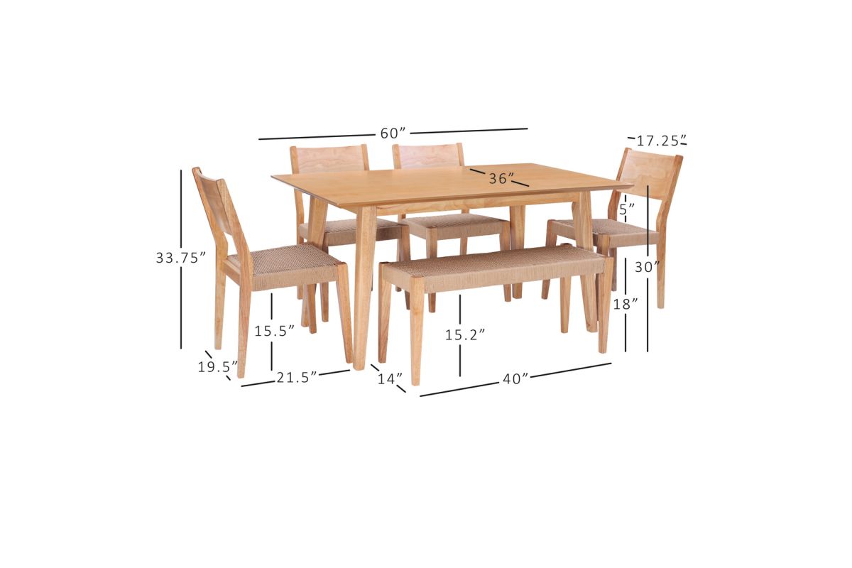 Create an inviting space with this elegant midcentury modern style dining set as the perfect focal point of family gatherings. Sleek silhouettes capture the grace and simplicity of the classic design movement, while handwoven rope seats infuse a rustic and welcoming atmosphere. Offering ample table space for six, this set is comprised of a 36" x 60" table, four chairs and a bench featuring a beautiful basketweave pattern. All pieces are adorned with a natural stain and crafted from solid wood, ensuring long-term durability for your dining enjoyment. Assembly required.