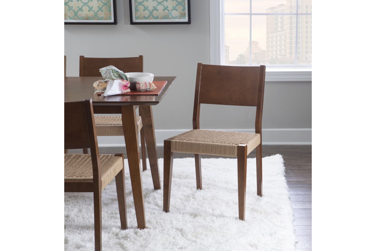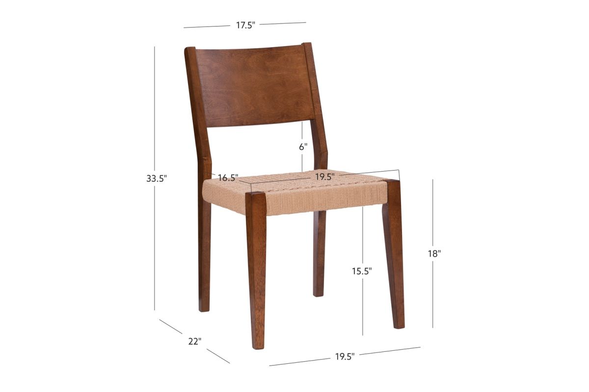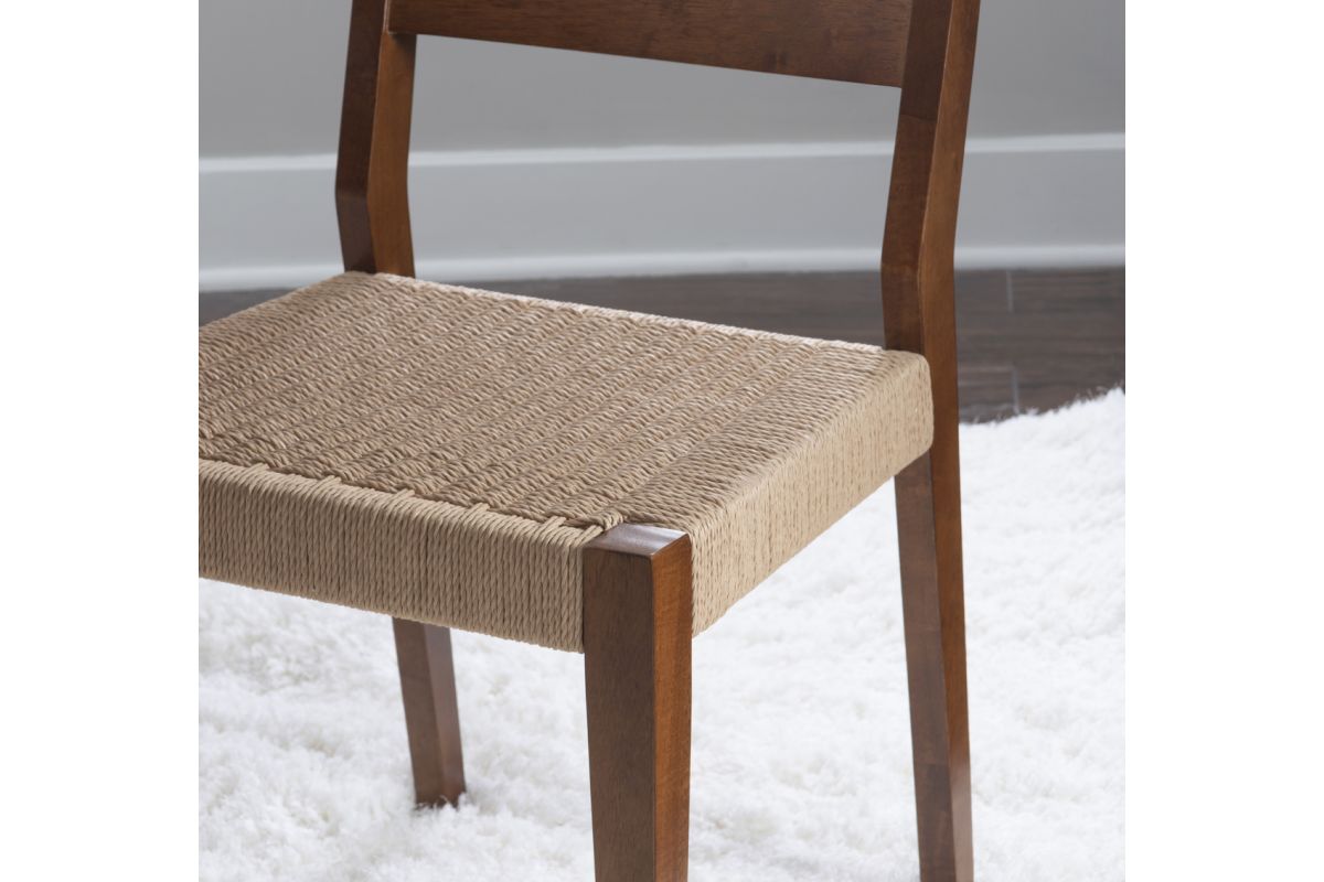 The sleek silhouette of this dining chair embodies the grace and simplicity of midcentury design, while the handwoven seat infuses a more welcoming rustic element. This unique blend of styles is further accentuated by the backrest; curved for comfort and stained in warm brown tones for a smooth finish. The chair stands on a set of solid wood legs and arrives in a set of two. A matching bench and table can be purchased to complete your midcentury dining ensemble. Assembly required.