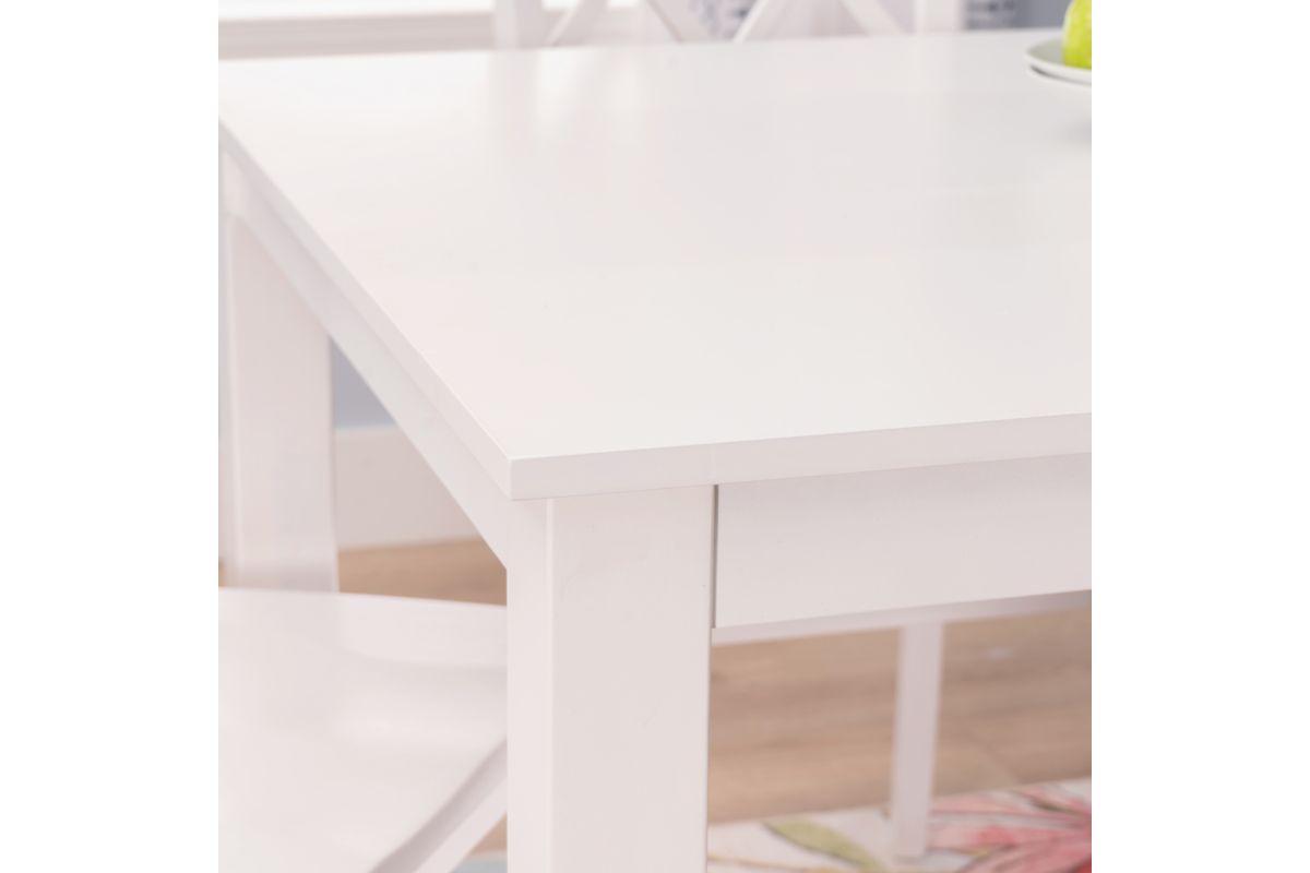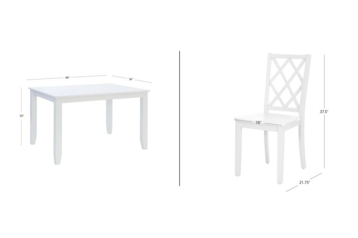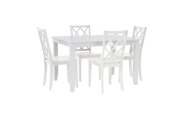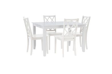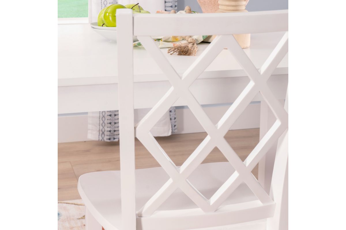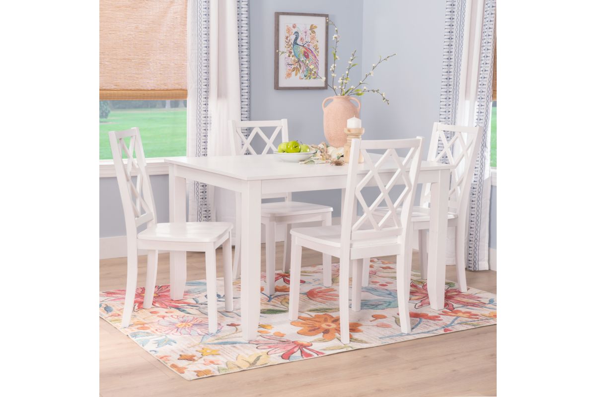 Create a charming, welcoming atmosphere in your dining space with this elegant 5-piece set. Featuring a sturdy rectangular table and 4 matching chairs, each piece is finished in a classic white that brings a fresh, breezy feel to any room. The chairs showcase a lattice-back design that adds a touch of timeless sophistication while keeping the look light and open. Crafted from durable wood and MDF, this set is designed to withstand daily meals, gatherings, and cozy conversations. Perfect for kitchens, dining rooms, or breakfast nooks, this set serves as a cohesive foundation for traditional and contemporary homes. Assembly required.