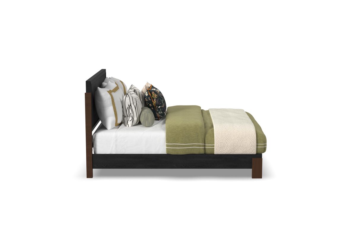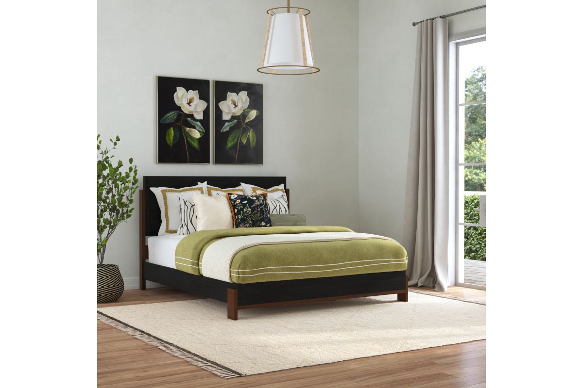 Add effortless style and architectural appeal to your bedroom with the Waterfall King panel bed. This platform-style bed features a timeless silhouette defined by clean lines and simple geometric shapes. Dark brown-finished base accents add a striking contrast to the deep ebony finish, while the clean, rich headboard brings an element of softness to the aesthetic. Expertly crafted from solid rubberwood and oak veneers, the Waterfall King bed offers lasting beauty you can feel good about. Assembly is required upon delivery.