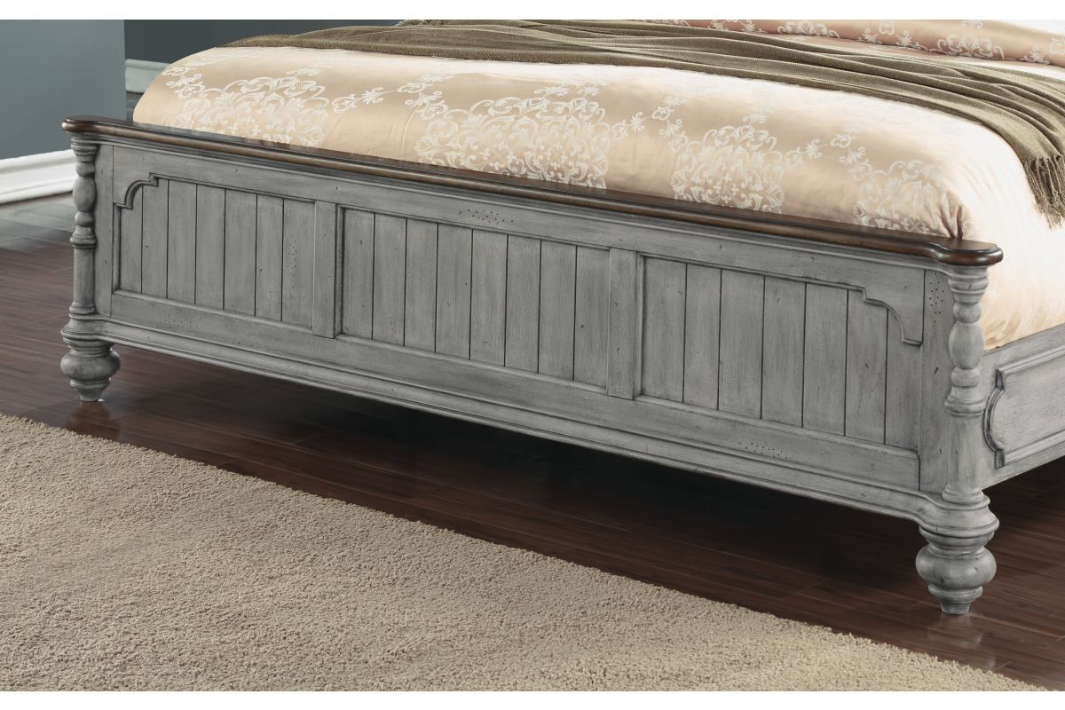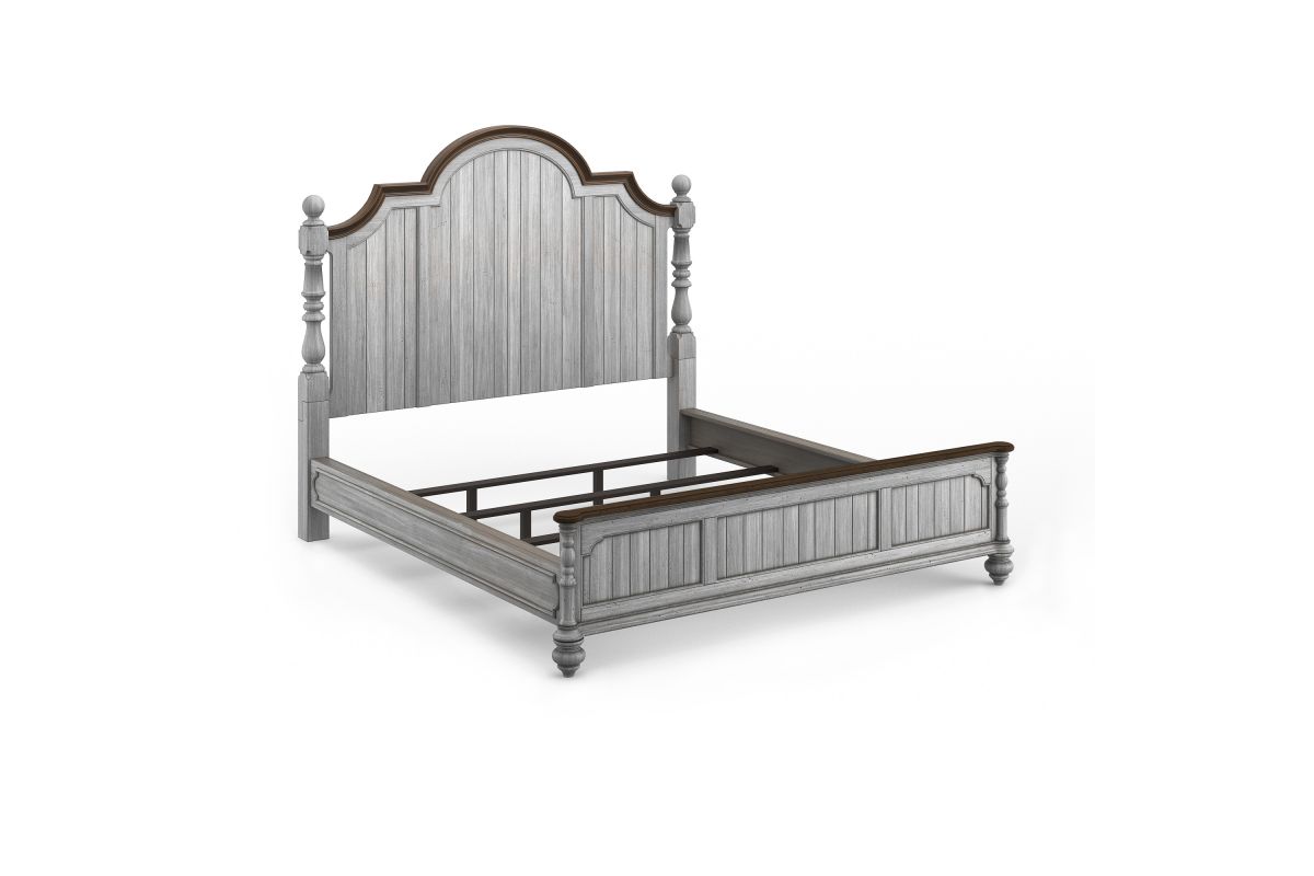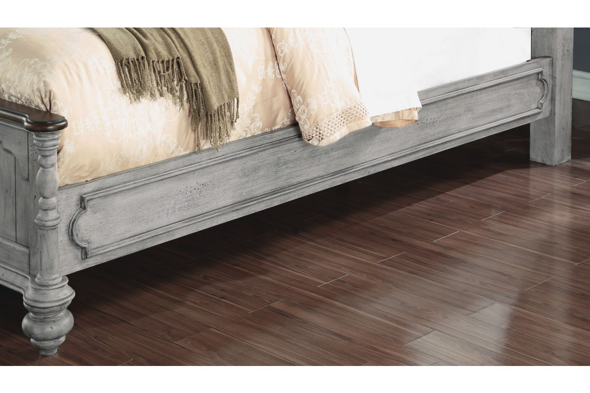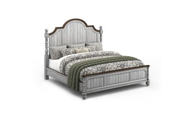 Drift off to sleep in the cozy, cottage-style Plymouth Poster Bed, featuring charming, paneled accents and detailed molding on the headboard and footboard. Available in King size as well as Queen and California King sizes, this bed is crafted with high-quality construction, ensuring it can be enjoyed for generations to come. The graceful, scalloped profile of the headboard and intricately carved posts make this bed a statement piece. Finished in a distressed graywash highlighted by contrasting medium brown accents, the Plymouth poster bed brings warmth and character to any bedroom. Assembly is required upon delivery.