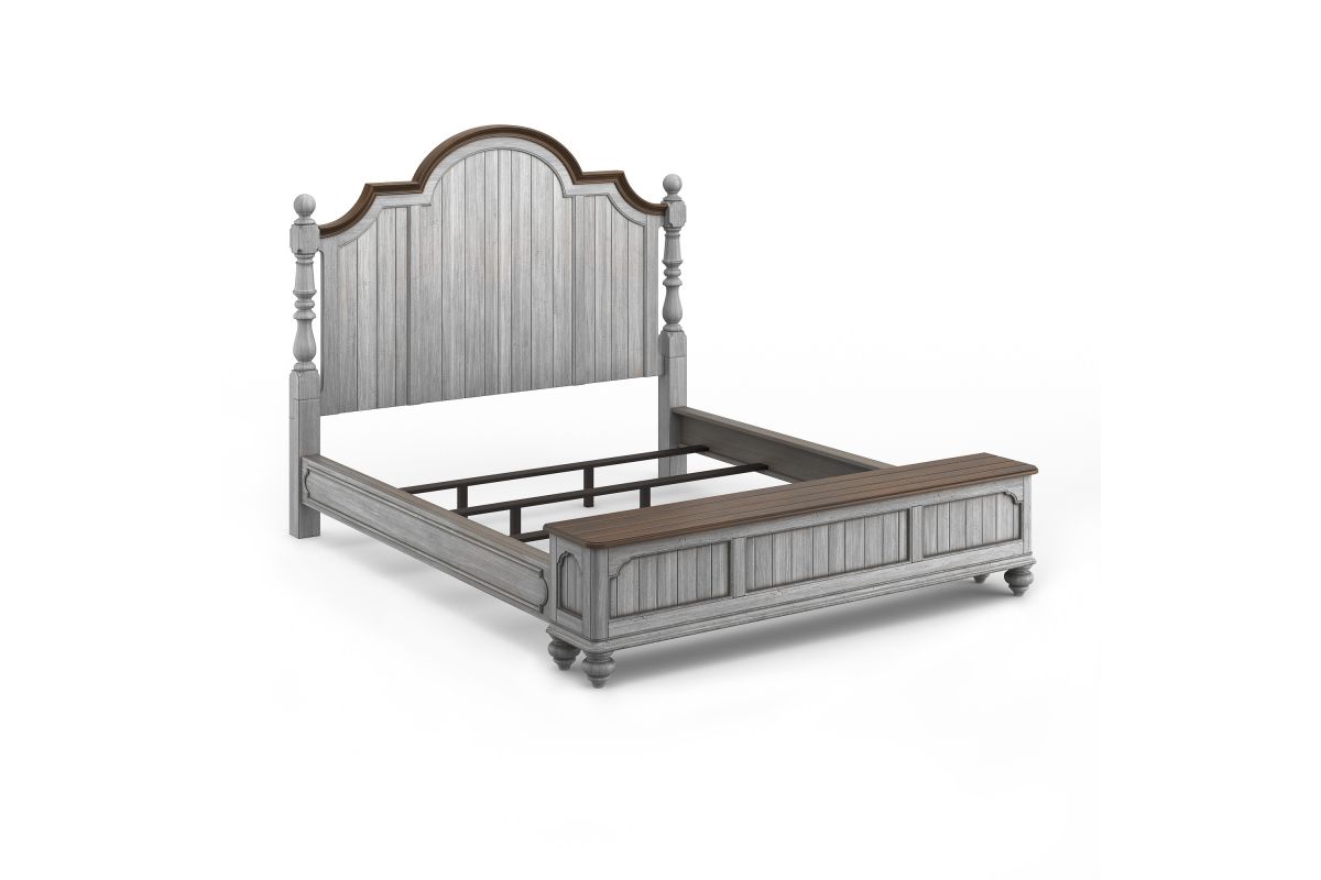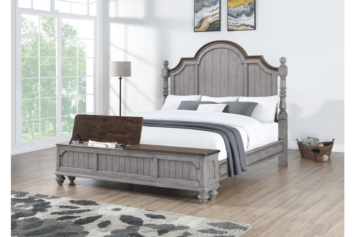 Drift off to sleep in the cozy, cottage-style Plymouth Poster Storage Bed, featuring charming, paneled accents and detailed molding on the headboard and footboard. Available in King size as well as Queen and California King sizes, this bed is crafted with high-quality construction, ensuring it can be enjoyed for generations to come. The graceful, scalloped profile of the headboard and intricately carved posts make this bed a statement piece. The paneled footboard offers concealed, roomy storage for blankets, pillows or clothes, and provides a convenient place to perch while you put on your shoes. Finished in a distressed graywash highlighted by contrasting medium brown accents, the Plymouth poster bed brings warmth and character to any bedroom. Assembly is required upon delivery.