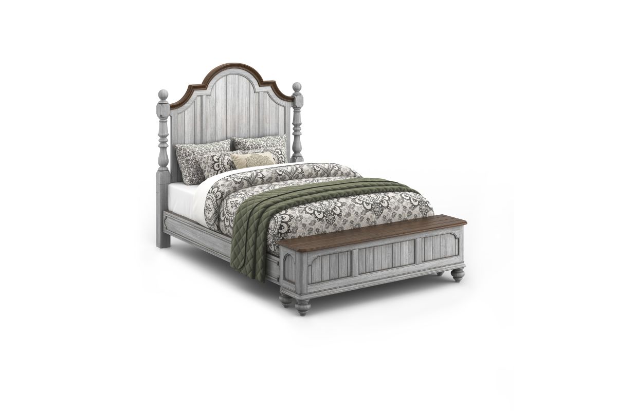 Drift off to sleep in the cozy, cottage-style Plymouth Poster Storage Bed, featuring charming, paneled accents and detailed molding on the headboard and footboard. Available in Queen size as well as King and California King sizes, this bed is crafted with high-quality construction, ensuring it can be enjoyed for generations to come. The graceful, scalloped profile of the headboard and intricately carved posts make this bed a statement piece. The paneled footboard offers concealed, roomy storage for blankets, pillows or clothes, and provides a convenient place to perch while you put on your shoes. Finished in a distressed graywash highlighted by contrasting medium brown accents, the Plymouth poster bed brings warmth and character to any bedroom. Assembly is required upon delivery.