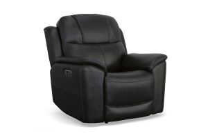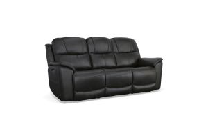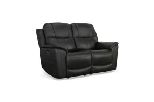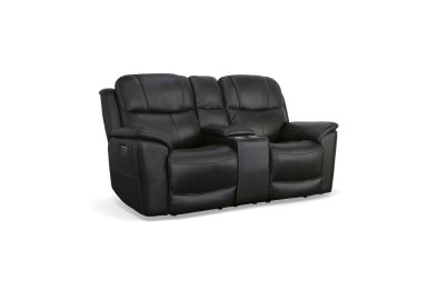 Superior ergonomics combine with the plush comfort of the Crew leather power reclining loveseat with console. Featuring triple power functionality that allows for independent adjustment of the headrests, lumbar supports and recline, this loveseat also features Zero Gravity which reduces pressure and tension on the body. Enjoy reliable comfort all day, every day, with pad-over armrests, waterfall chaise footrests, thin layered headrests, and divided back cushions. Built-in USB ports conveniently charge mobile devices while a center storage console keeps remotes and beverages nearby so you can settle in for a marathon movie night. With Flexsteel's patented Blue Steel Spring™ at the heart of each seat, and high-quality raven black leather, the Crew power reclining loveseat brings exceptional beauty and durability to your home.