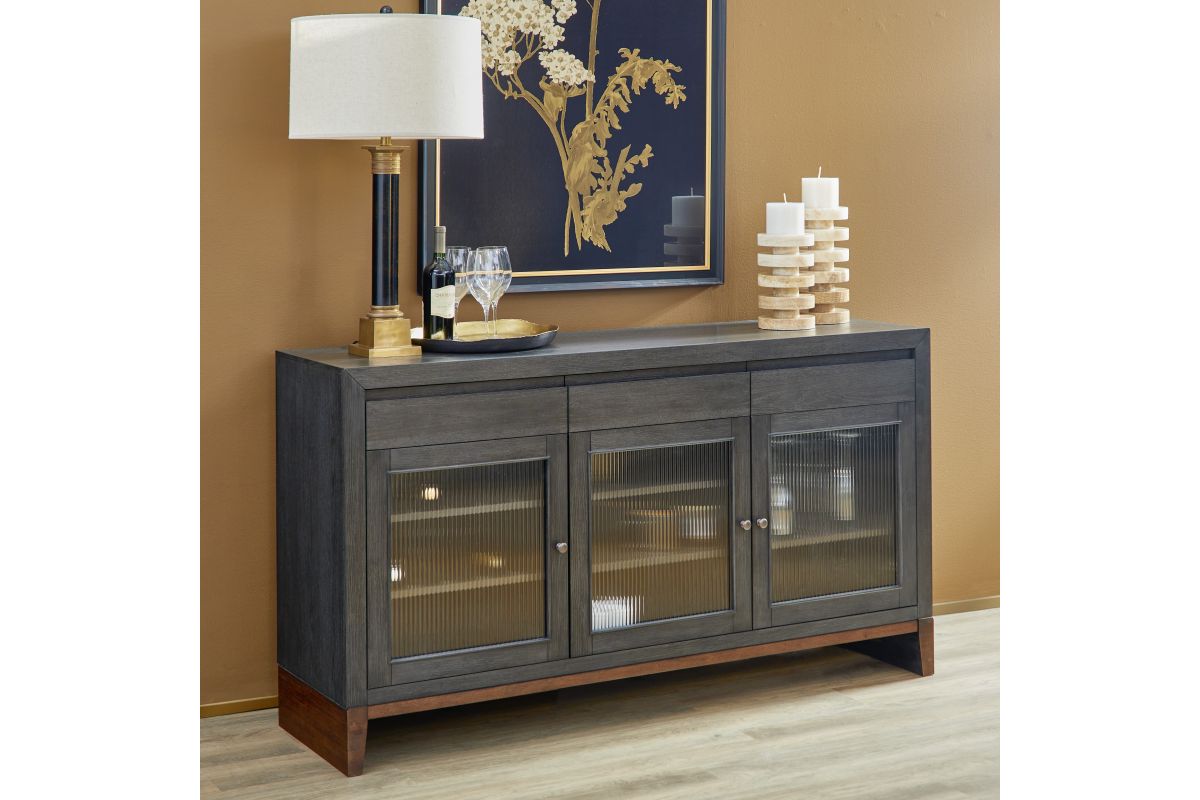 The perfect centerpiece for your transitional space, this gorgeous buffet piece packs all the style and storage you need. The deep ebony finish fits seamlessly with the rich brown base accents for an on-trend color combination. With three gorgeously receded glass front cabinets, adjustable shelves, and ample wine shelves, this piece delivers on style and storage. The decadent gleaming copper hardware brings an antique touch, making this buffet the showstopper in any space.