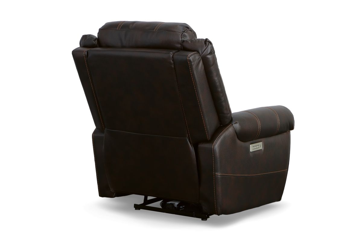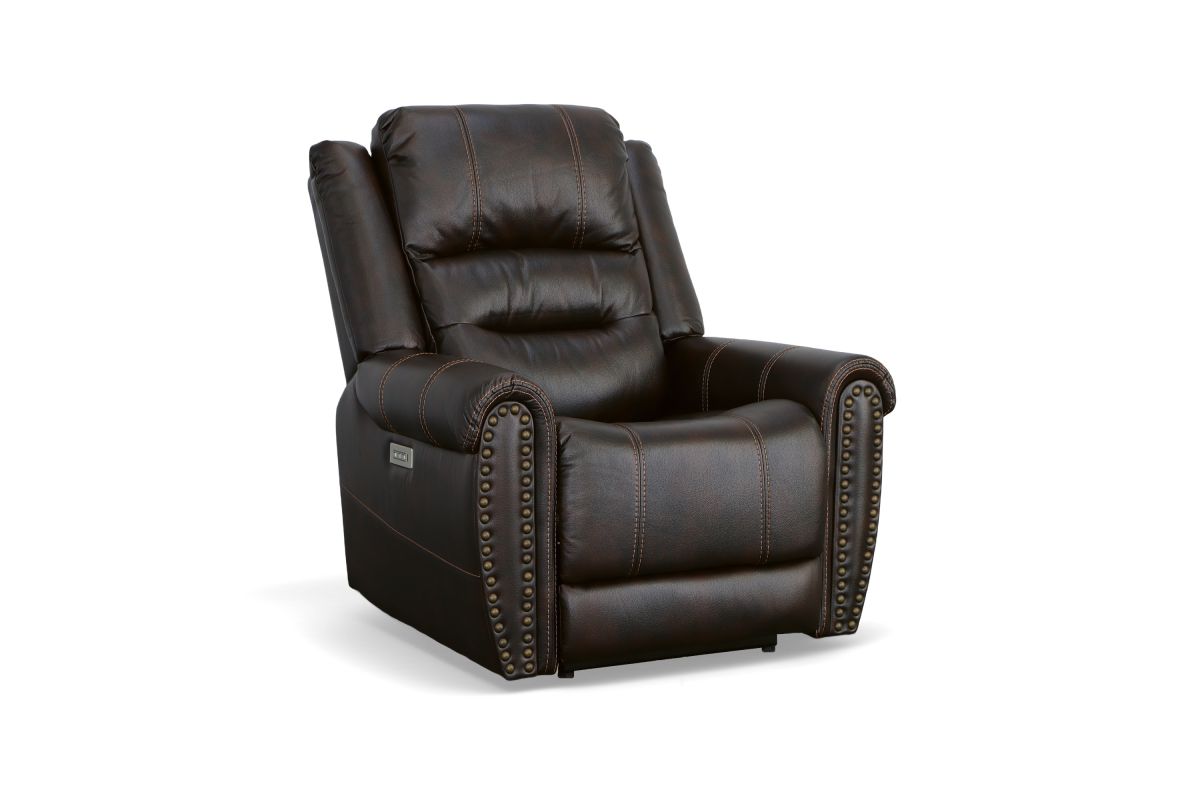 The generous padding and heavy-thread stitching detail of the Oscar power recliner with power headrest instantly grabs your attention and welcomes you to take a seat. Nailhead trim traces the edges of the arm fronts to highlight the welcoming silhouette, while an extended footrest provides additional leg rest space for taller users. Customize your sit with power recline and headrest that can be adjusted at the touch of a button. Outfitted in a dark, molasses brown fabric, this recliner brings a leather look to your room with the softness and comfort of fabric.