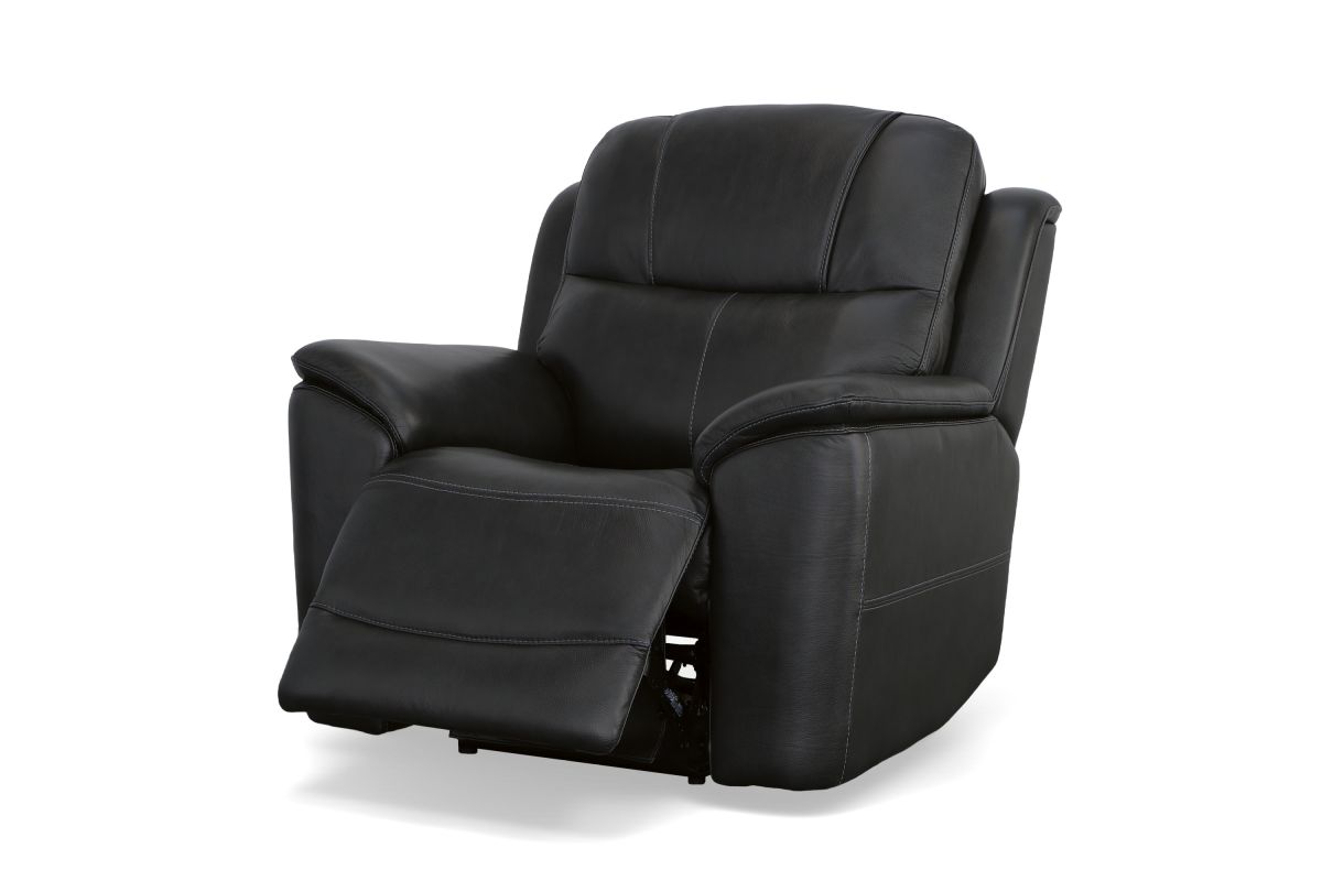 Superior ergonomics combine with the plush comfort of the Crew leather power recliner. Featuring triple power functionality that allows for independent adjustment of the headrest, lumbar support and recline, this recliner also features Zero Gravity which reduces pressure and tension on the body. Enjoy reliable comfort all day, every day, with pad-over armrests, a waterfall chaise footrest, a thin layered headrest, and divided back cushion. Built-in USB ports conveniently keep mobile devices charged and ready to stream your favorite shows. With Flexsteel's patented Blue Steel Spring™ at the heart of the seat, and high-quality raven black leather, the Crew power recliner brings exceptional beauty and durability to your home.