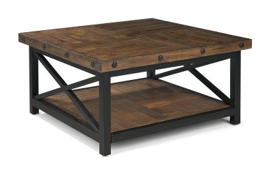 Transform your living room into a casual, modern rustic haven with the Carpenter square coffee table. A roomy top keeps cocktails and snacks conveniently close at hand, while an open lower shelf provides additional space for books or décor. Made with acacia wood, this coffee table features a well-worn look that is highlighted by a dark brown finish. Other design details include wood planks that are distressed for a reclaimed look, hand-worked metal frames and exposed bolt heads.
