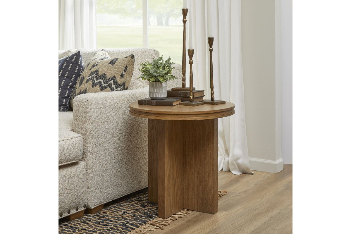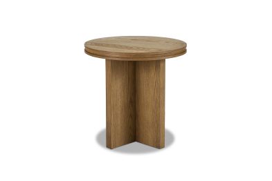 Add effortless style and architectural appeal to your living room with the Waterfall round end table. This striking table features a timeless silhouette defined by clean lines and simple geometric shapes, including a substantial sculptural crisscross base that supports the top. Group and nest this table with the coordinating Waterfall round coffee table for added visual interest and function. The Waterfall round end table is well-crafted from solid rubberwood and oak veneers and features a warm, light oak finish for lasting beauty.