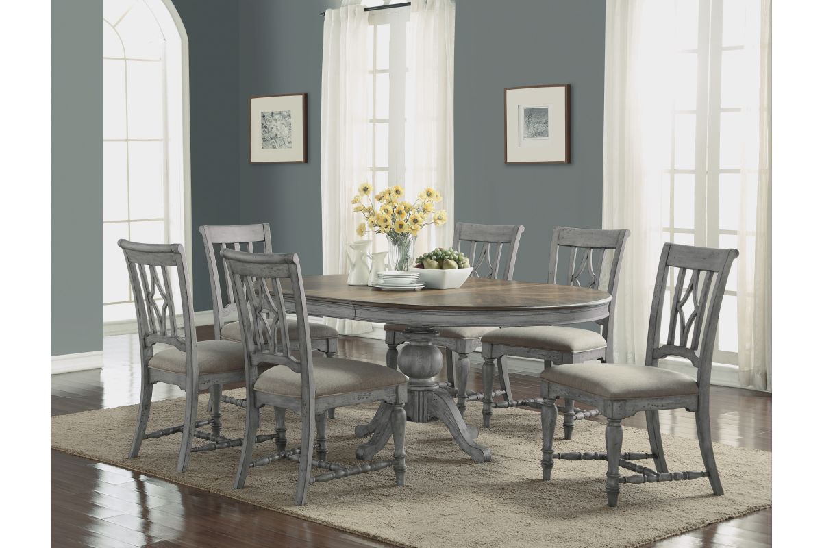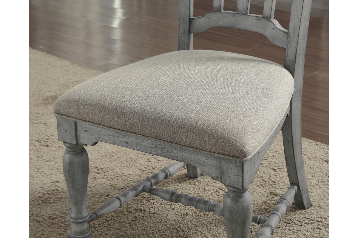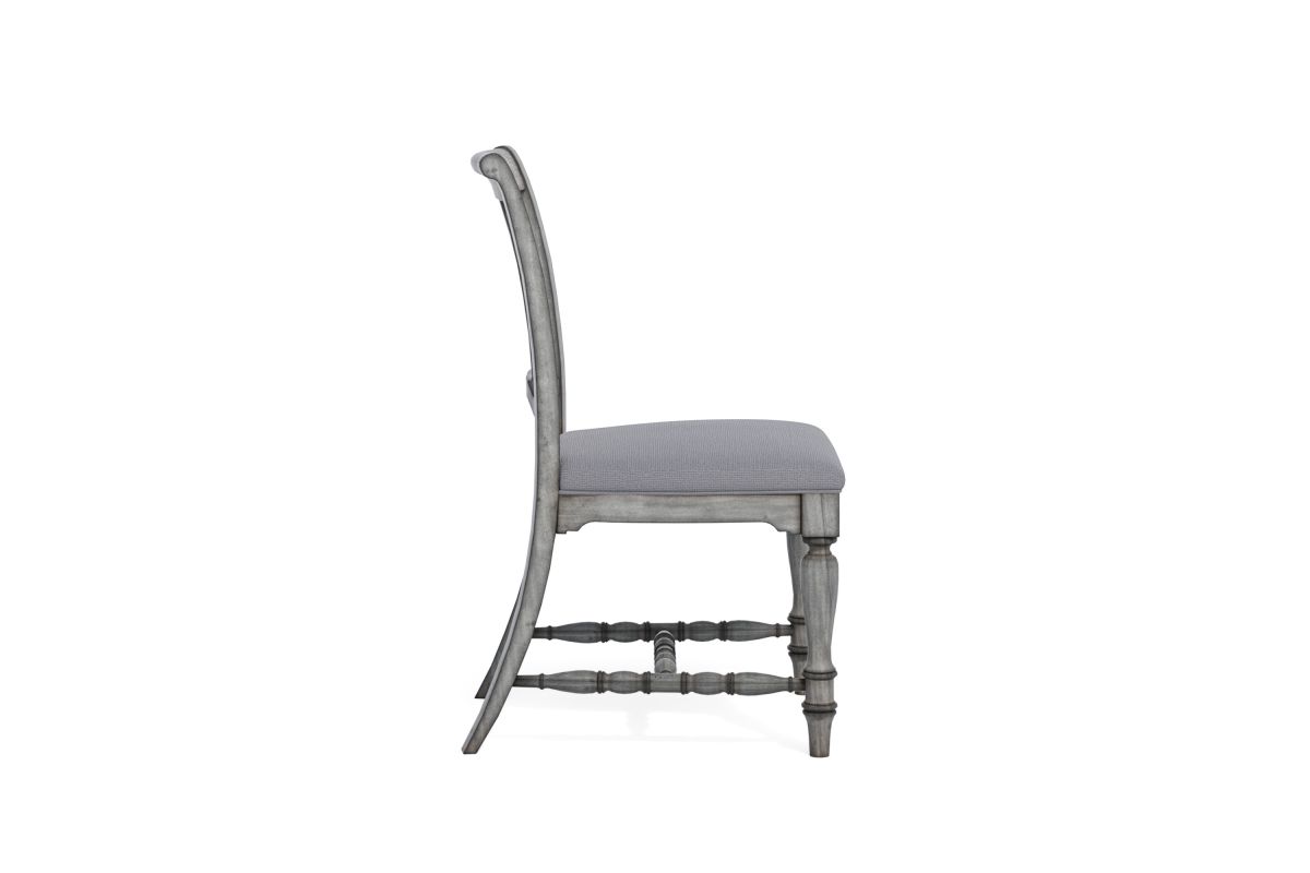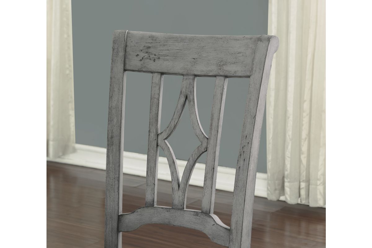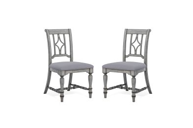 Designed to complement our Plymouth dining tables with a coordinating cottage look, this charming dining chair features an appealing open back design with a diamond-shaped detail, intricately carved trestles and turned legs for added vintage character. Available in a weathered graywash finish, each chair is upholstered in a durable and cleanable coordinating fabric, providing comfort for long periods of sitting. Chairs are sold as a set of two.