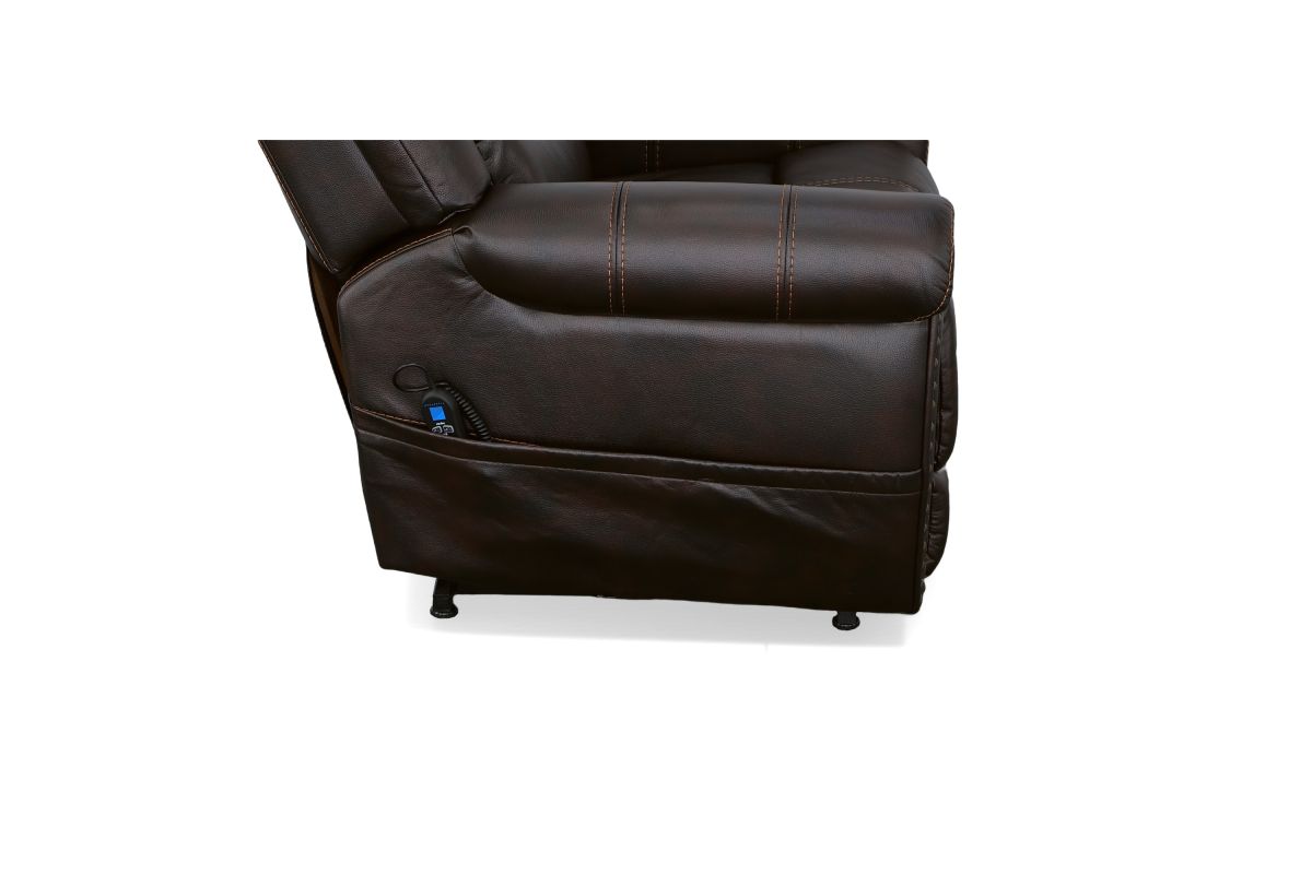 The generous padding and heavy-thread stitching detail of the Oscar power lift recliner with power headrest instantly grabs your attention and welcomes you to take a seat. Nailhead trim traces the edges of the arm fronts to highlight the welcoming silhouette, while an extended footrest provides additional leg rest space for taller users. Customize your sit with power recline and headrest that can be adjusted at the touch of a button. Power lift provides easy and safe assistance when getting in and out of the chair. Outfitted in a dark, molasses brown fabric, this recliner brings a leather look to your room with the softness and comfort of fabric.