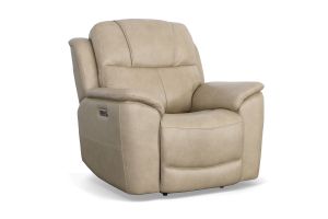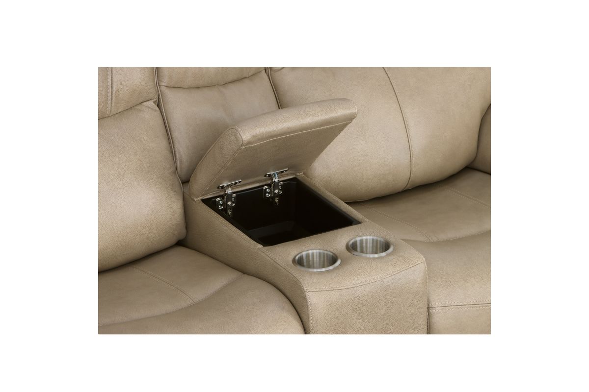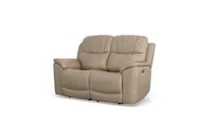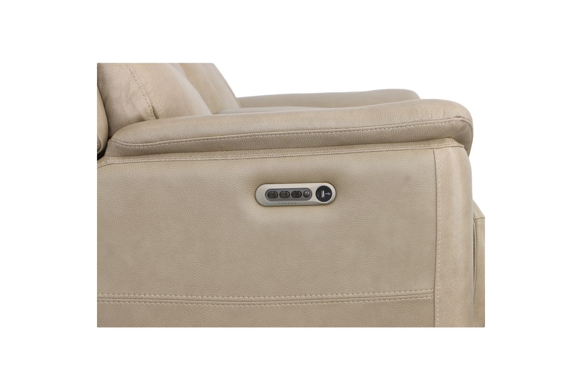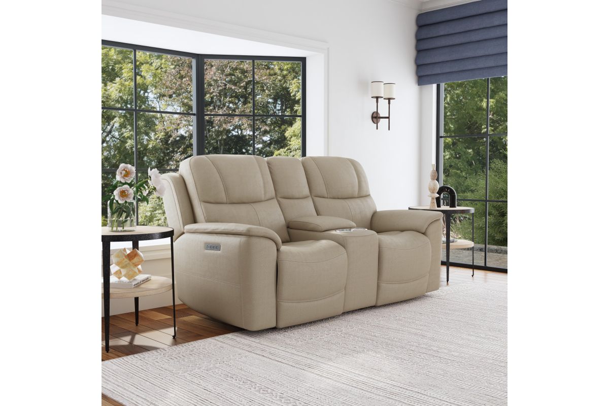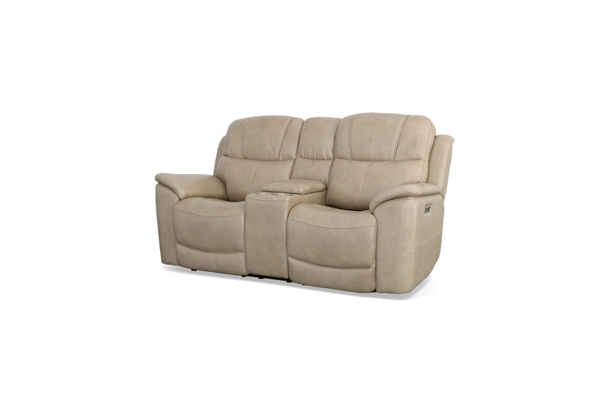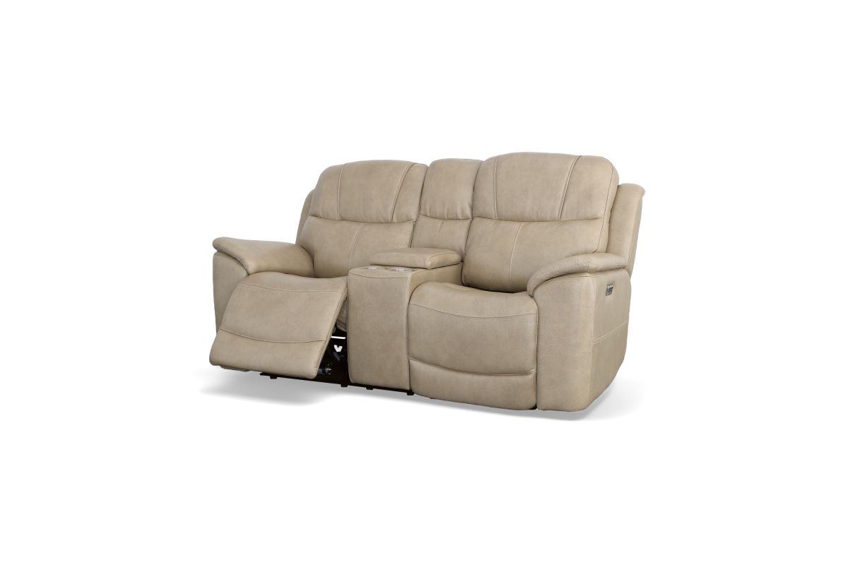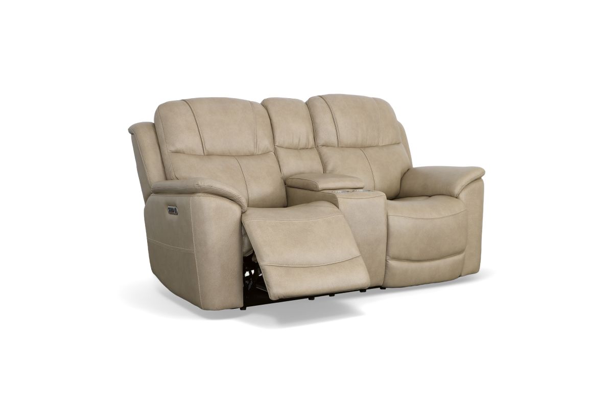 Superior ergonomics combine with the plush comfort of the Crew leather power reclining loveseat with console. Featuring triple power functionality that allows for independent adjustment of the headrests, lumbar supports and recline, this loveseat also features Zero Gravity which reduces pressure and tension on the body. Enjoy reliable comfort all day, every day, with pad-over armrests, waterfall chaise footrests, thin layered headrests, and divided back cushions. Built-in USB ports conveniently charge mobile devices while a center storage console keeps remotes?and beverages nearby so you can settle in for a marathon movie night. With Flexsteel's patented Blue Steel Spring™ at the heart of each seat, and high-quality light tan leather, the Crew power reclining loveseat brings exceptional beauty and durability to your home.