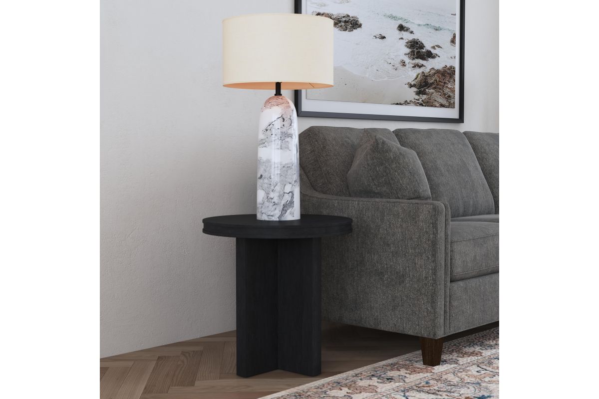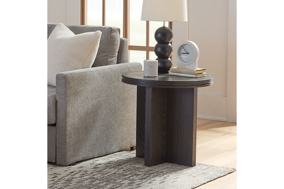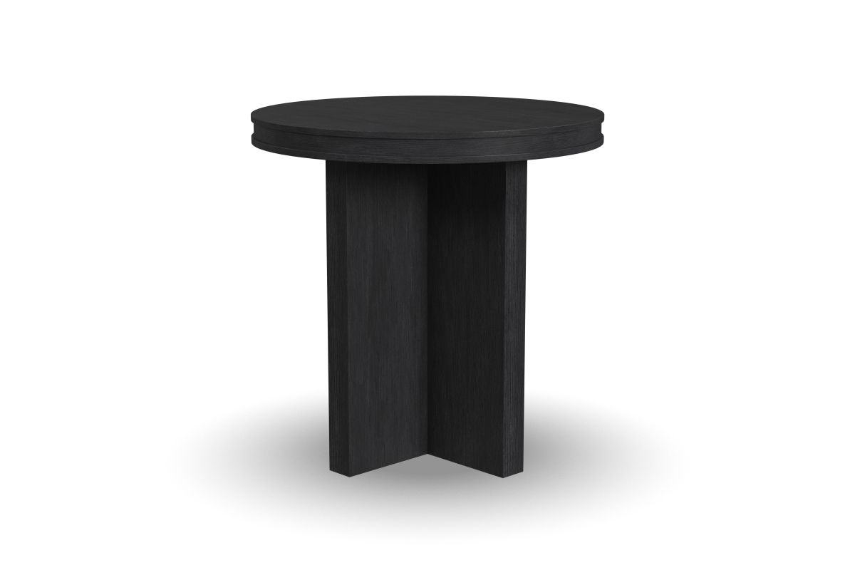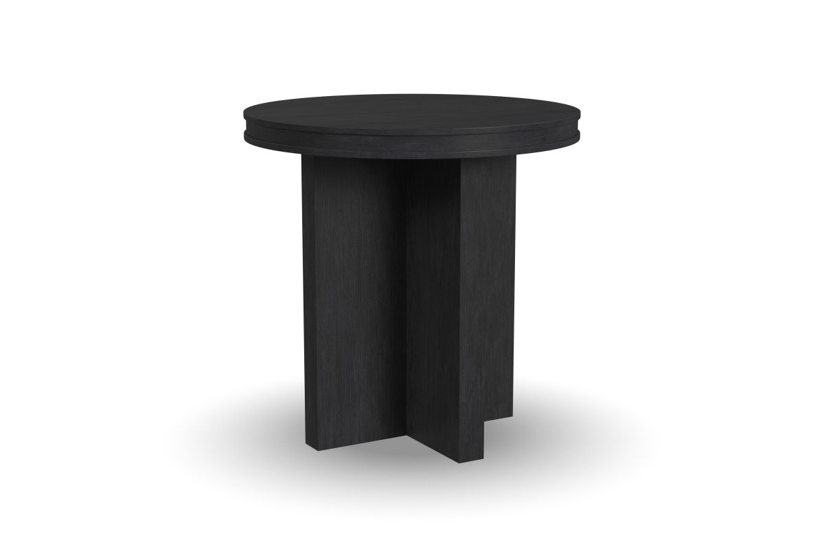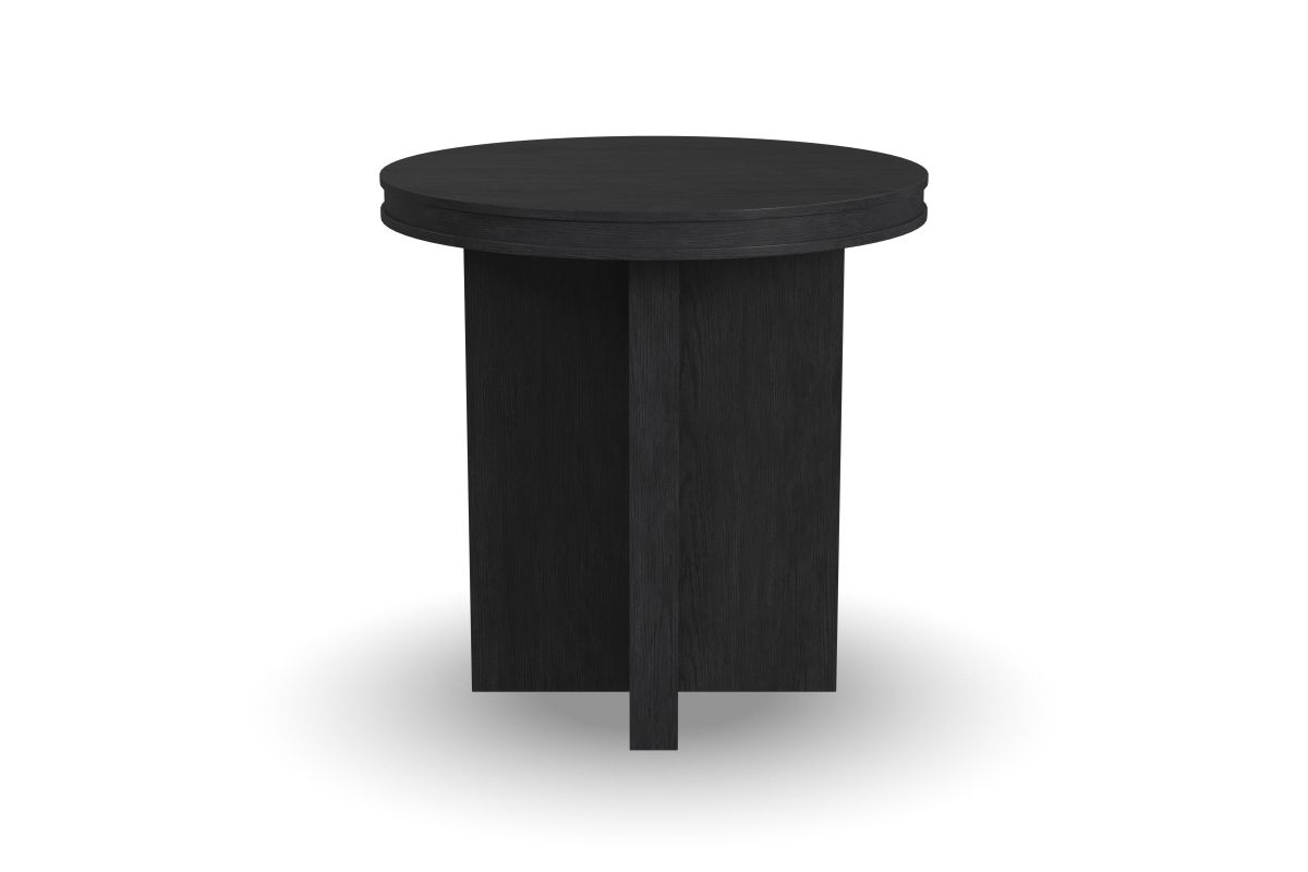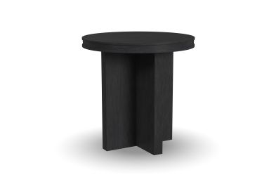 Add effortless style and architectural appeal to your living room with the Waterfall round end table. This striking table features a timeless silhouette defined by clean lines and simple geometric shapes, including a substantial sculptural crisscross base that supports the top. Group and nest this table with the coordinating Waterfall round coffee table for added visual interest and function. The Waterfall round end table is well-crafted from solid rubberwood with oak veneers and features a deep ebony finish for lasting beauty.