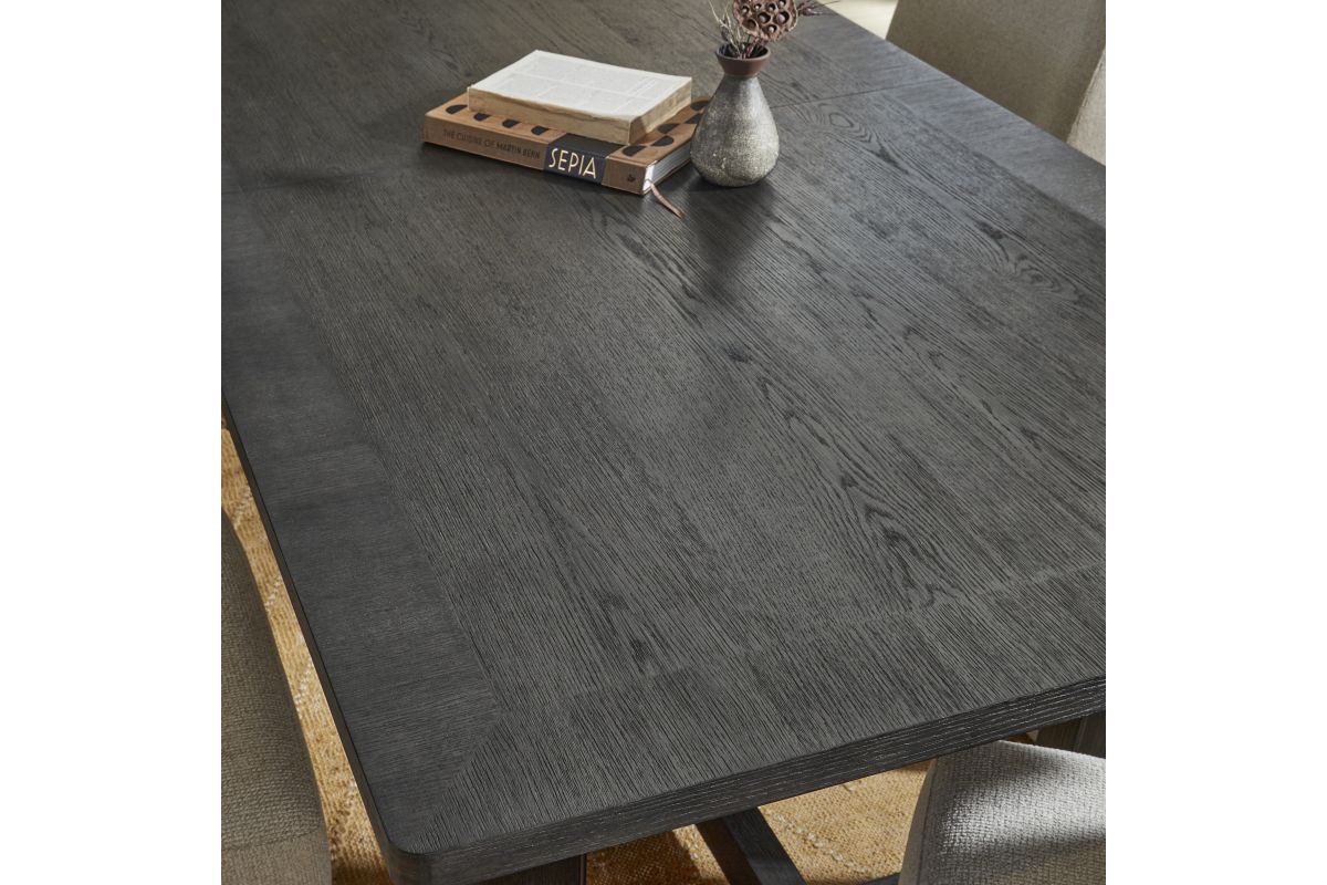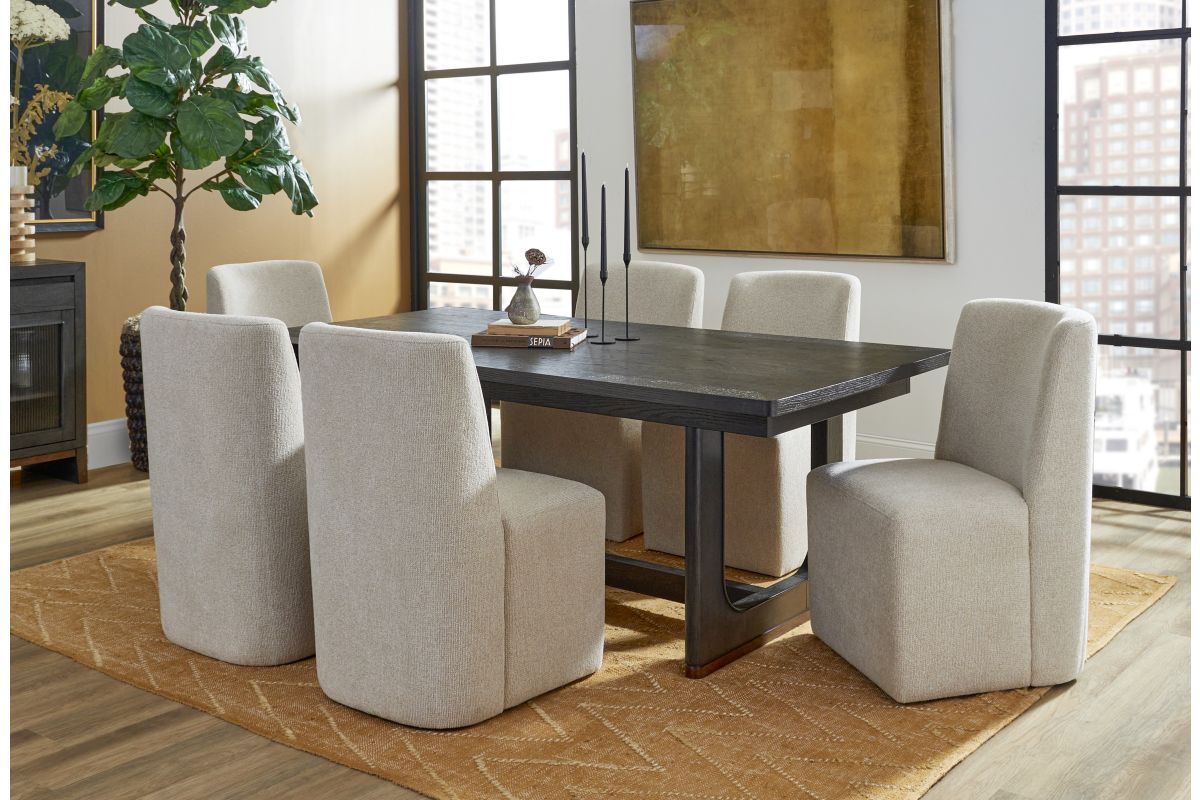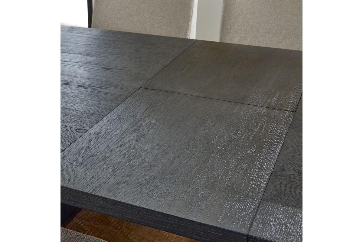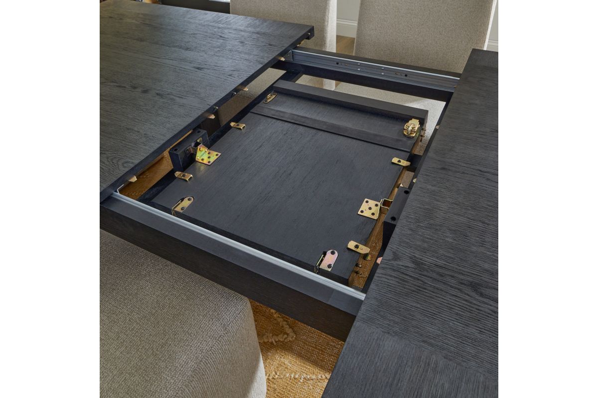 The perfect centerpiece for your next dinner party, this gorgeous dining table brings the ultimate in transitional style. The deep ebony finish fits seamlessly with the rich brown base accents for an on-trend color combination. Meticulously crafted from rubberwood solids and oak veneers, this piece is built to be everlasting. Complete with an 18” inch butterfly leaf that extends the table to a vast 100”, you’ll have ample space to host up to eight guests. The graceful namesake waterfall edges give this table true elegance.