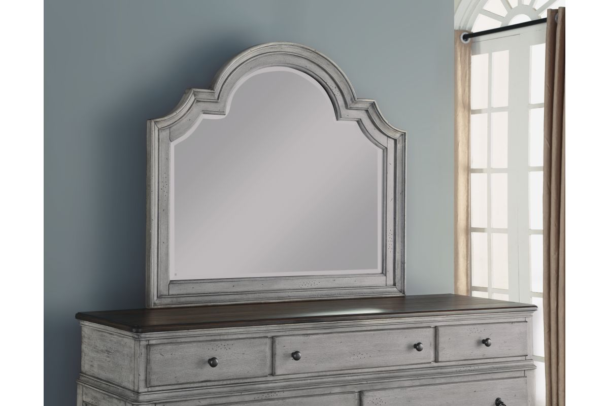 The perfect companion to the Plymouth dresser, this charming mirror adds relaxed, cottage-inspired style to any bedroom. Beveled glass, a scalloped profile, intricate molding and a weathered graywash finish add to the vintage appeal.
