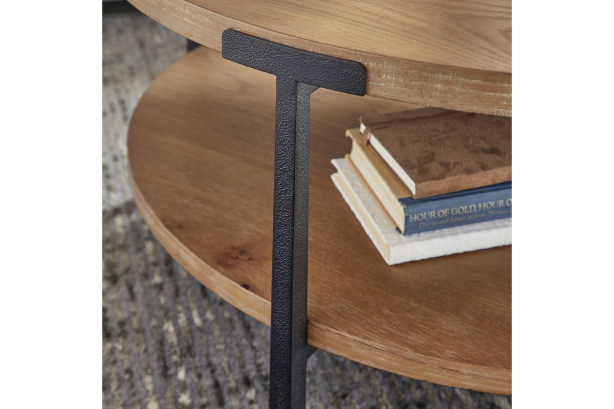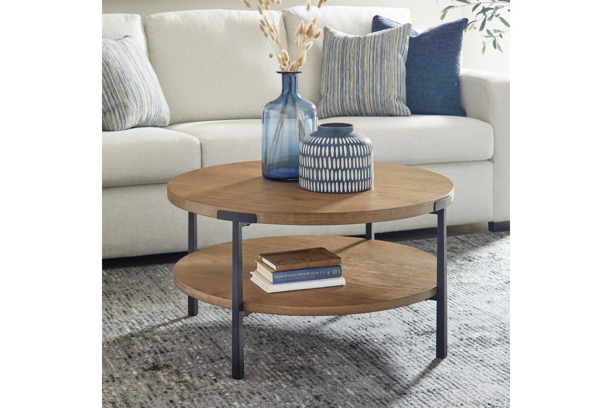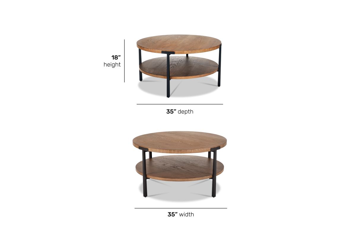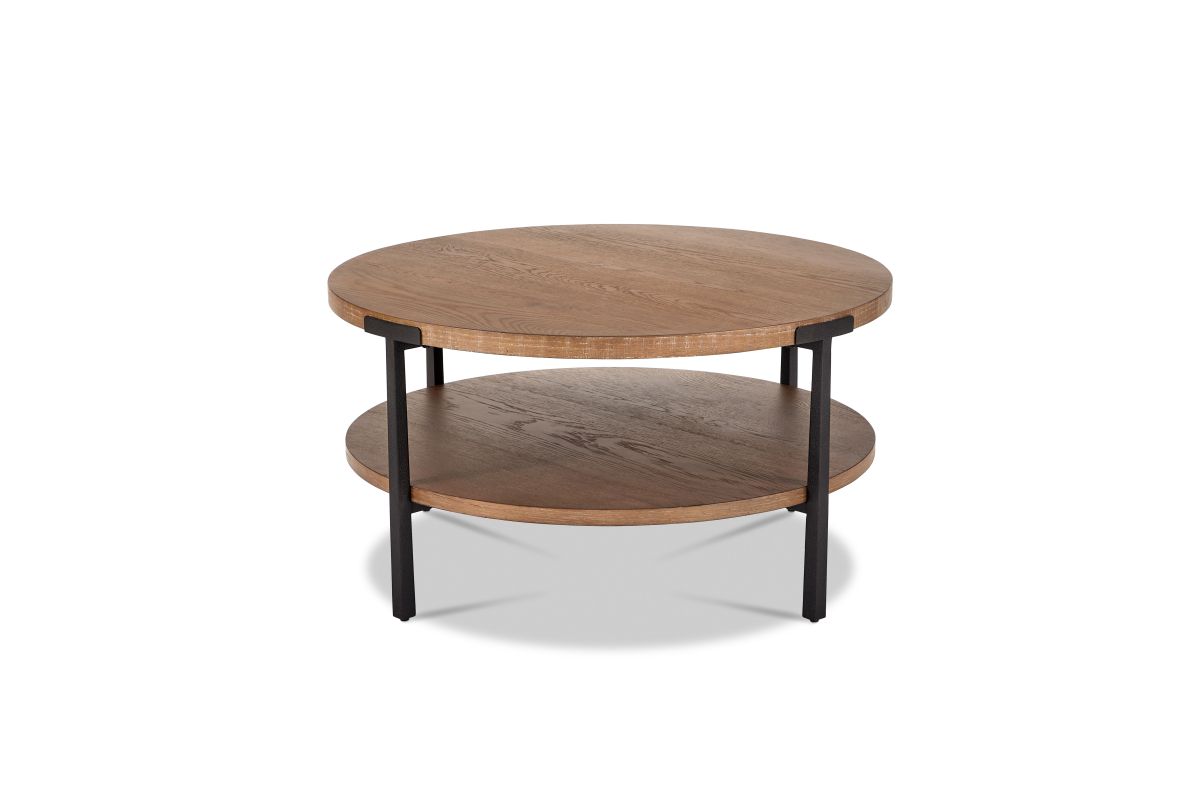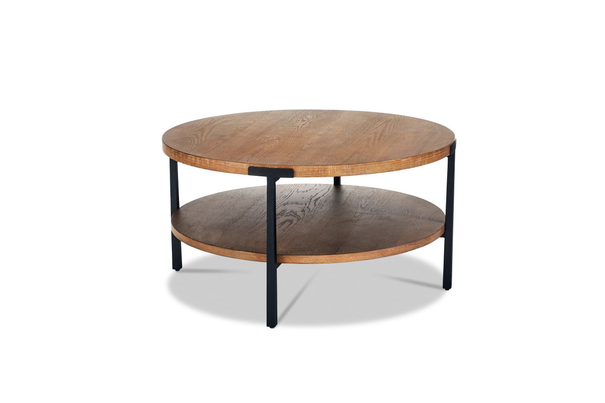 Sophistication meets rustic, industrial charm with the Millwork round coffee table. Seamlessly blending high-contrast materials and finishes in perfect harmony, this table makes a captivating statement in any living space. A textured steel frame is highlighted by warm copper undertones, while a distinctive wood top and lower shelf exude character with natural knots, subtle saw marks and a white cerused finish that accentuates the rich umber wood grain.