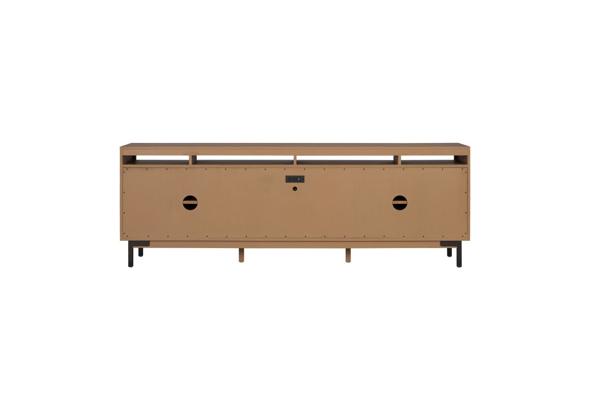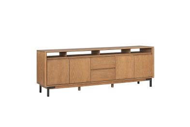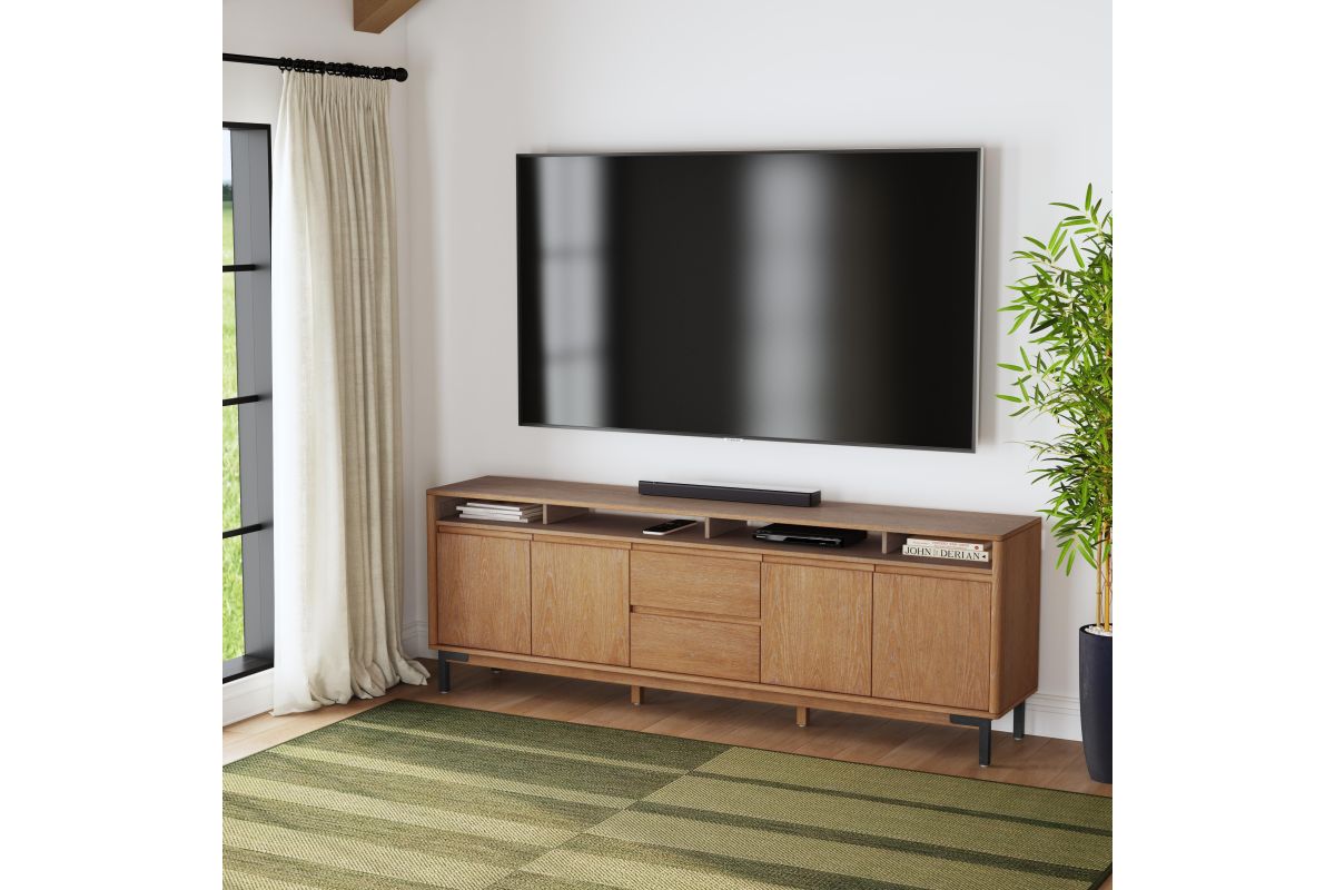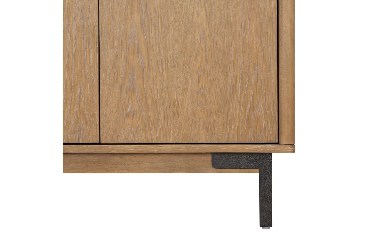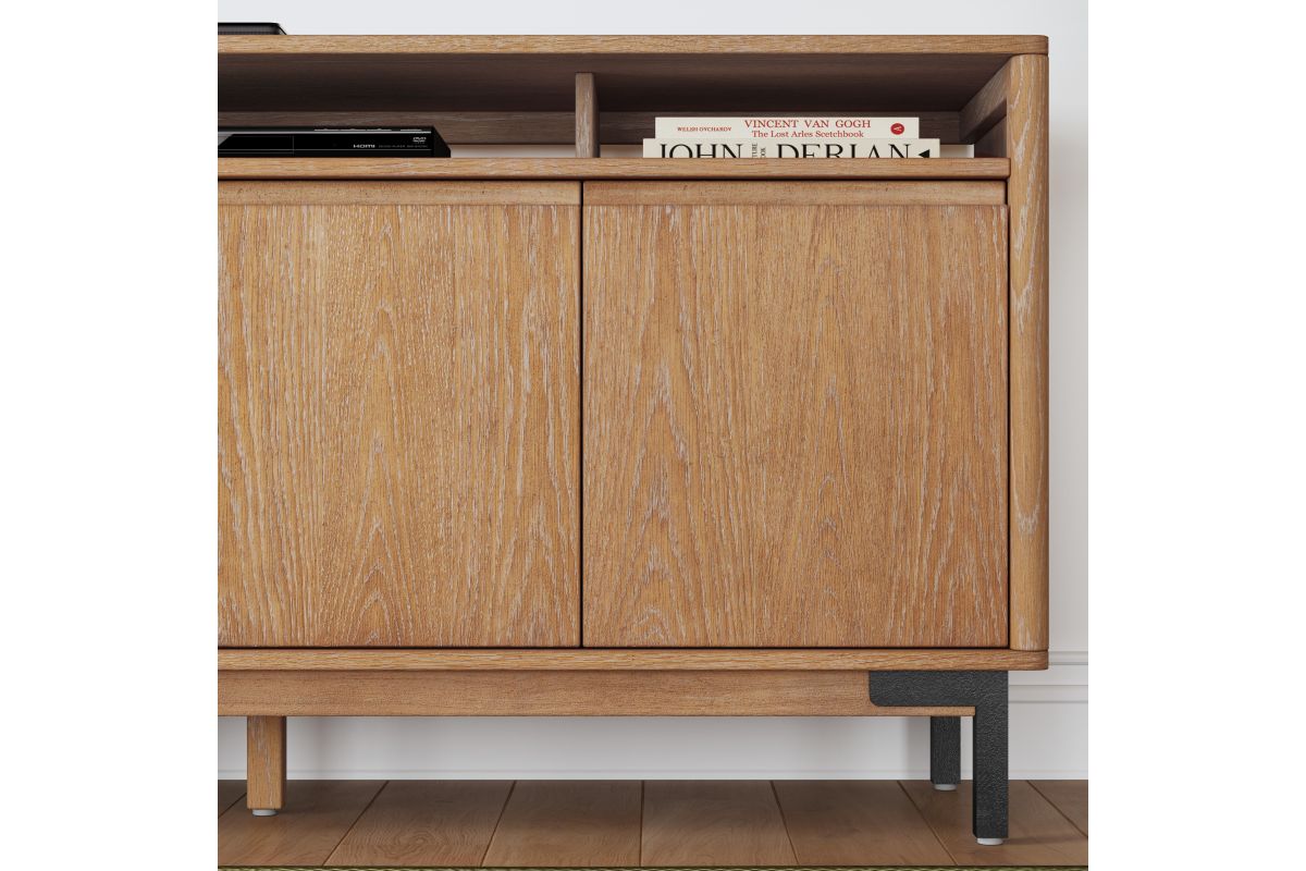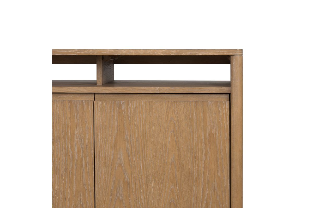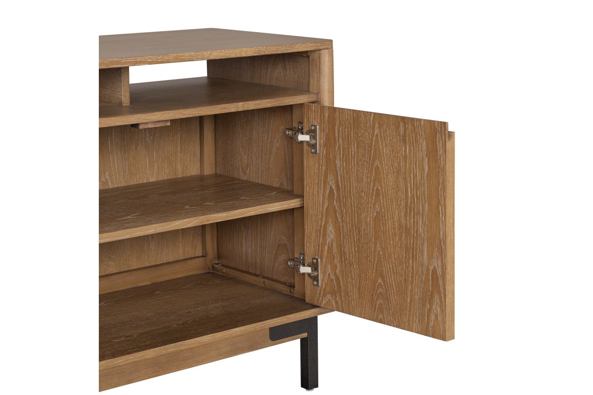 Sophistication meets rustic, industrial charm with the Millwork large entertainment center. Seamlessly blending high-contrast materials and finishes in perfect harmony, this piece makes a captivating statement in any living space. A textured steel frame is highlighted by warm copper undertones, while a distinctive 92” wood top exudes character with natural knots, subtle saw marks and a white cerused finish that accentuates the rich umber wood grain. Above the drawers and cabinets, open shelving offers both form and function, perfect for displaying curated décor, housing media components, or keeping everyday essentials within reach while maintaining an airy, balanced silhouette.