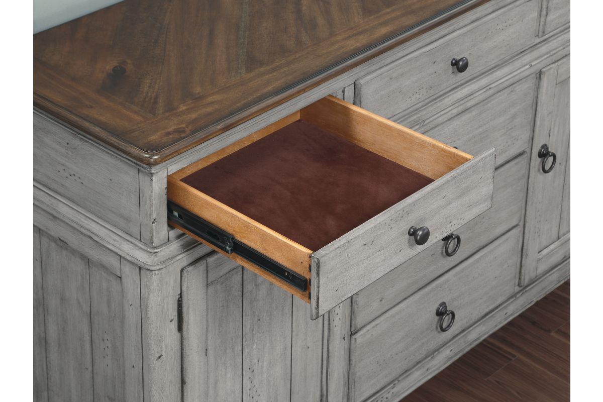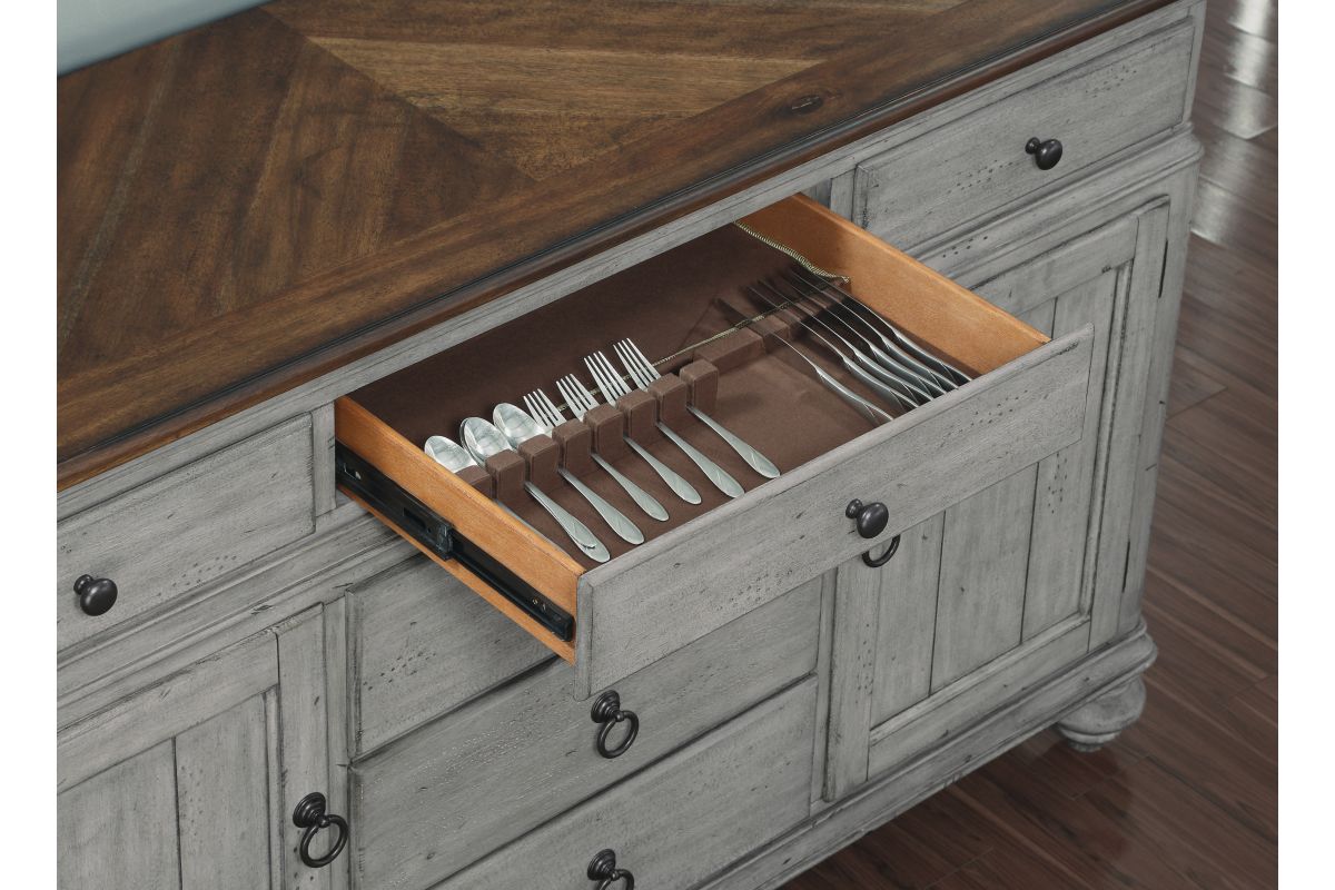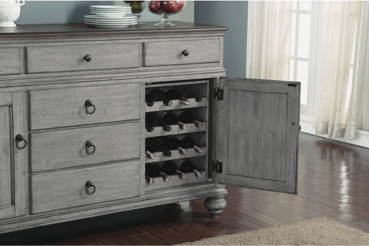 Entertain in relaxed cottage style with everything you need to host dinner guests with this Plymouth buffet. A weathered graywash finish is accented by a medium brown top and gunmetal pulls, while paneled details and turned bun feet add to the cozy vintage character. This buffet features two cabinet spaces with adjustable shelves and a removable wine rack that can store up to 16 bottles. Pair that with six spacious drawers—complete with felt-lined top drawers and a removable silverware tray—and you have ample storage for serving pieces and other dining essentials. Each drawer features ball-bearing glides for smooth access and support for heavy dining ware.