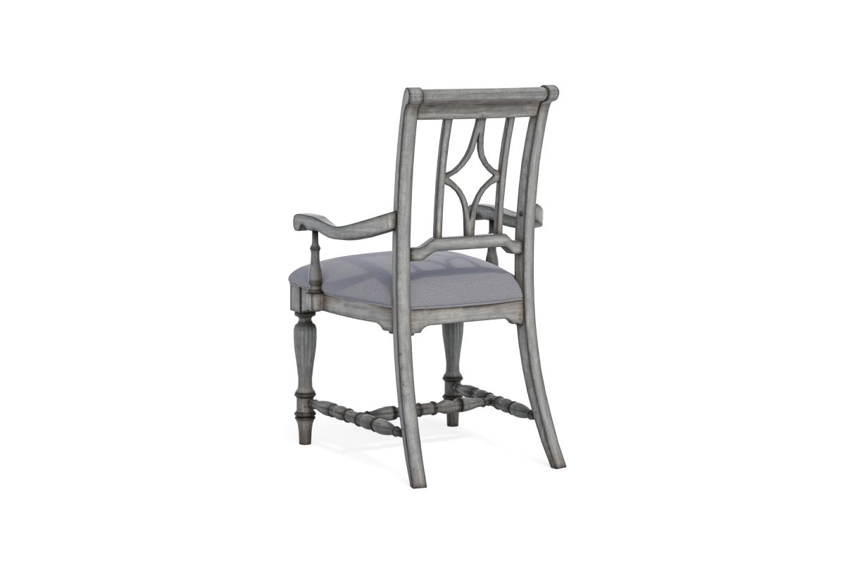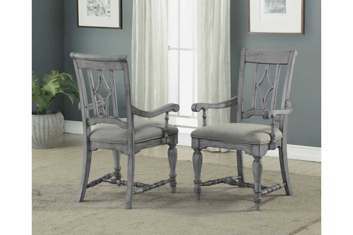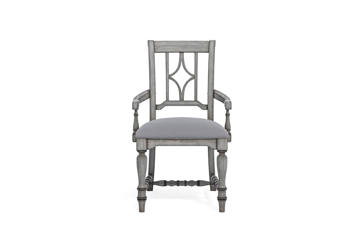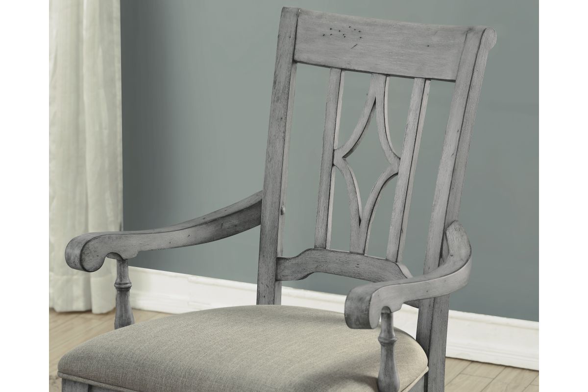 Designed to complement our Plymouth dining tables with a coordinating cottage look, this charming dining chair features an appealing open back design with a diamond-shaped detail, intricately carved trestles and turned legs for added vintage character. Available in a weathered graywash finish, each chair is upholstered in a durable and cleanable coordinating fabric, providing comfort for long periods of sitting.