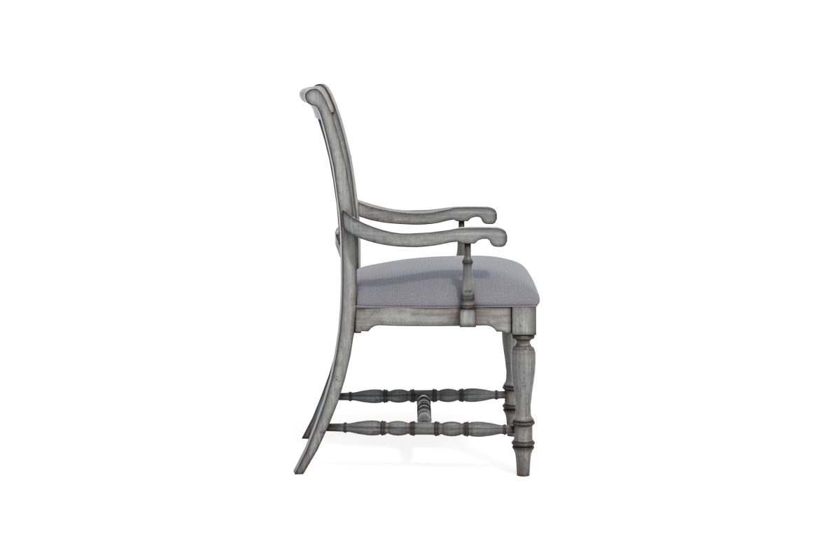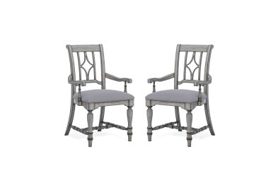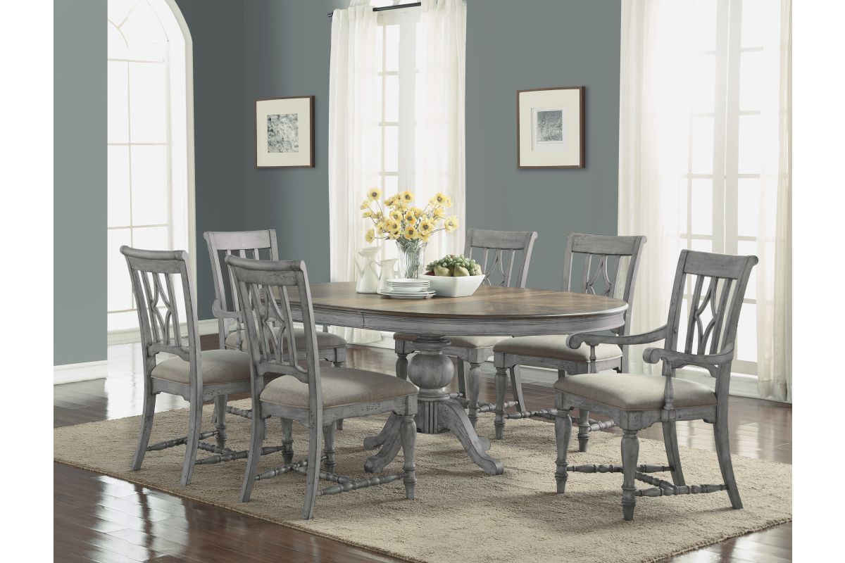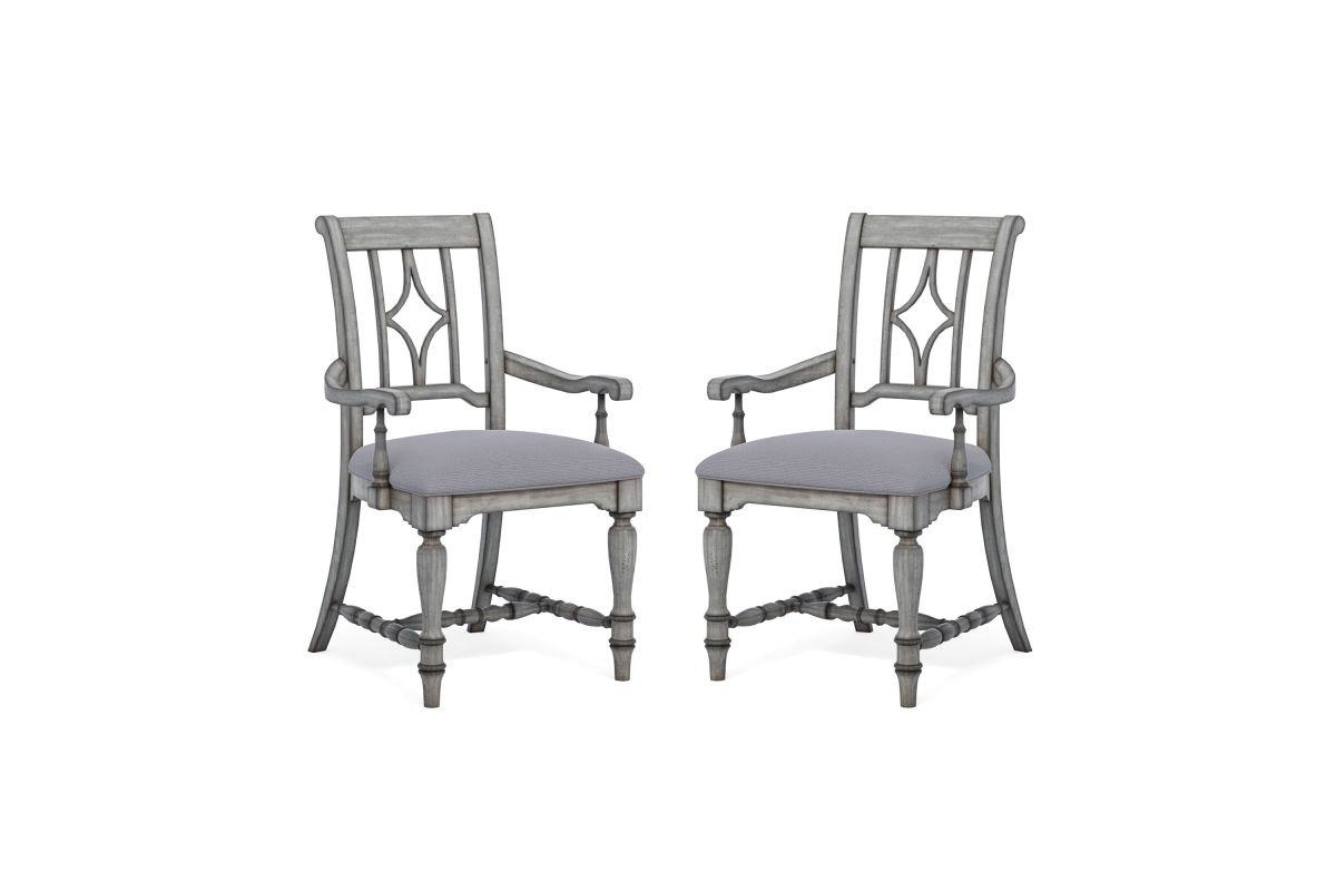 Designed to complement our Plymouth dining tables with a coordinating cottage look, this charming dining chair features an appealing open back design with a diamond-shaped detail, intricately carved trestles and turned legs for added vintage character. Available in a weathered graywash finish, each chair is upholstered in a durable and cleanable coordinating fabric, providing comfort for long periods of sitting.