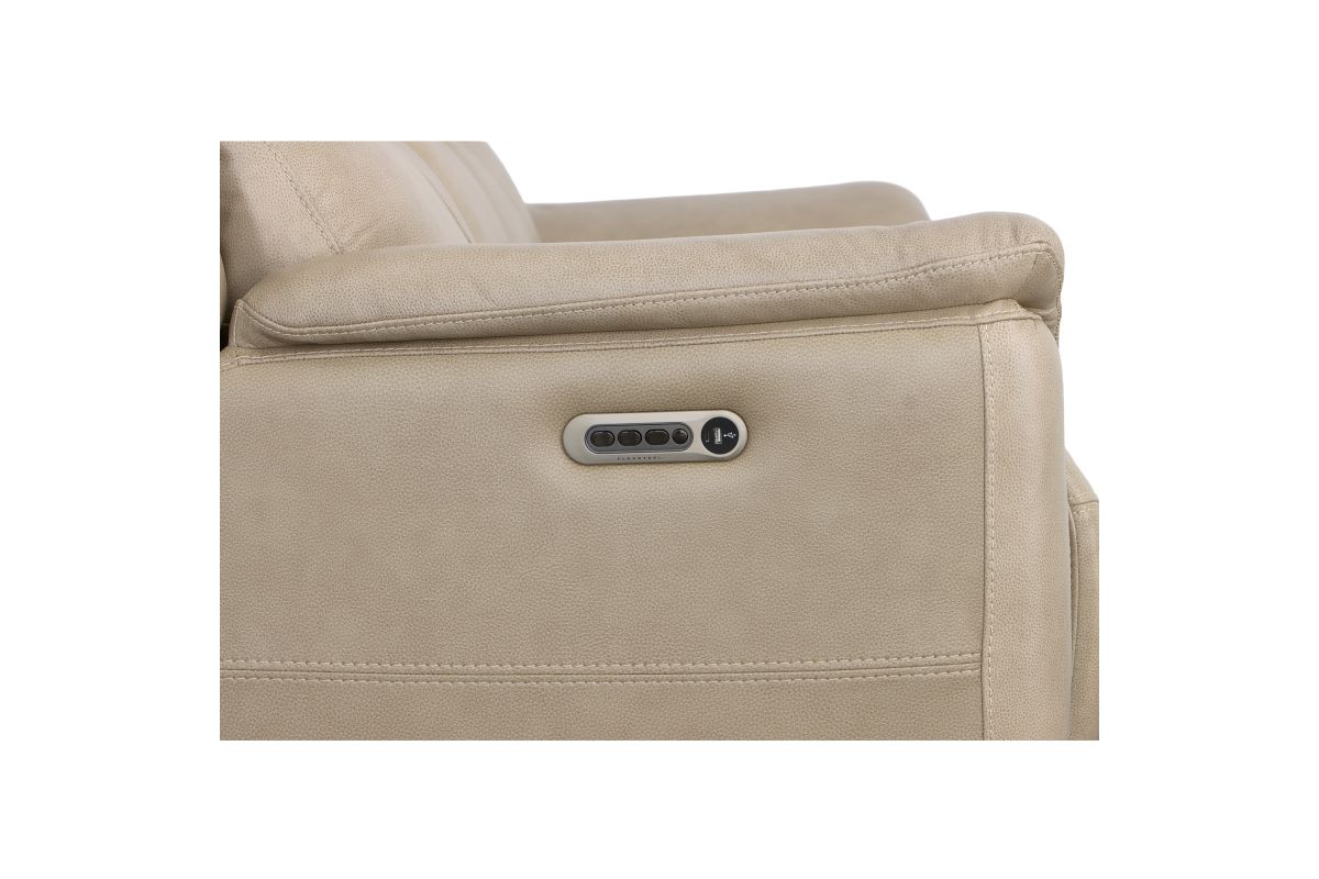 Superior ergonomics combine with the plush comfort of the Crew leather power reclining sofa. Featuring triple power functionality on the two outside seats that allows for independent adjustment of the headrests, lumbar supports and recline, this sofa also features Zero Gravity which reduces pressure and tension on the body. Enjoy reliable comfort all day, every day, with pad-over armrests, waterfall chaise footrests, thin layered headrests, and divided back cushions. Integrated power controls with built-in USB ports let you achieve your ideal relaxation position at the push of a button while conveniently charging your mobile devices. With Flexsteel's patented Blue Steel Spring™ at the heart of each seat, and high-quality light tan leather, the Crew power reclining sofa brings exceptional beauty and durability to your home.
