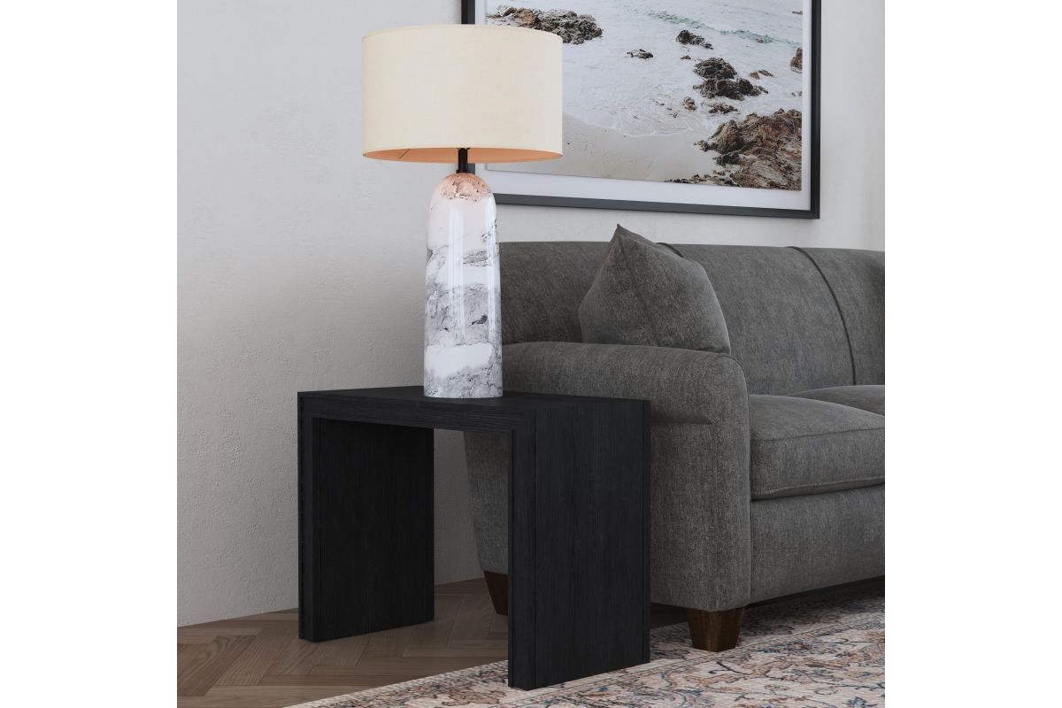 Add effortless style and architectural appeal to your living room with the Waterfall round end table. This striking table features a timeless silhouette defined by clean lines and simple geometric shapes, including a substantial sculptural crisscross base that supports the top. Group and nest this table with the coordinating Waterfall round coffee table for added visual interest and function. The Waterfall round end table is well-crafted from solid rubberwood with oak veneers and features a deep ebony finish for lasting beauty.