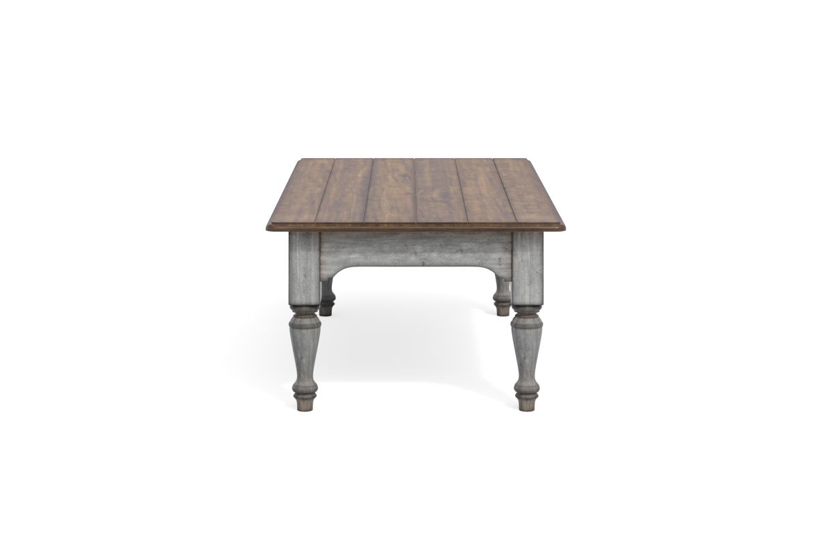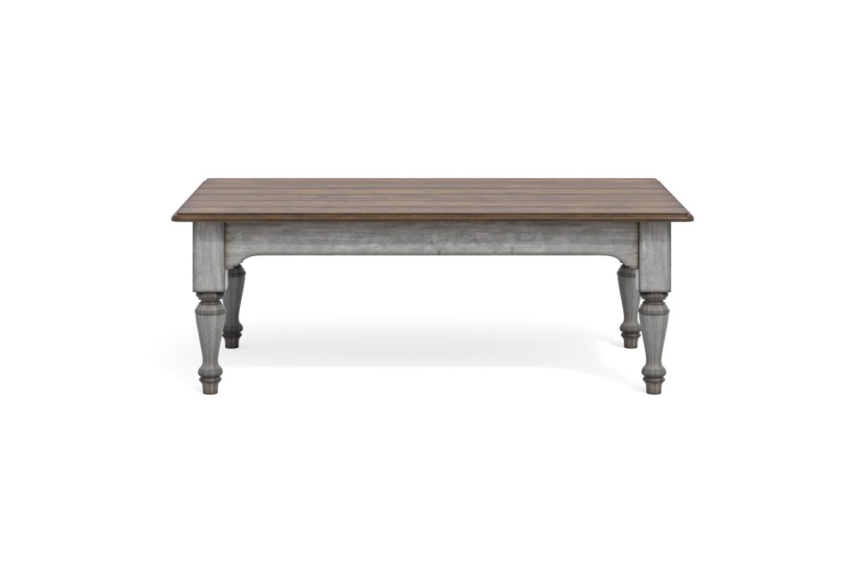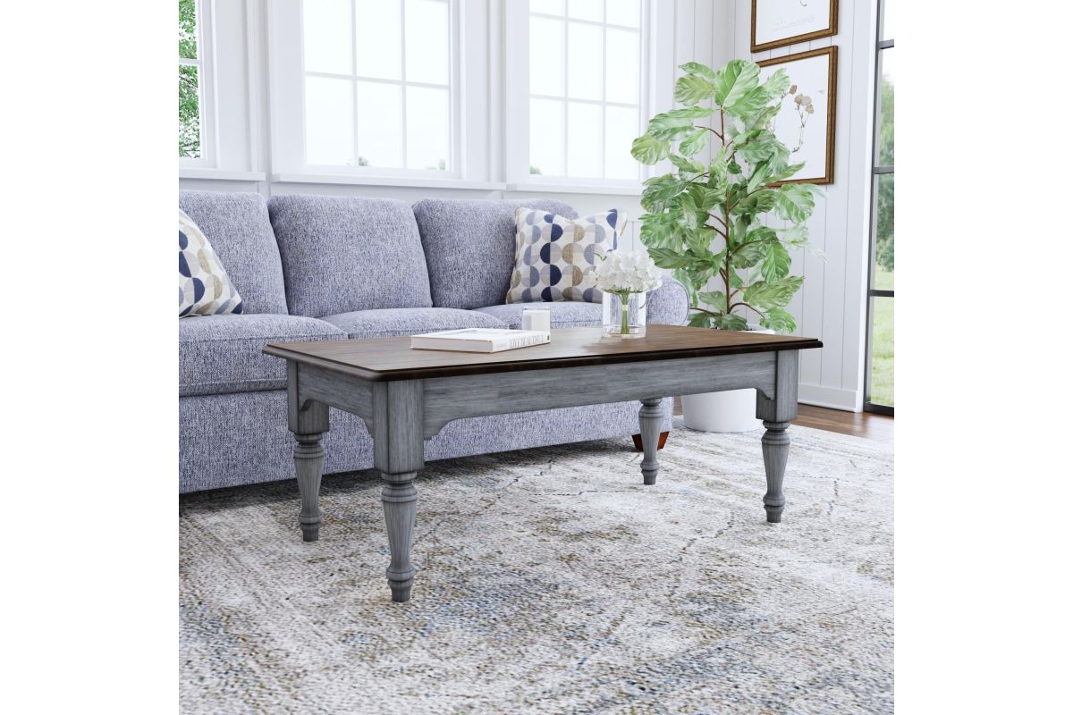 Transform your living room into a cozy cottage retreat with the Plymouth rectangular coffee table. A weathered graywash finish, medium brown planked top and turned legs create a charming vintage vibe, while the large tabletop provides ample area to place drinks and décor.