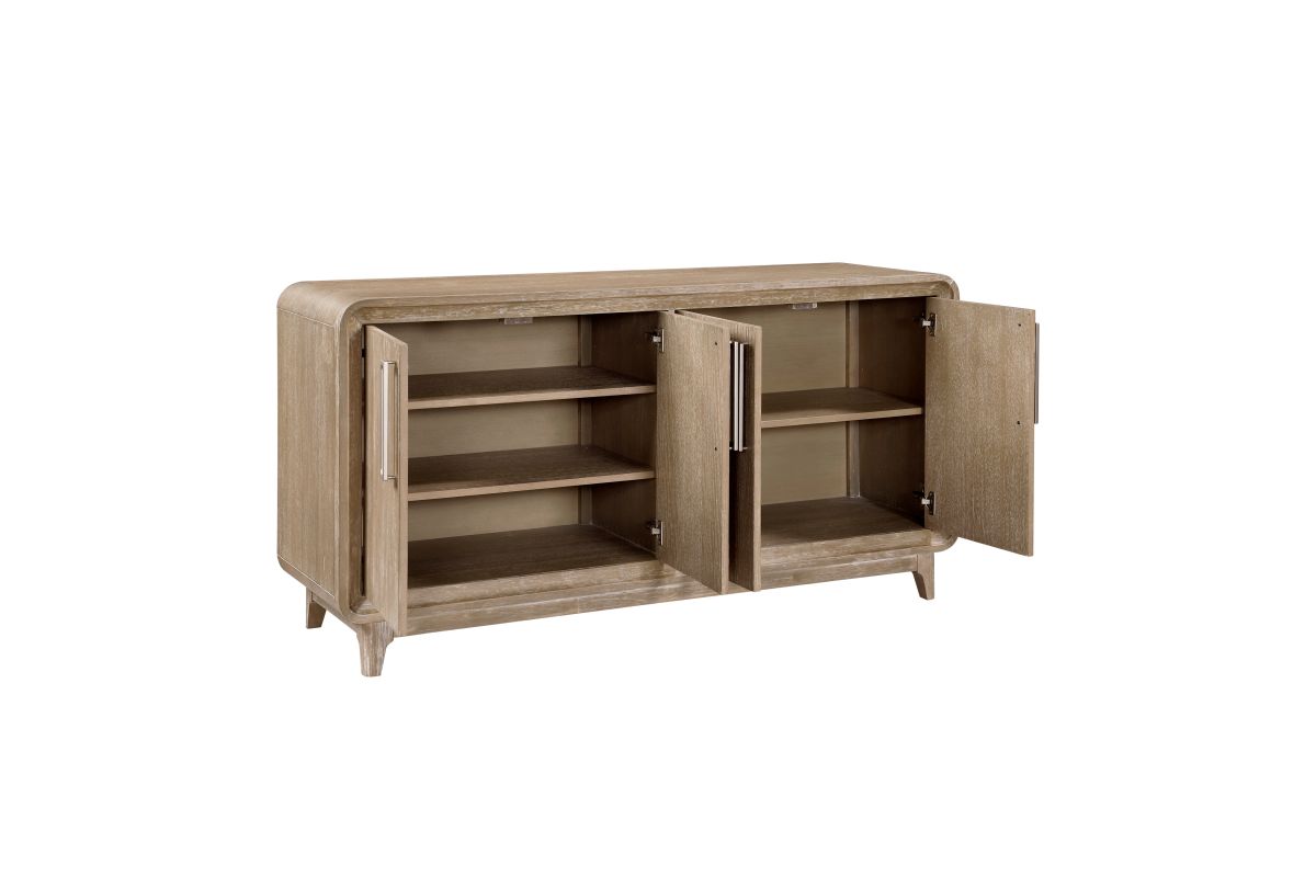 Elevate your home's organization and style with the buffet server. Crafted from a harmonious blend of oak veneer, solid wood, and engineered wood, and finished in a beautiful natural tone, this versatile server offers both aesthetic appeal and practical storage. Featuring two spacious storage cabinets, each equipped with adjustable shelves, it provides ample space to neatly tuck away dinnerware, linens, or media essentials. Its timeless design seamlessly integrates into various decor schemes, making it an ideal addition to your dining room, living room, or entryway for a touch of refined organization.