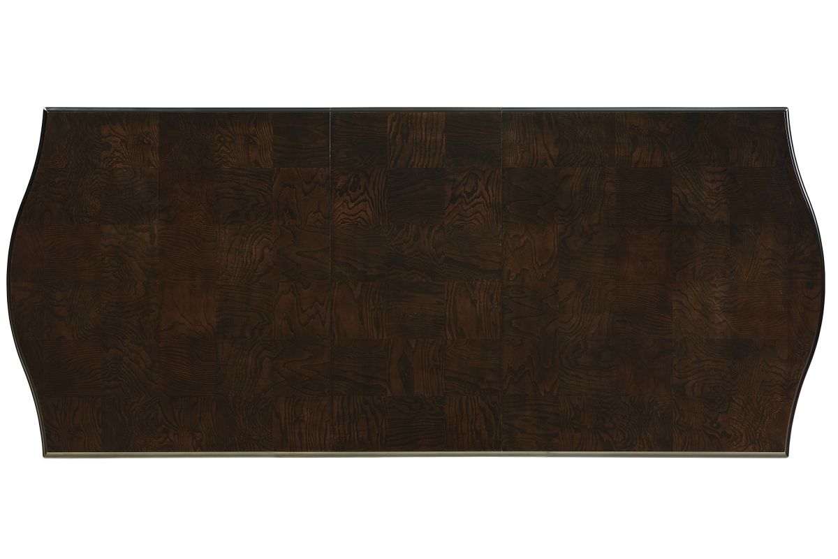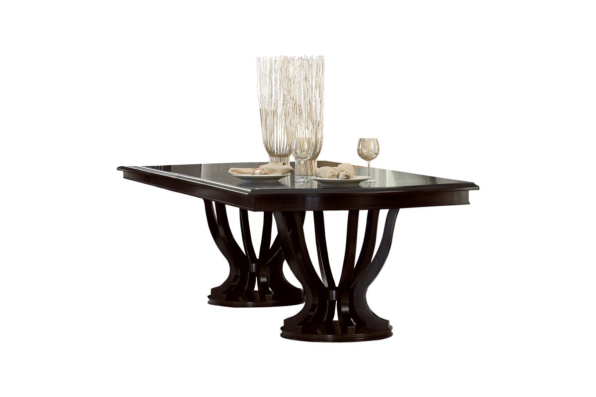 Sophisticated soft contemporary design is achieved in your dining room with the addition of the Savion Collection. Rectangular double pedestal table features a distinct birdcage style base. An espresso finish highlights the unique veneer pattern.