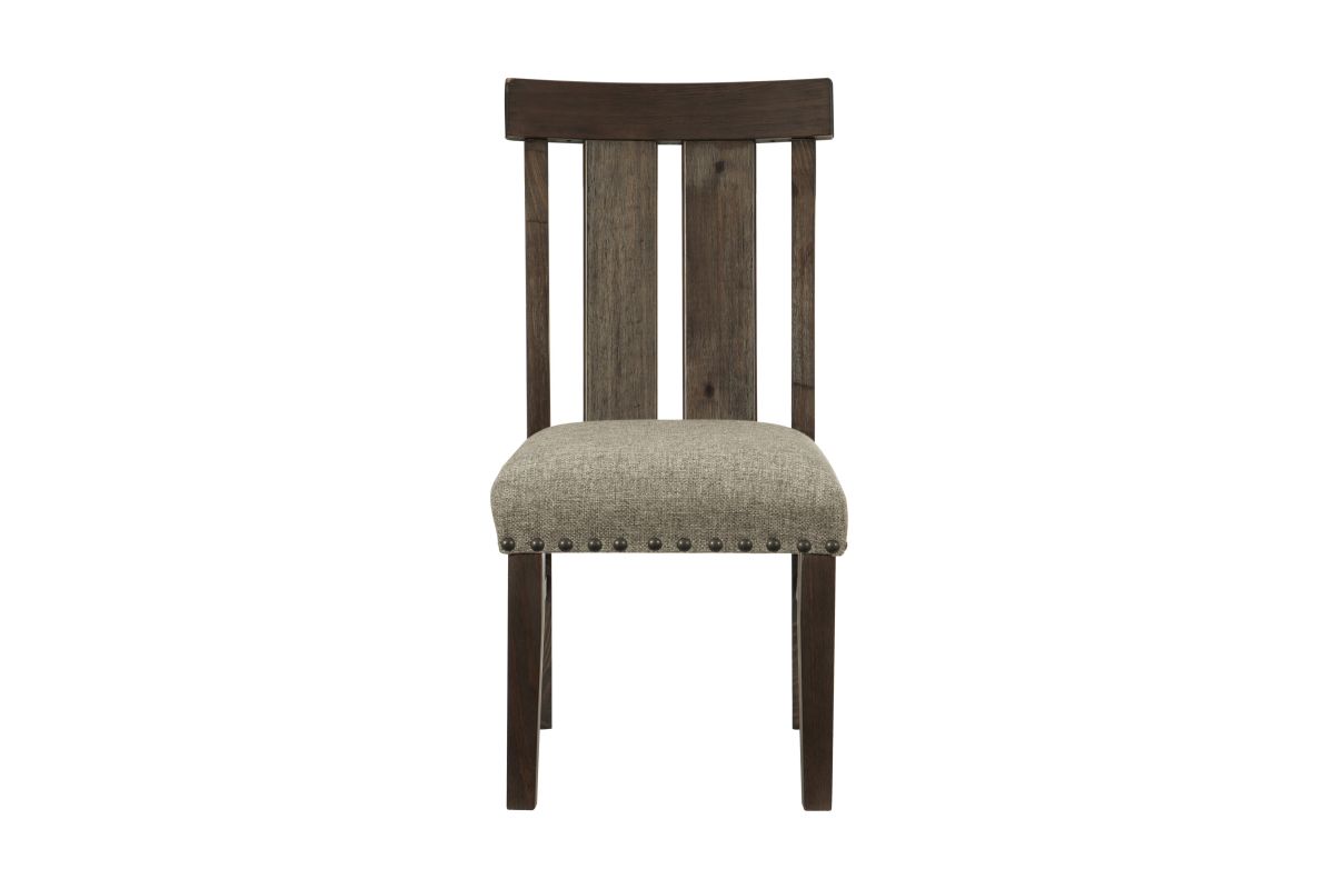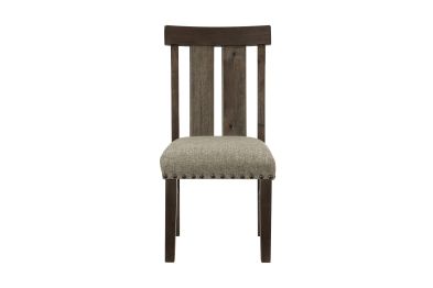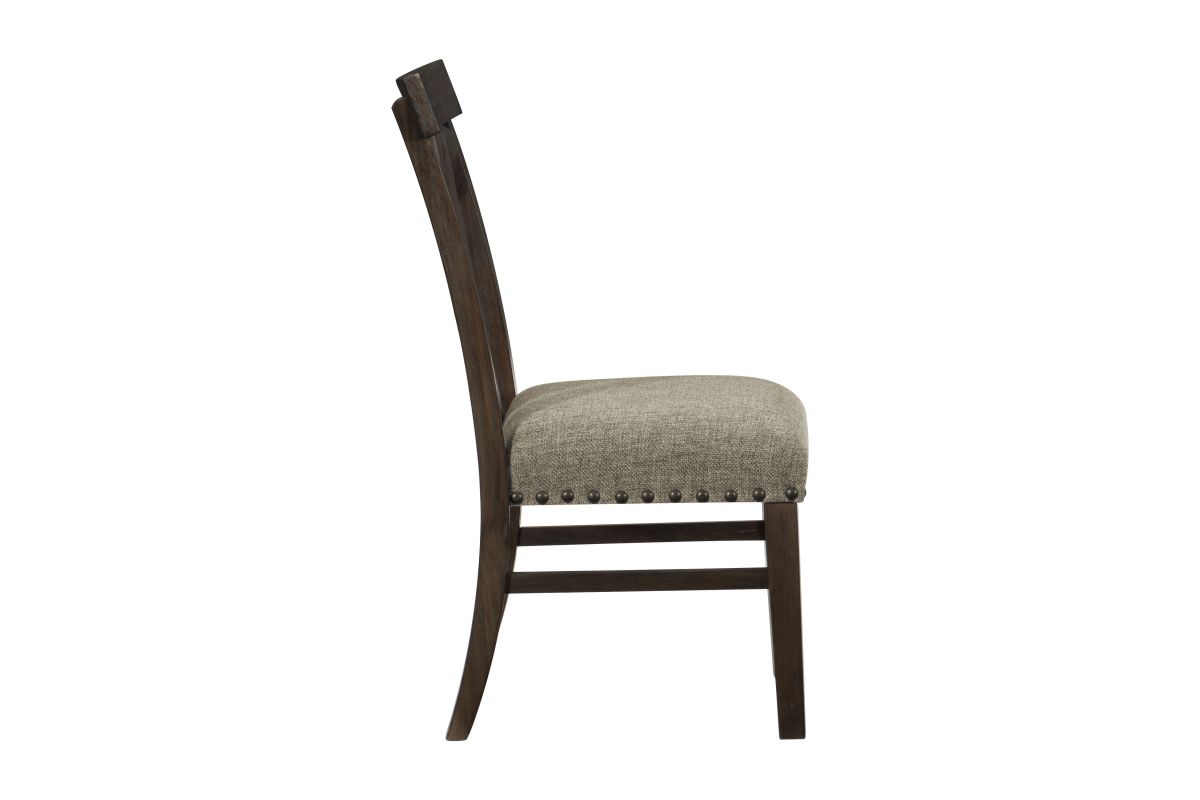 With styling that hints at times gone past, the Gloversville Collection’s stately presence will be the perfect addition to your dining room. The wood framed side chair features a neutral toned fabric seat and nailhead accent. The pine veneer and pine solids of the armchair features a brown finish that furthers the classic look of the collection.