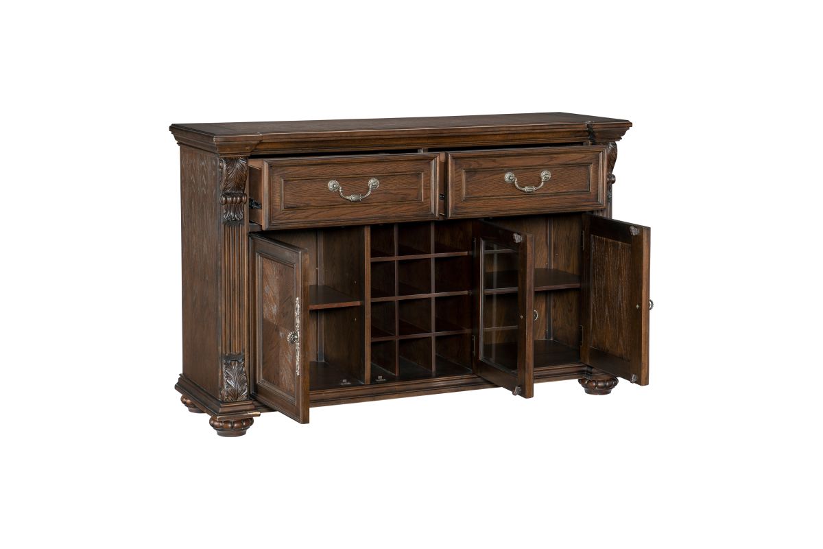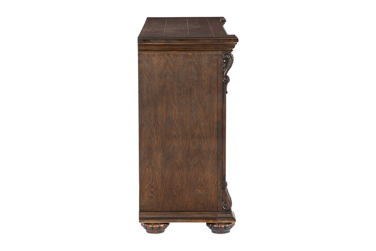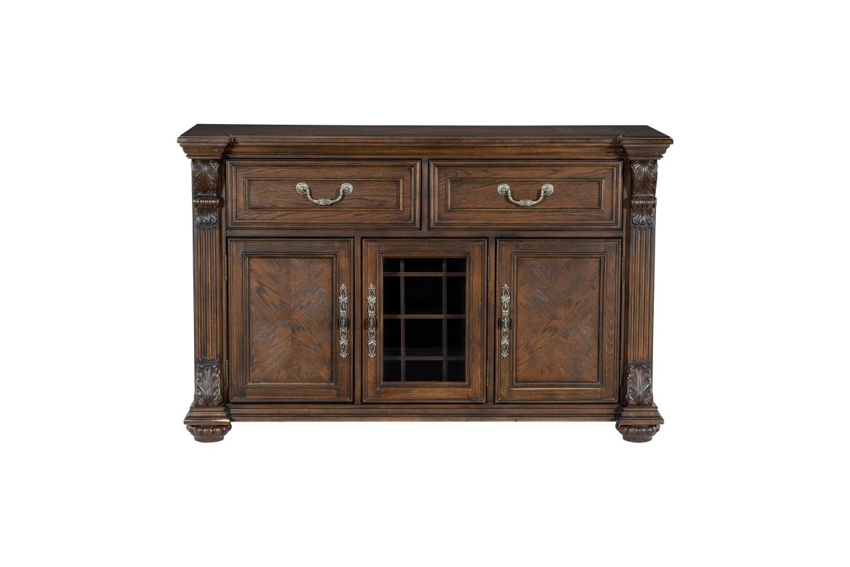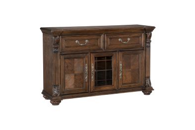 The grand scale of the Bergen Collection invokes a timeless aesthetic for your home’s traditional dining room. The dark oak finish highlights the distinct oak veneer of the collection, while also lending contrast to the decorative accenting of the curio’s design. Faux keyhole hardware fronts the doors of the server, while traditional bale hardware fronts the drawers. The glass door of the server allows for enclosed display of your wine collection while traditional accenting abounds throughout the piece with classic routed pilasters, moldings, and decorative pediments gracing the design.
