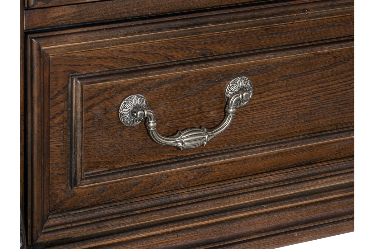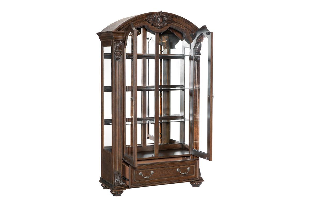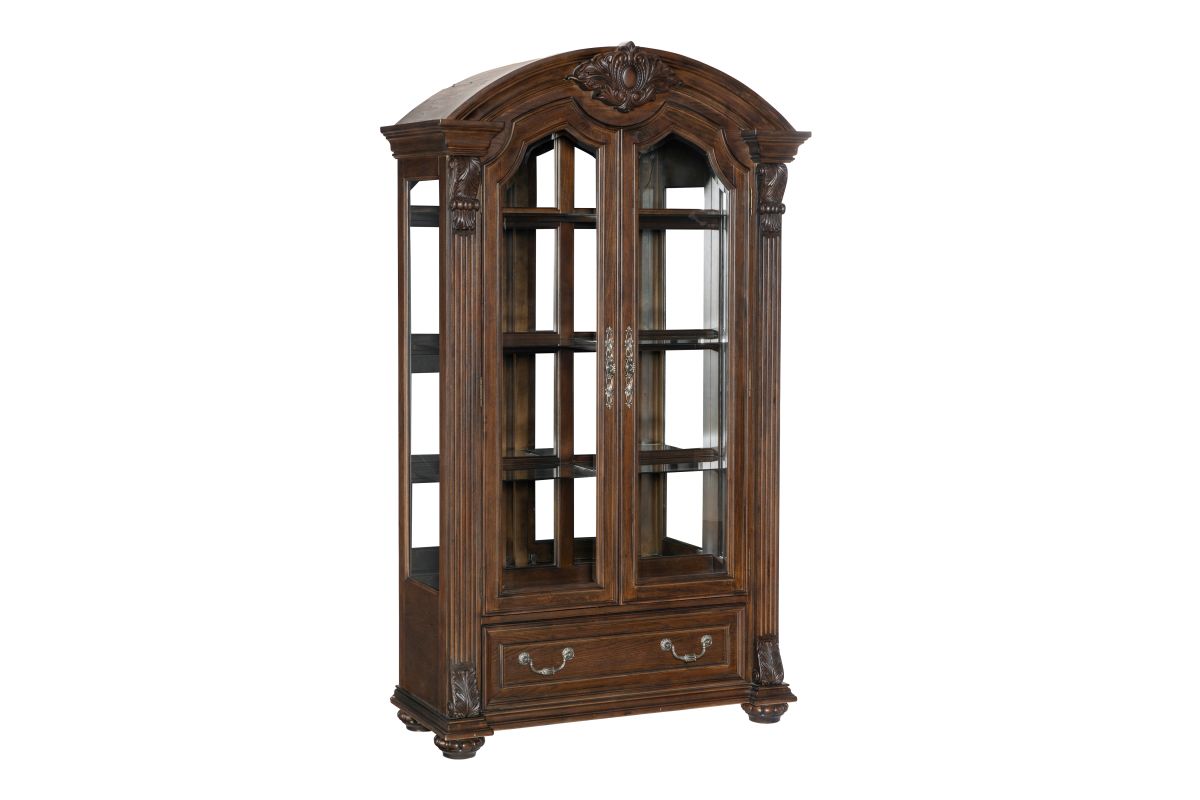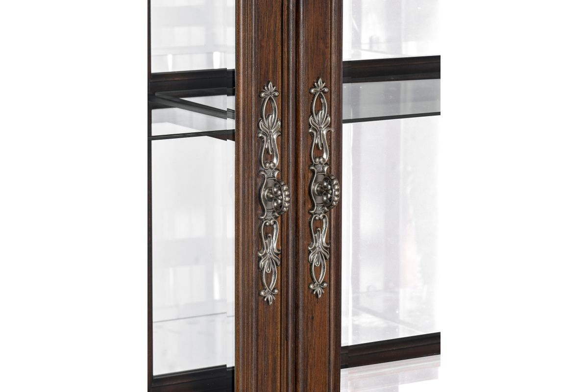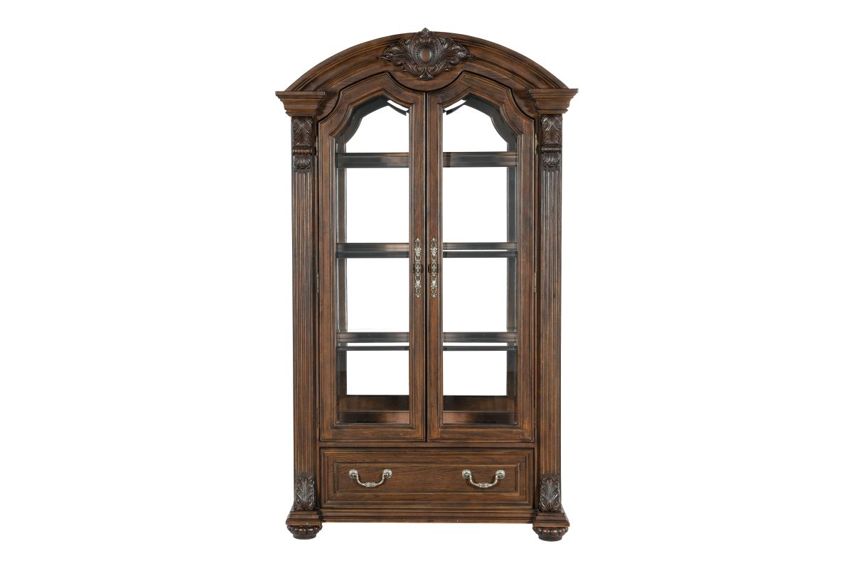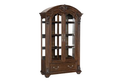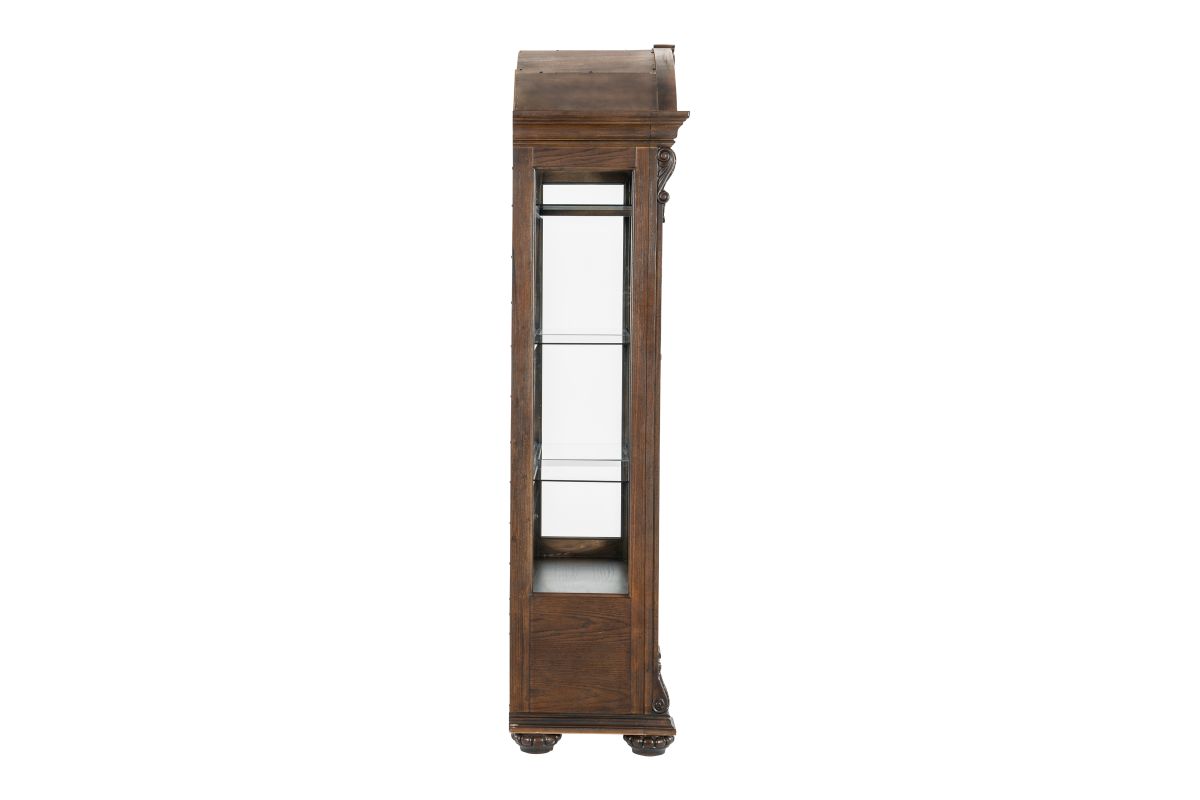 The grand scale of the Bergen Collection invokes a timeless aesthetic for your home’s traditional dining room. The dark oak finish highlights the distinct oak veneer of the collection, while also lending contrast to the decorative accenting of the curio’s design. Faux keyhole hardware fronts the doors of the curio, while traditional bale hardware fronts the drawers. The glass doors of the curio allow for enclosed display of your tabletop accessories and decorative items while traditional accenting abounds throughout the piece with classic routed pilasters, moldings, and decorative pediments gracing the design.