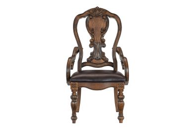 The grand scale of the Bergen Collection invokes a timeless aesthetic for your home’s traditional dining room. The armchair’s dark oak finish highlights the distinct oak veneer with a dark brown faux leather upholstered seat provides complementing contrast. Traditional accenting abounds throughout the chair with legs that feature classic routing, moldings, and decorative pediments gracing the design.