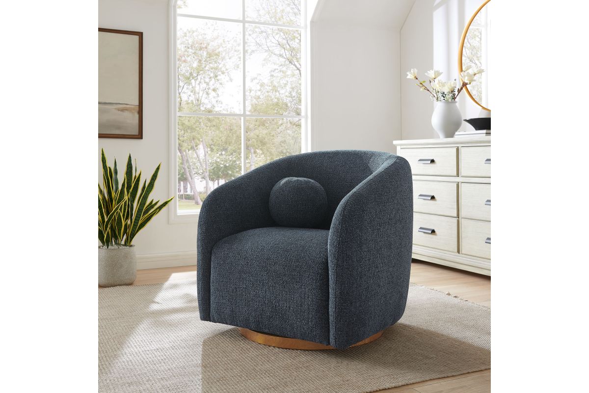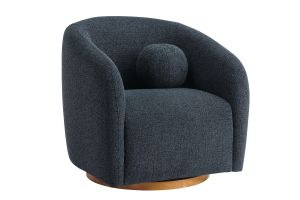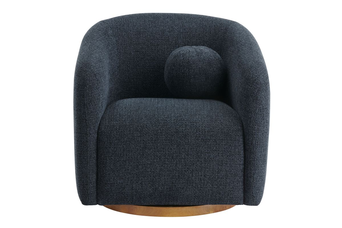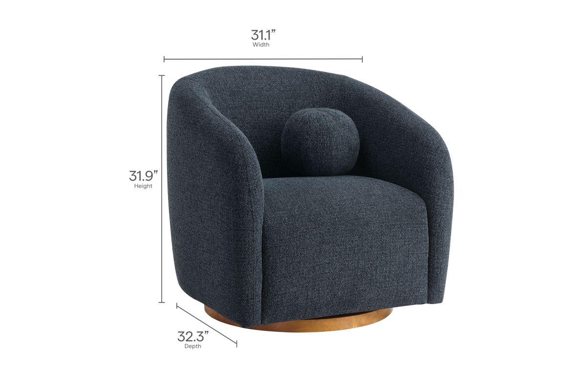 Transform your living space with the Holland Curved Swivel Armchair, where tailored elegance meets modern comfort. Upholstered in a textured chenille-like fabric with boucle-inspired depth, this accent armchair adds a sophisticated, cozy appeal to any room. Better for you and the environment, the upholstery fabric is also OEKO-TEX® STANDARD 100 Certified. The unique curved silhouette, sloping armrests, and soft, rounded edges create a minimalist look that feels both contemporary and inviting. Holland’s generous foam padding, spring coil support, and smooth swivel base offer plush, cloud-like seating with effortless mobility. Resting on a sturdy wood base with non-marking floor glides, this modern curved chair includes one matching ball accent pillow for added style and comfort. Perfect for living rooms, apartments, or offices, the Holland Barrel Swivel Armchair is a statement piece that blends form and function effortlessly. Arrives fully assembled. Weight Capacity: 800 lbs.