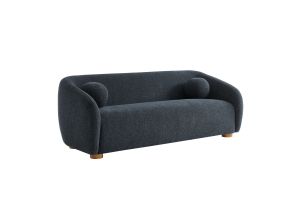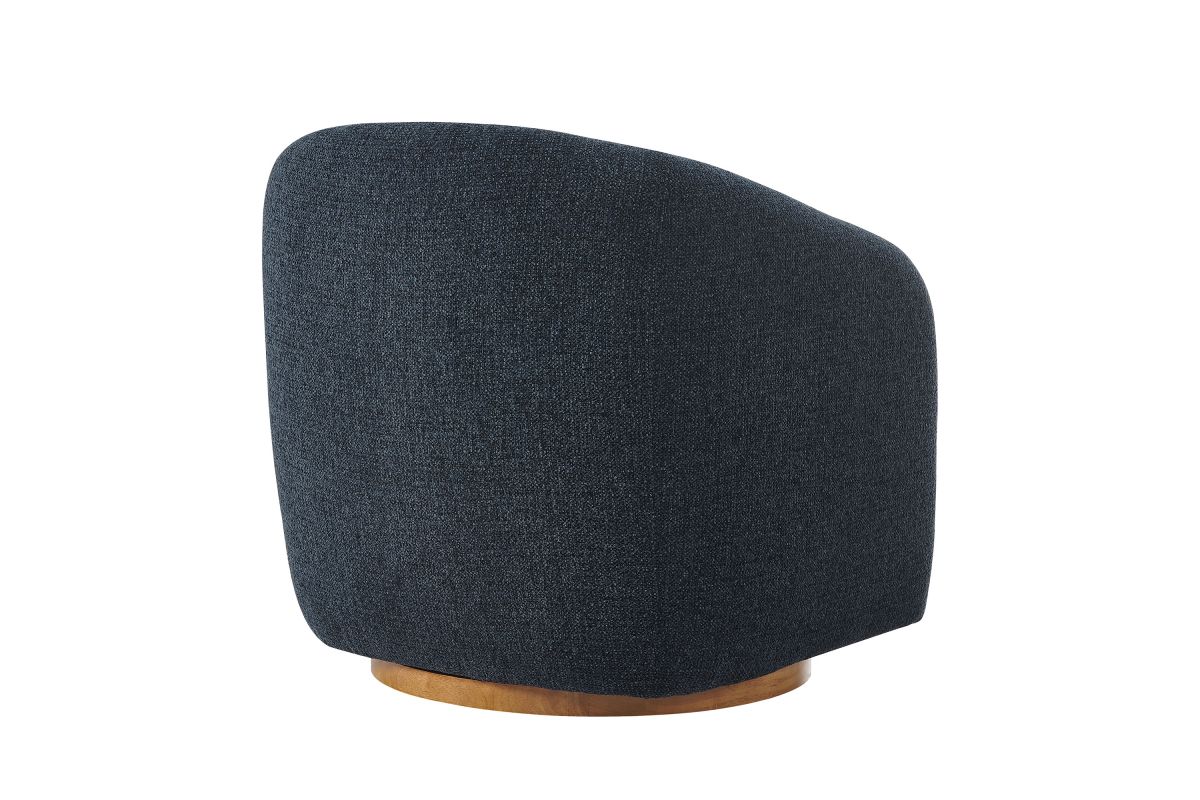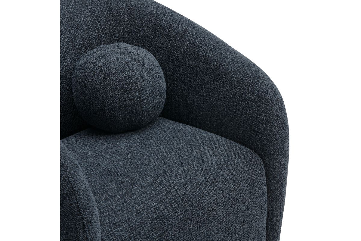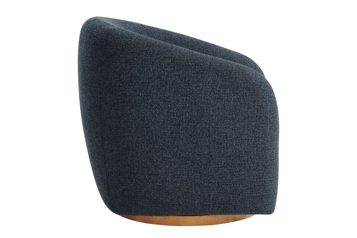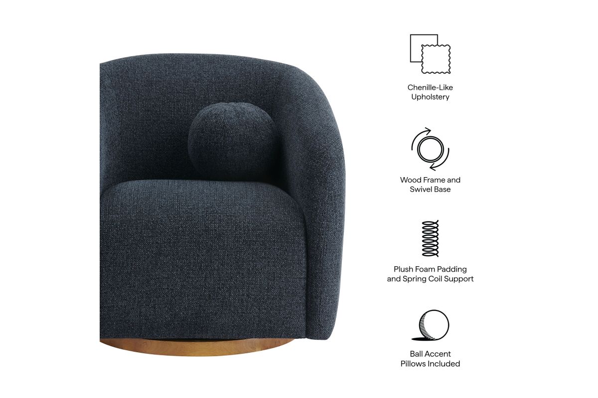 Transform your living space with the Holland Curved Swivel Armchair, where tailored elegance meets modern comfort. Upholstered in a textured chenille-like fabric with boucle-inspired depth, this accent armchair adds a sophisticated, cozy appeal to any room. Better for you and the environment, the upholstery fabric is also OEKO-TEX® STANDARD 100 Certified. The unique curved silhouette, sloping armrests, and soft, rounded edges create a minimalist look that feels both contemporary and inviting. Holland’s generous foam padding, spring coil support, and smooth swivel base offer plush, cloud-like seating with effortless mobility. Resting on a sturdy wood base with non-marking floor glides, this modern curved chair includes one matching ball accent pillow for added style and comfort. Perfect for living rooms, apartments, or offices, the Holland Barrel Swivel Armchair is a statement piece that blends form and function effortlessly. Arrives fully assembled. Weight Capacity: 800 lbs.