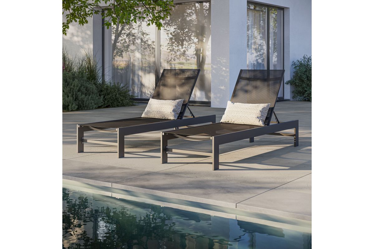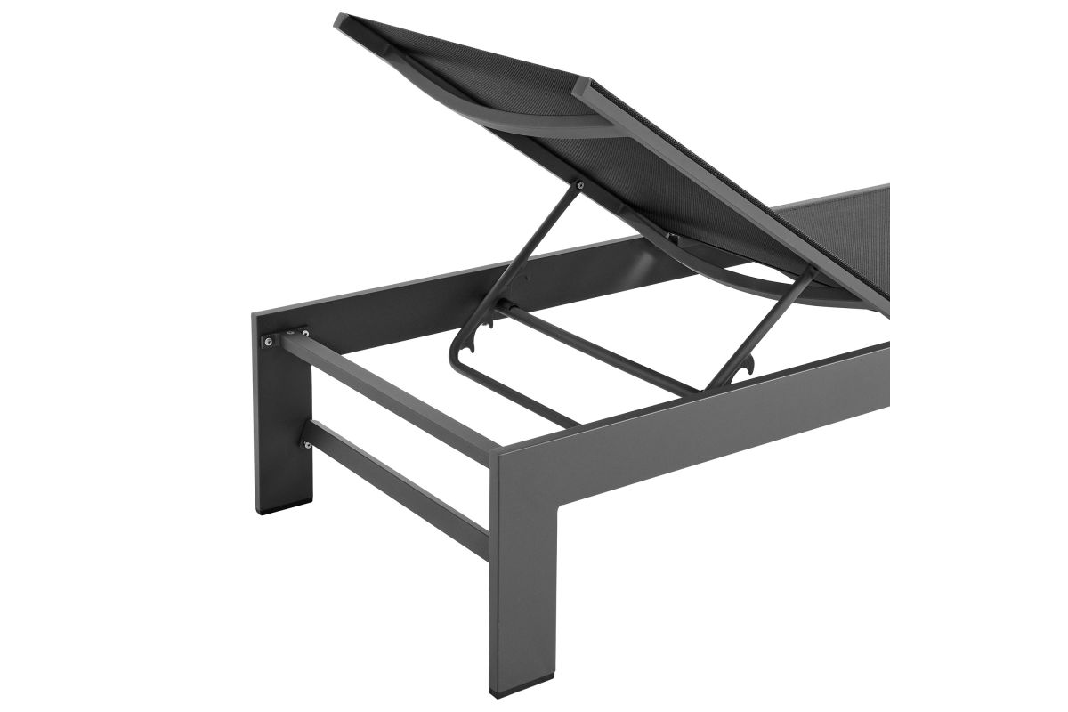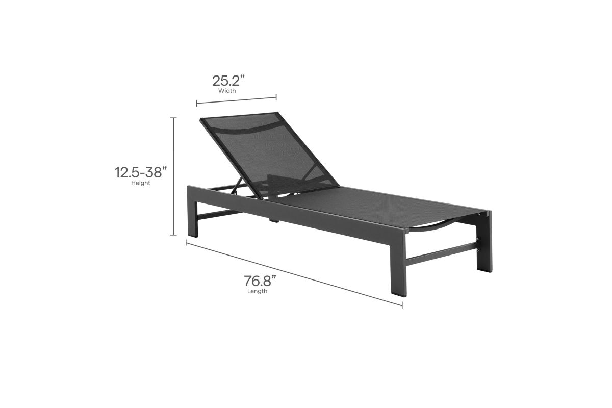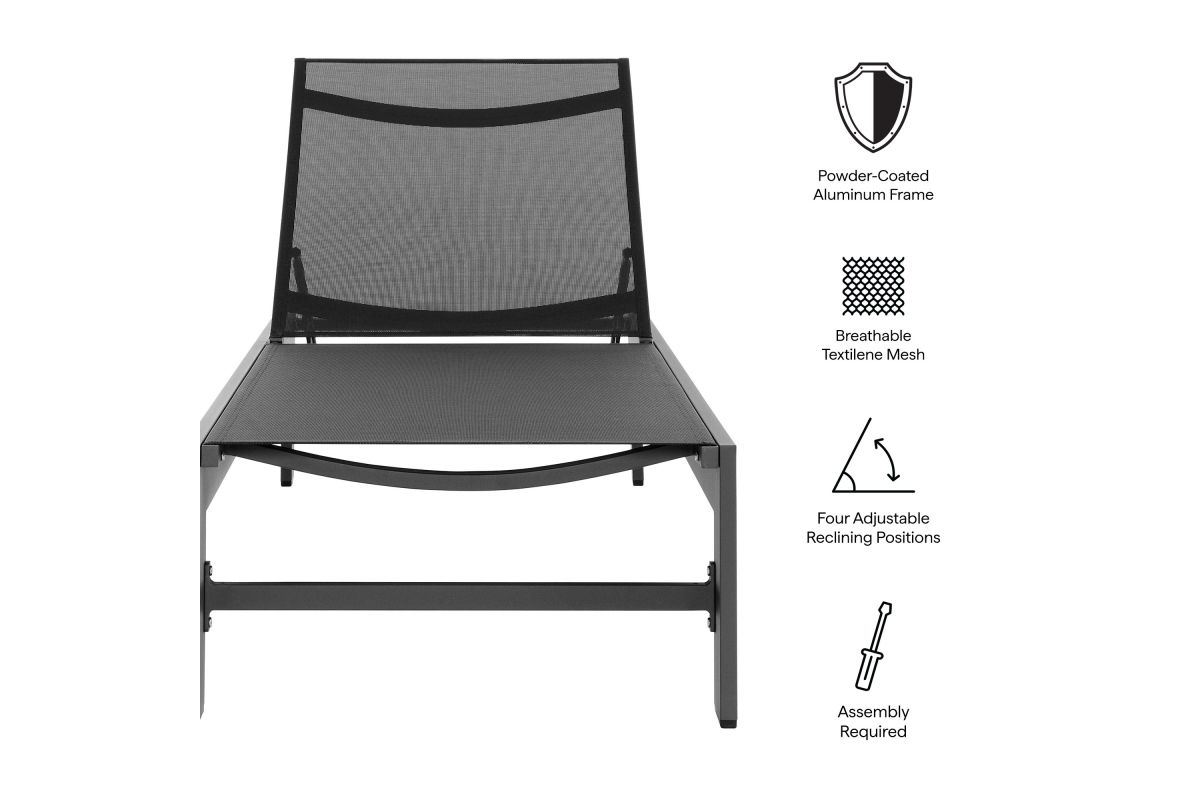 Enliven your outdoor retreat with the Tahoe Aluminum and Mesh Outdoor Chaise Lounge. This modern patio chaise combines contemporary elegance with durable functionality, perfect for any outdoor space. Built with a sturdy aluminum frame and finished with a smooth powder-coated surface, this chaise lounge offers both strength and style. The breathable, weather-resistant Textilene mesh seat and back provide comfort for hours of sunbathing or lounging by the pool. With four adjustable reclining positions, you can easily find your ideal angle, whether you prefer lounging flat or sitting up. The low-maintenance design ensures year-round use, while the non-marking foot glides protect your outdoor flooring. Easy to assemble, the Tahoe Chaise offers versatile and comfortable lounging, whether placed in your backyard, poolside, or patio. Weight Capacity: 300 lbs.