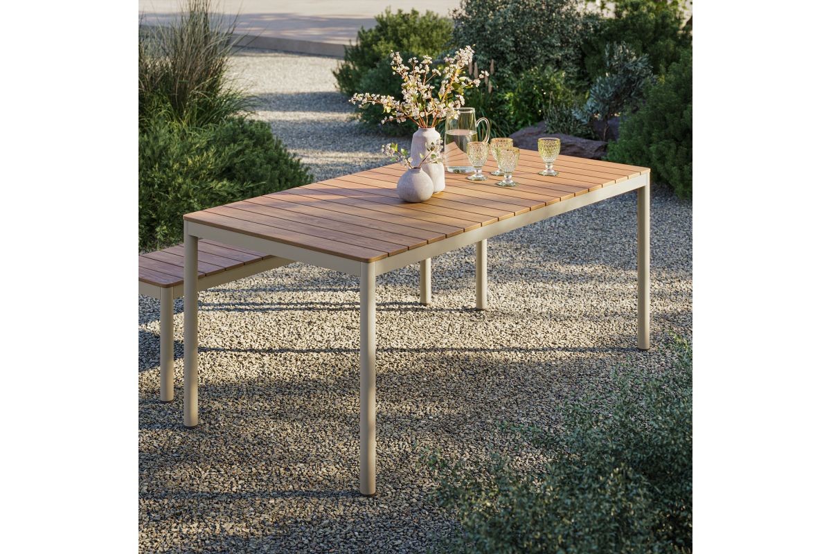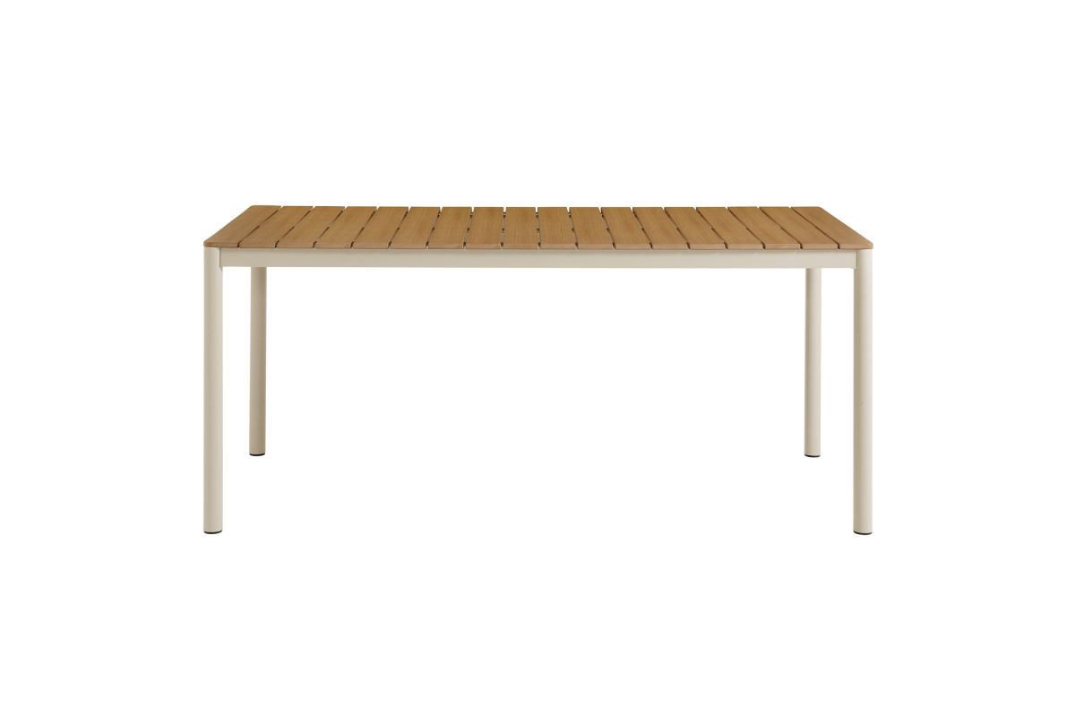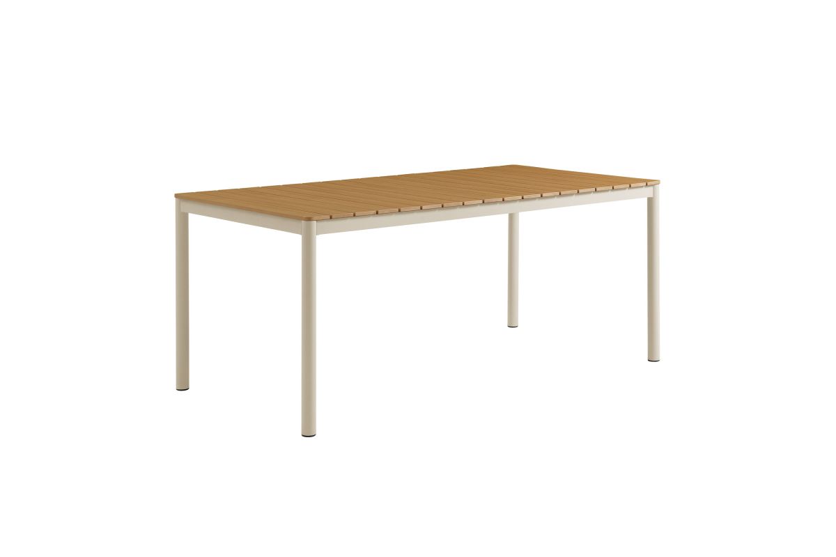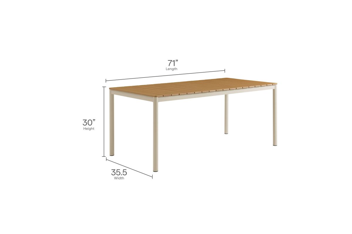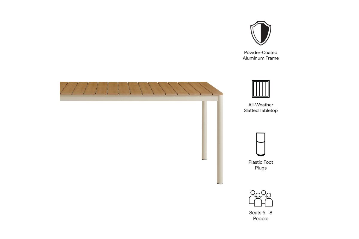 Dine in style with the Finn Outdoor Patio Dining Table. Constructed with a durable aluminum frame and a smooth composite plastic faux wood tabletop, this rectangular dining table offers both strength and modern appeal. The slatted design and rounded corners provide a practical look, making it ideal for outdoor dining or gatherings. Plastic foot plugs ensure stability on uneven surfaces, while the fixed size accommodates 6-8 people comfortably. The Finn all-weather dining table is easy to assemble and a fantastic addition to your outdoor furniture collection. Perfect for backyard dining, it combines durability and simplicity for everyday use. Weight Capacity: 199 lbs.