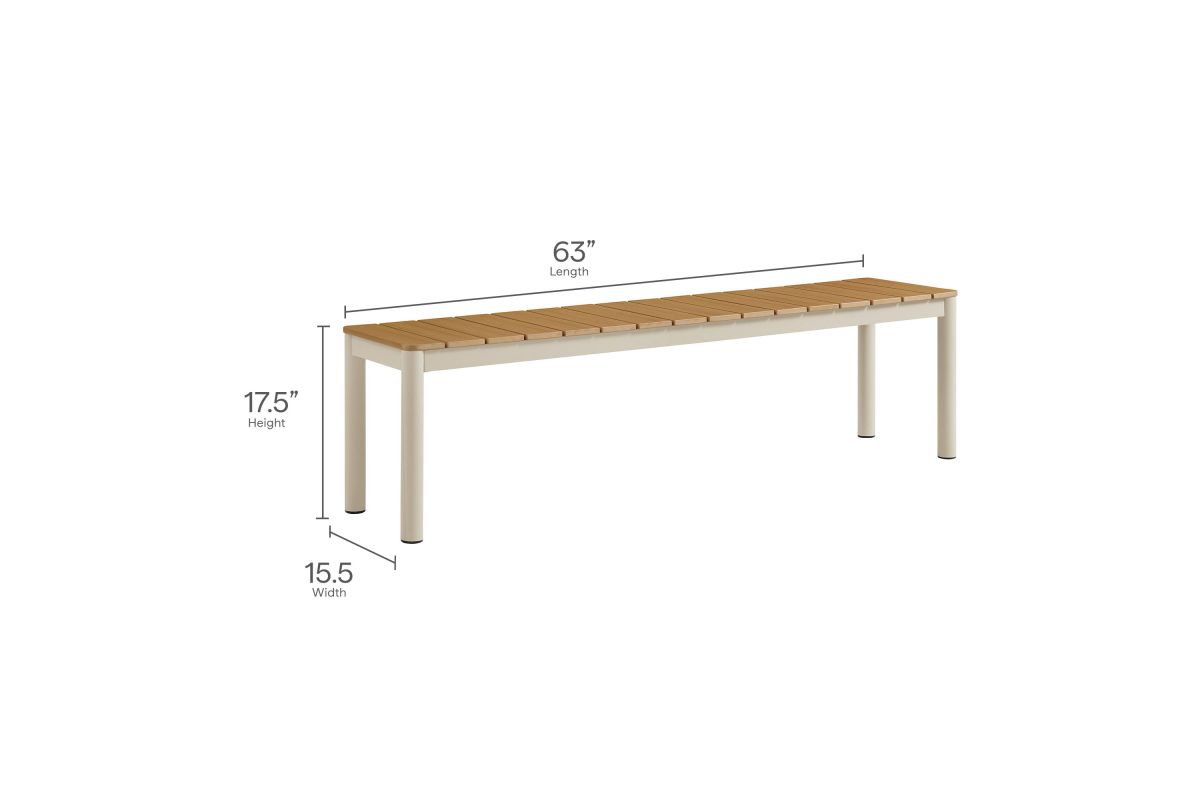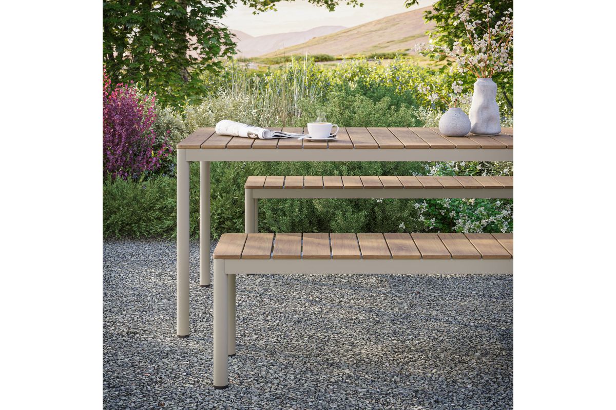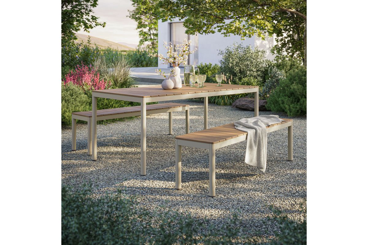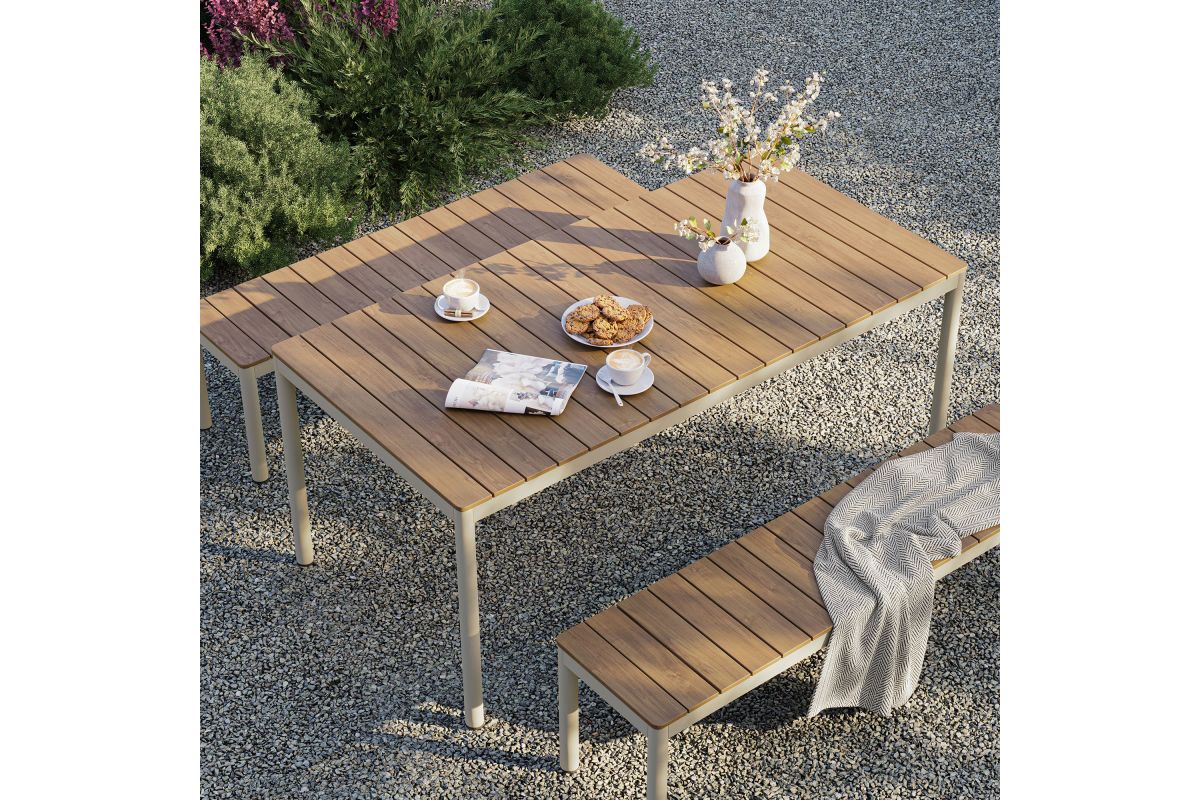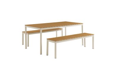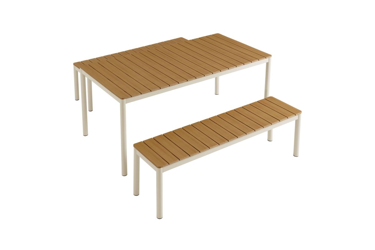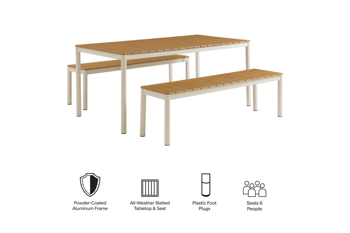 Dine in style with the Finn Outdoor Patio Dining Set. This 3-piece dining set includes a 71 inch dining table and two benches, all crafted with a durable aluminum frame and faux wood tops. The slatted design and rounded corners give both the table and benches a modern, practical look, perfect for outdoor gatherings. An all-weather design, the slatted tops are crafted from poly composite faux wood to withstand the seasons. Comfortably seating 6 people, this 3-piece picnic table set features plastic foot plugs for stability on uneven surfaces. Easy to assemble, the Finn Bench Dining Table Set is ideal for your backyard or patio, combining durability and simplicity for everyday use.