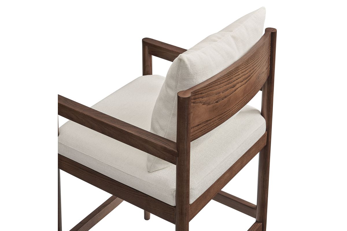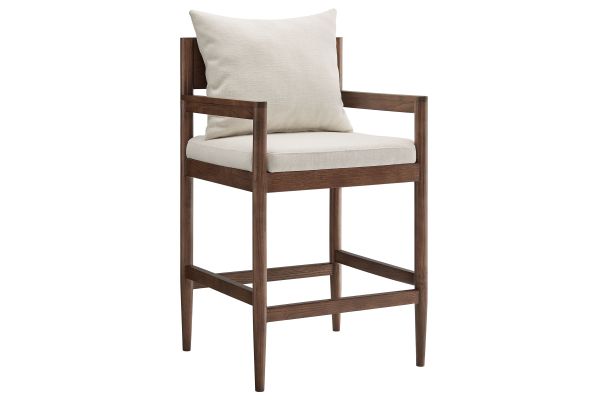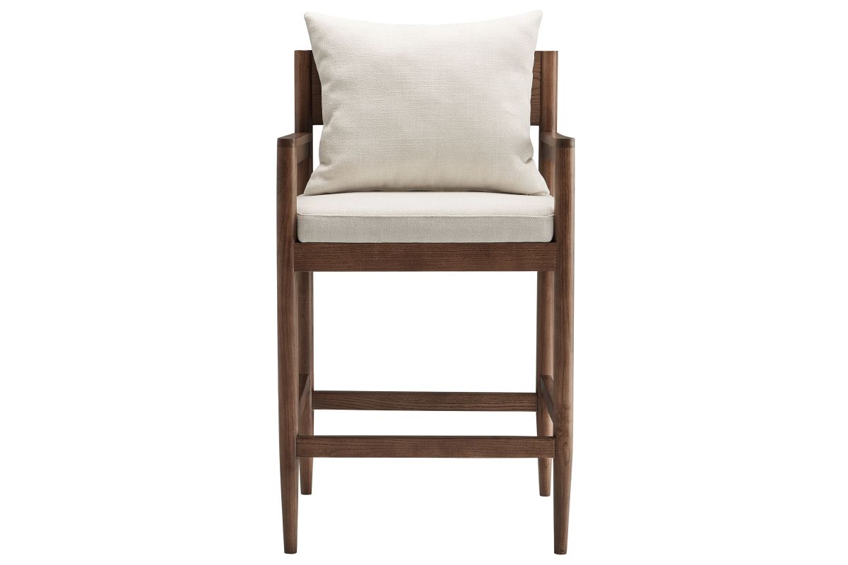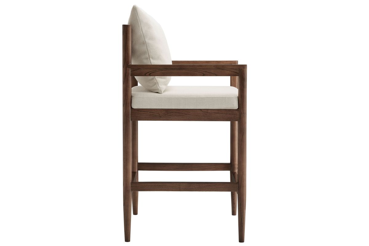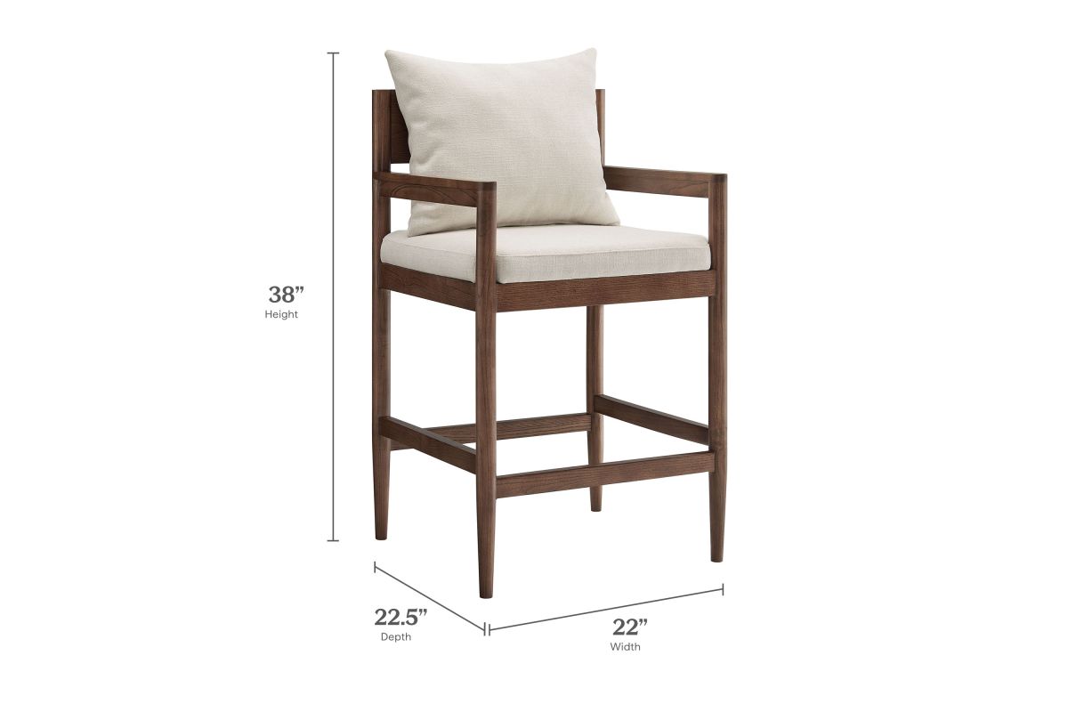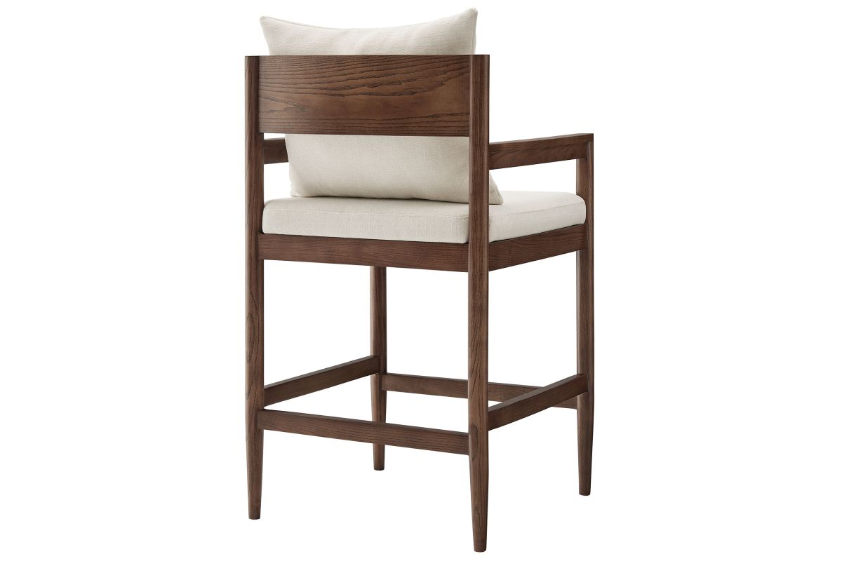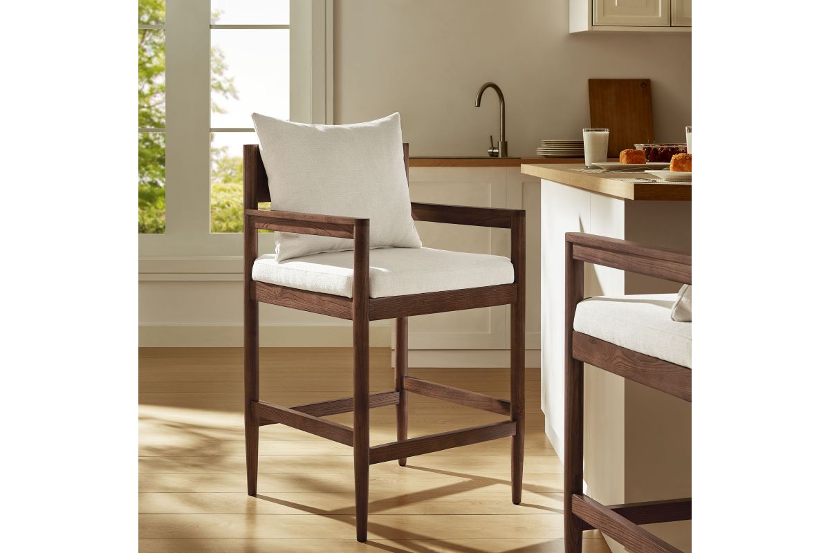 Blending modern elegance with modern comfort, the Remington Counter Stool offers a refined seating experience at your kitchen island or bar. This 26-inch counter height stool features a solid elm wood frame with a rich finish, showcasing clean lines, an open back, and integrated armrests. A foam-padded seat and removable back pillow are wrapped in textured slub weave fabric for a soft, supportive feel. Tapered legs bring a Scandinavian touch, with a built-in footrest ensure durability and stability. Non-marking foot glides protect floors are inlcuded. Whether styled at a kitchen counter, bar, or dining space, this modern counter height chair enhances any contemporary setting. Weight Capacity: 300 lbs.